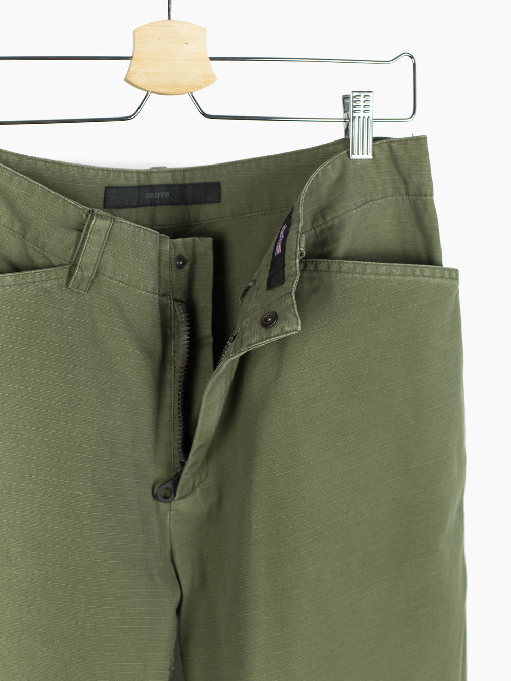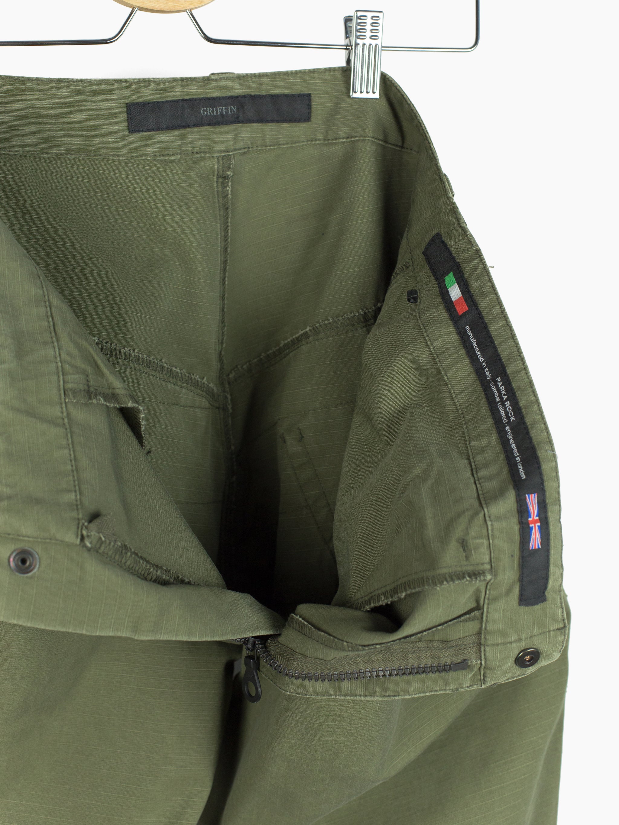 Finished with snap button waist closure with Riri zipper fly, golden Griffin embroidery on wearer's right back patch pocket.