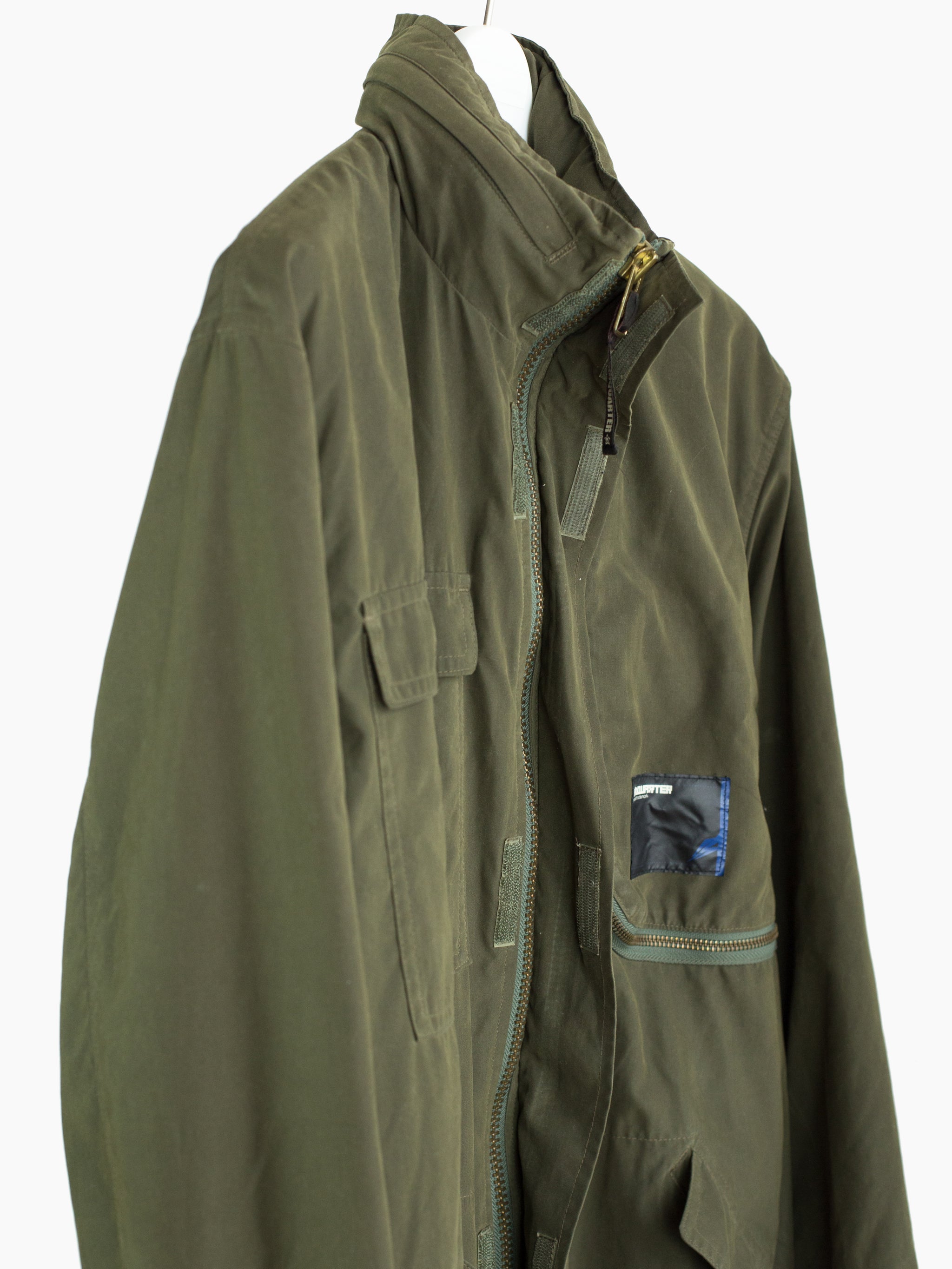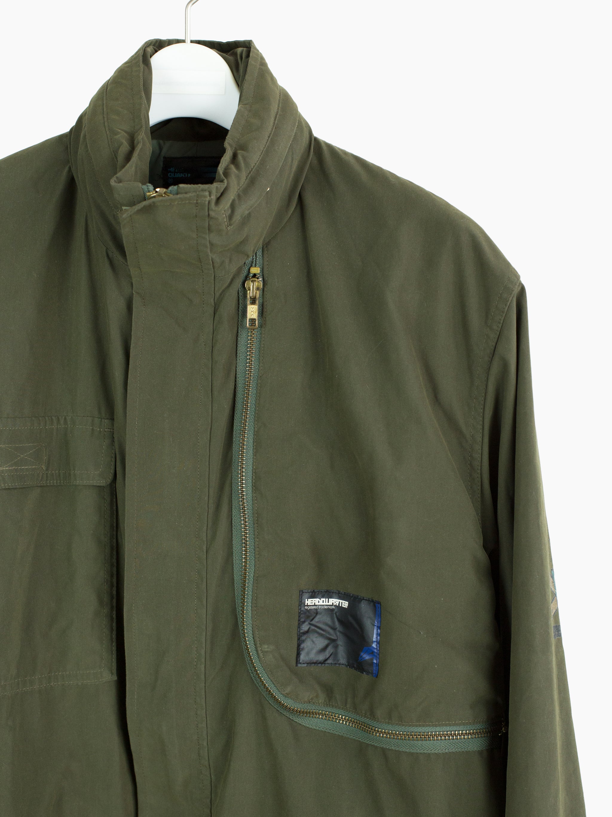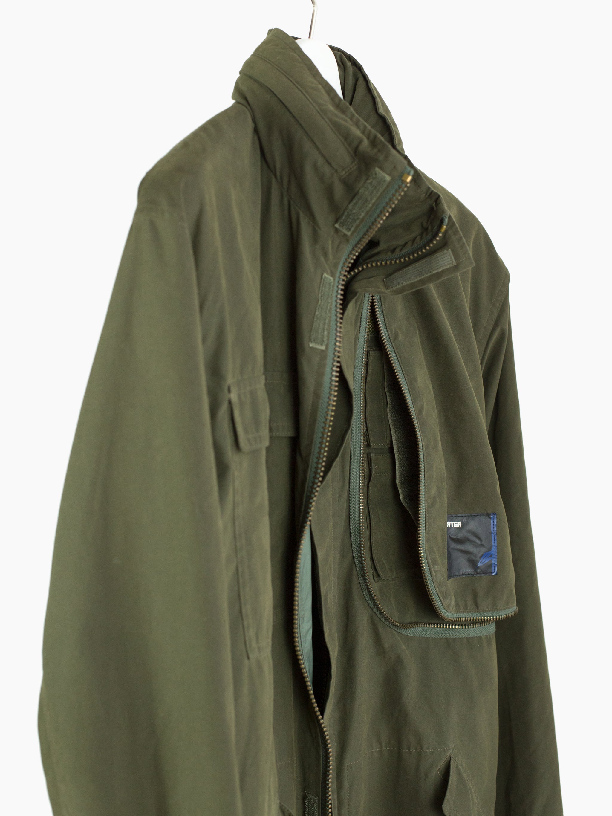 90s/2000s Japanese label Headquarter crafts utilitarian streetwear that's as sharp and design forward as it is wearable. This jacket is a twist on the traditional M65 field jacket, with the introduction of an asymmetrical curved-zipper openable pocket array at wearer's left chest. Inside are velcro-secured gusseted patch pockets and a side-entry mesh lining pocket spanning the whole outer panel for multiple storage options. Its double zipper opening allows for horizontal entry and lighting-fast vertical drop retrieval. All cut in a beautifully light and supple polyester/nylon blend that has the soft hand and luster of a fine cotton.