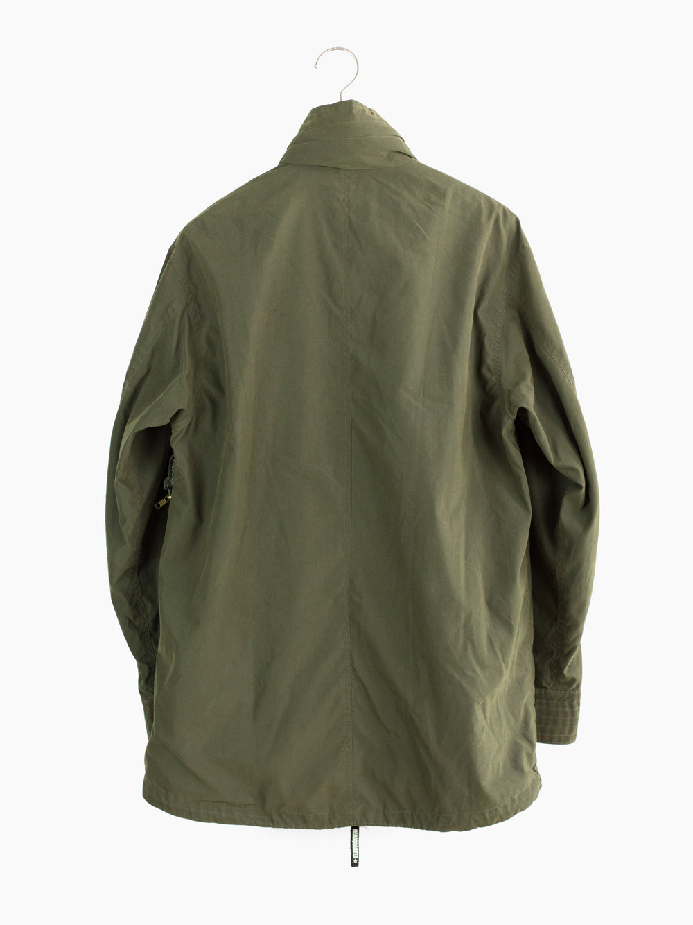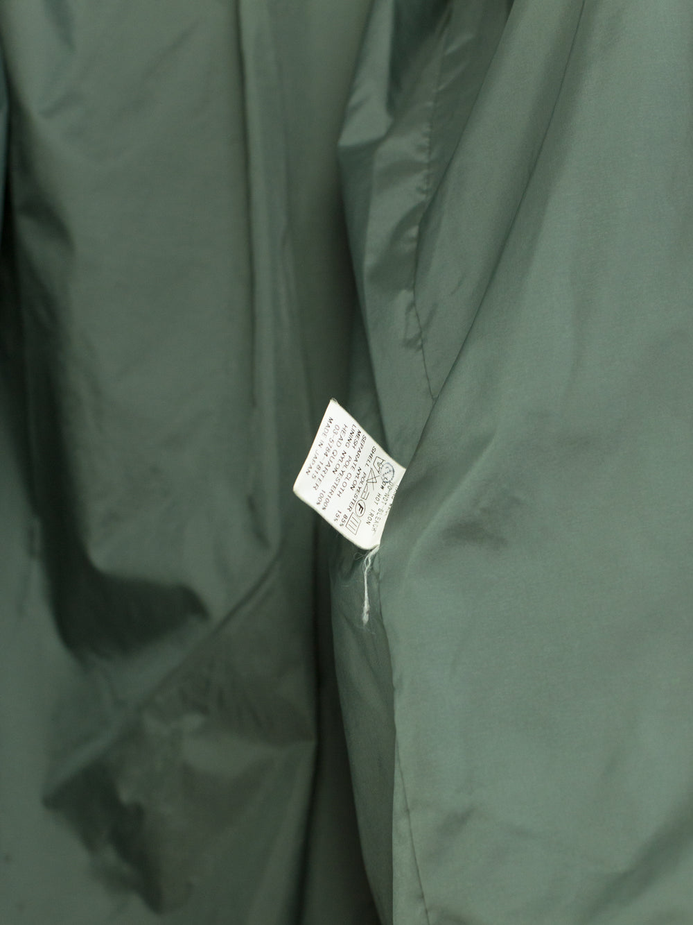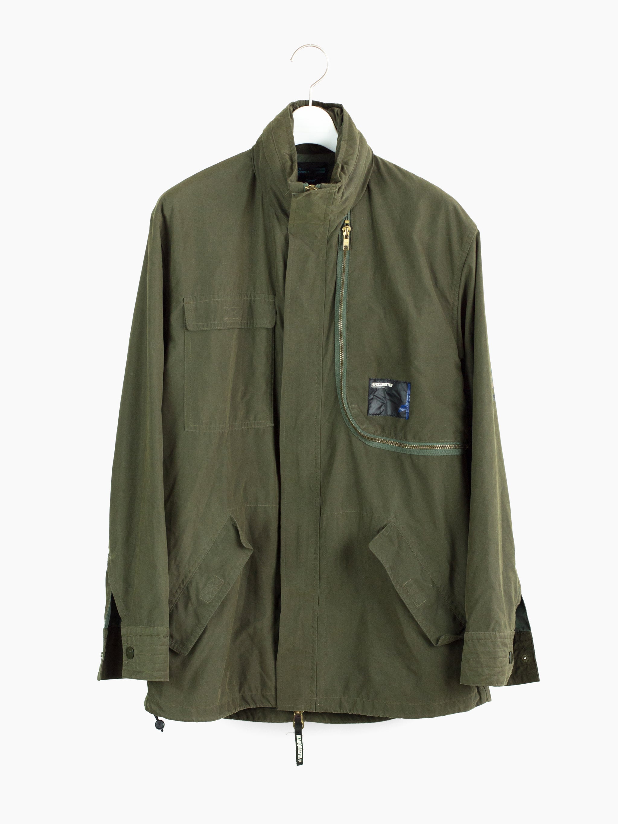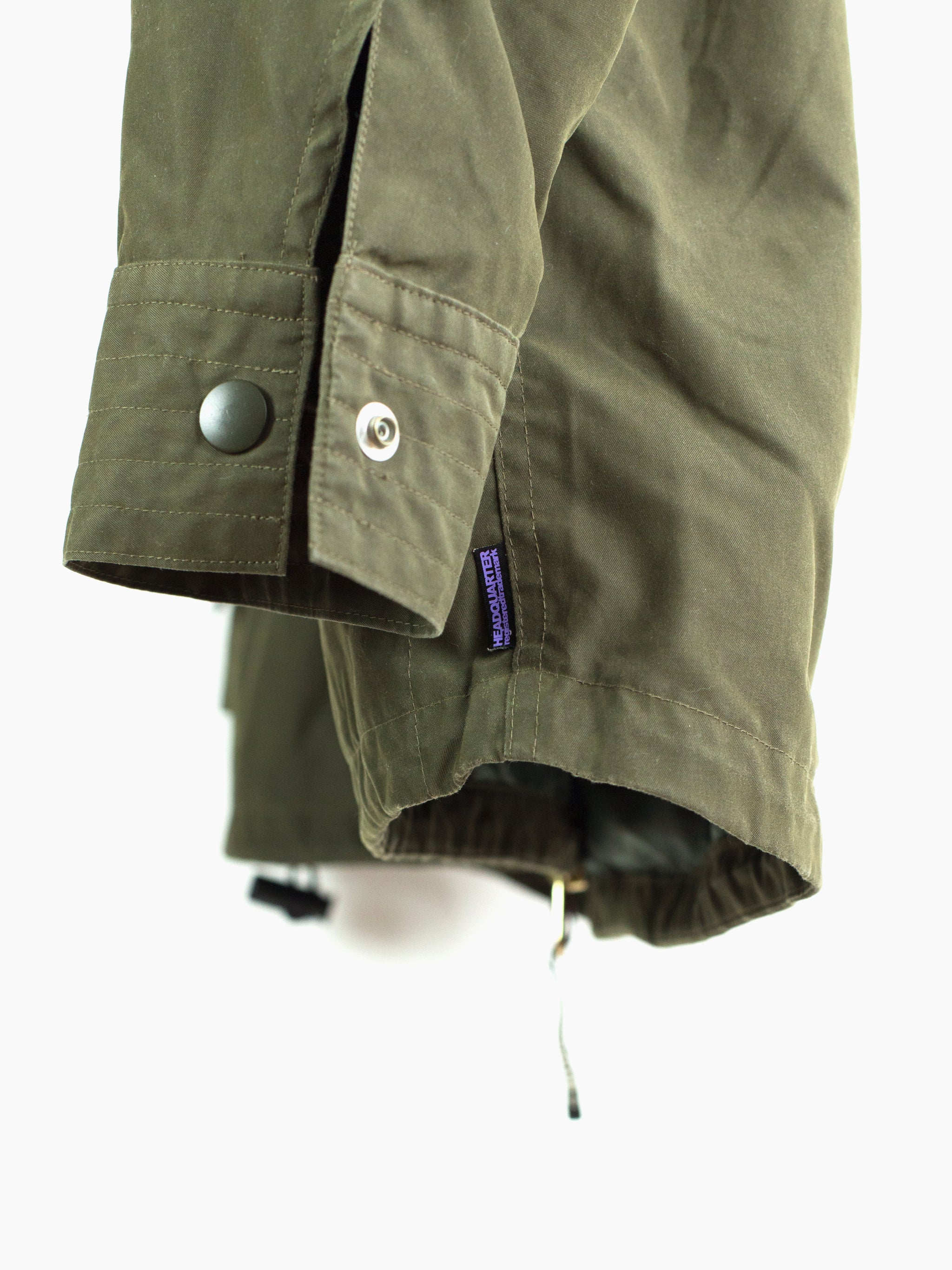 90s/2000s Japanese label Headquarter crafts utilitarian streetwear that's as sharp and design forward as it is wearable. This jacket is a twist on the traditional M65 field jacket, with the introduction of an asymmetrical curved-zipper openable pocket array at wearer's left chest. Inside are velcro-secured gusseted patch pockets and a side-entry mesh lining pocket spanning the whole outer panel for multiple storage options. Its double zipper opening allows for horizontal entry and lighting-fast vertical drop retrieval. All cut in a beautifully light and supple polyester/nylon blend that has the soft hand and luster of a fine cotton.