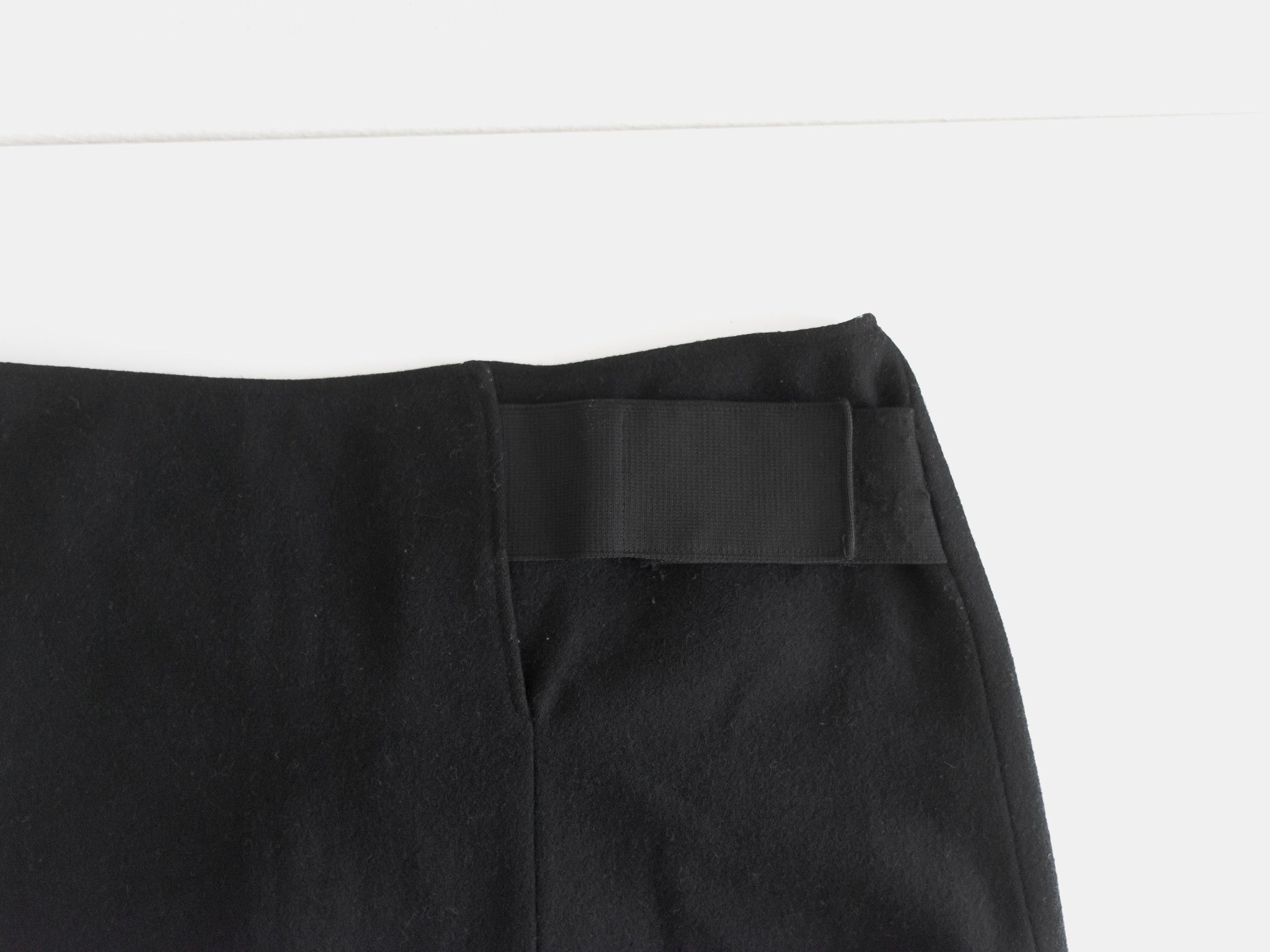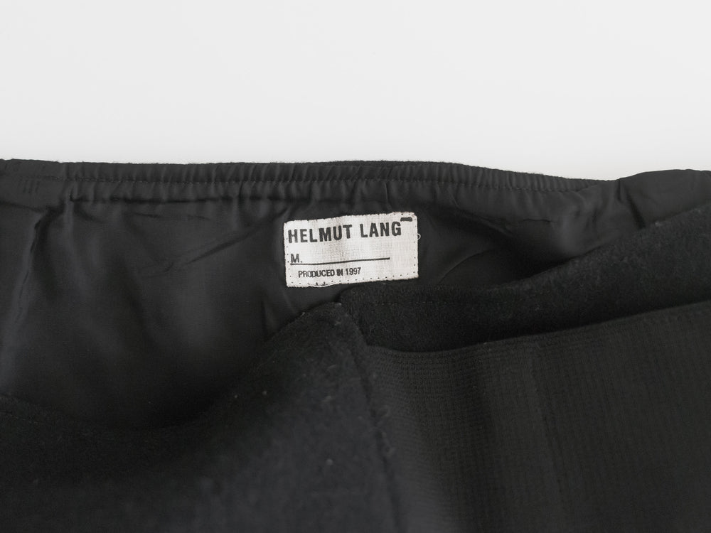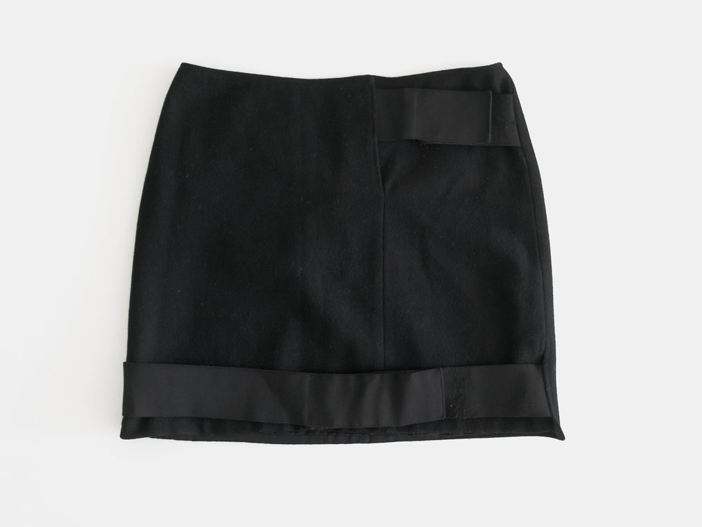 Skirt from 1997, during Helmut Lang's rise to legendary influential status. The skirt features a minimalistic design with a small side slit and subtle adjustable elastic straps, a precursor to his famous and extensive use of bondage strap details. 7/10 condition, pilling on the surface as shown. Made in Italy. 100% nylon.
