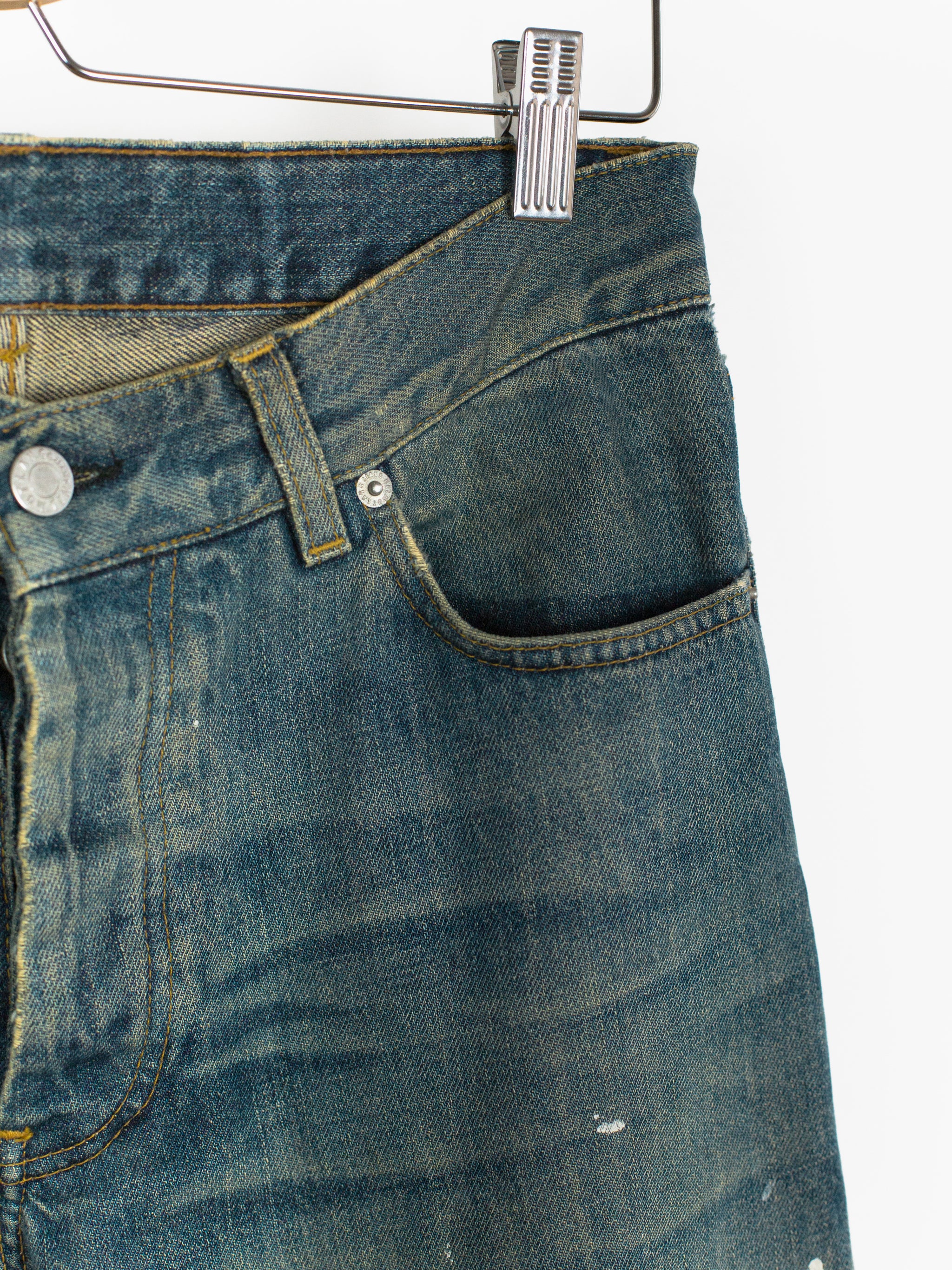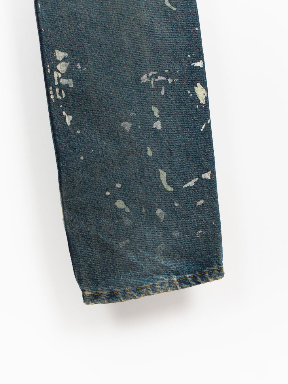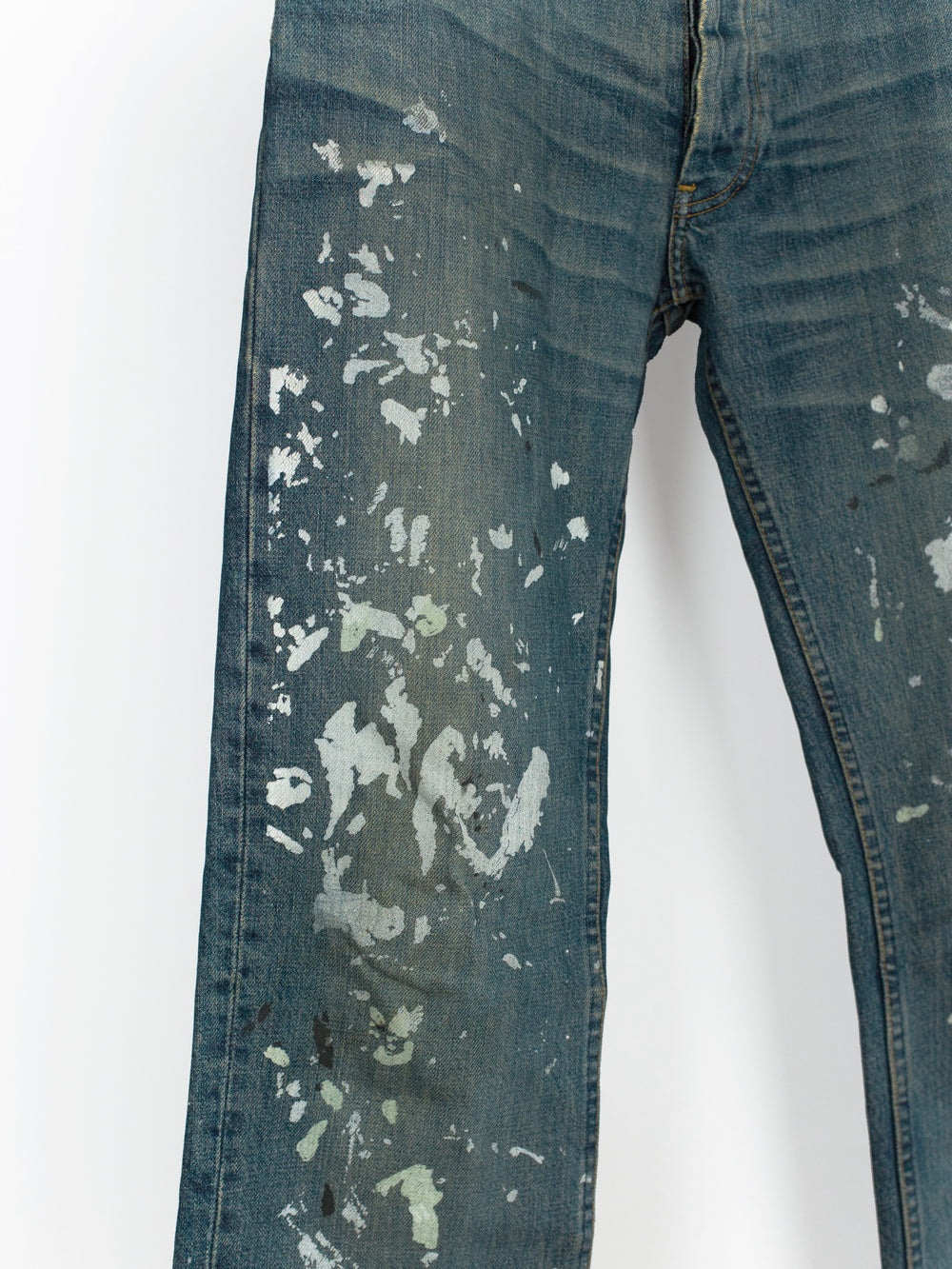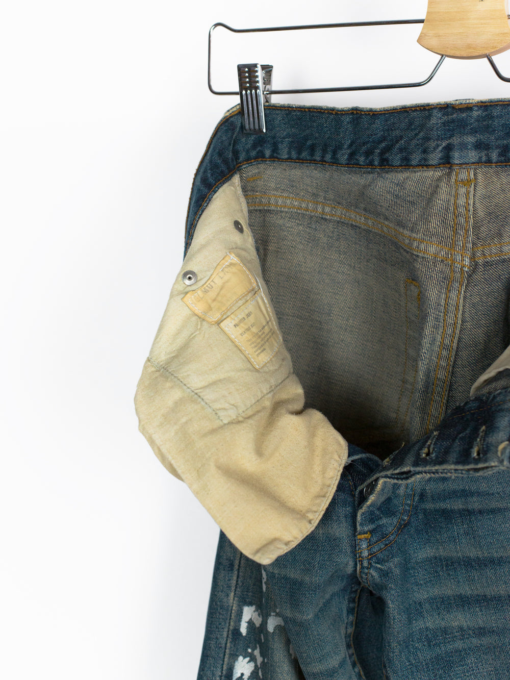 Iconic painter denim from 1998. These have not been altered as far as we can tell and they are in impeccable condition. No rips or tears in the fabric besides some fraying at the hem and pocket openings. Seat and knees have softened with wear, could use some reinforcing but there is no damage yet. Amazing warm beige tones with the addition of natural fading through wear. The screenprinted paint marks are all present and have faded slightly to be more subdued and natural looking.