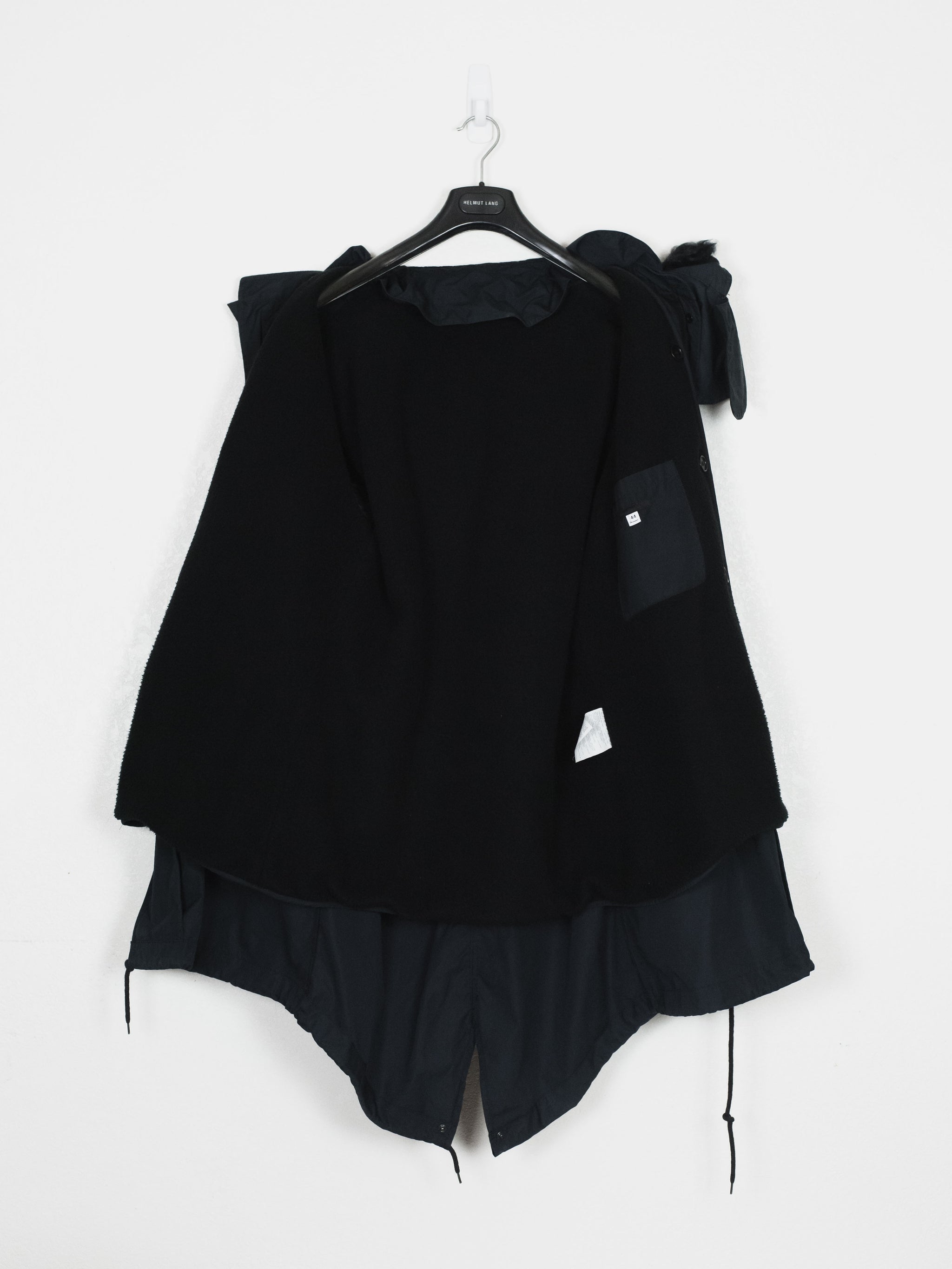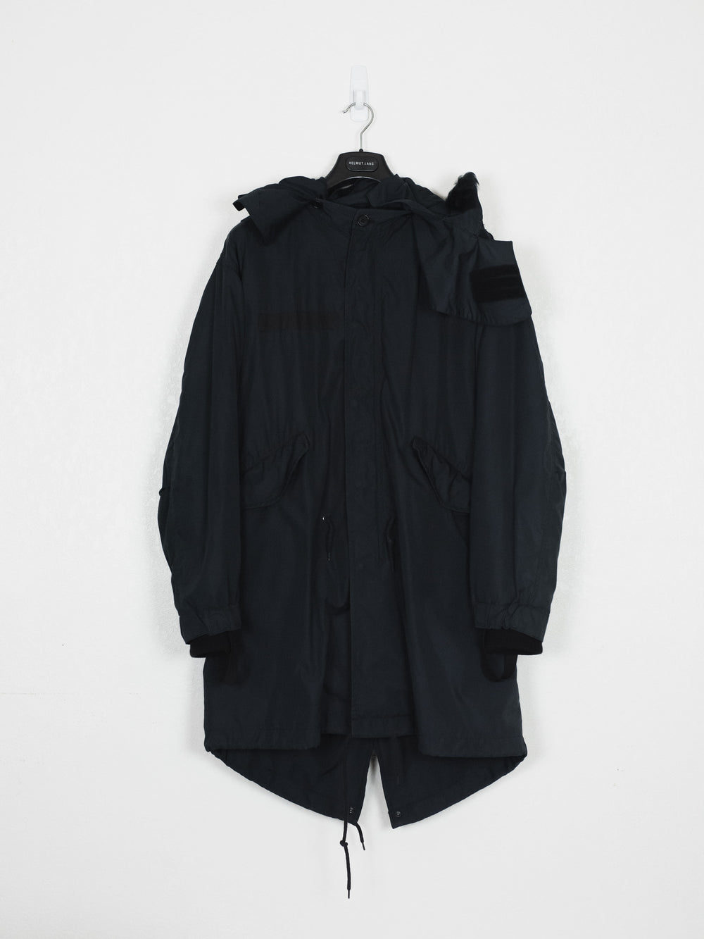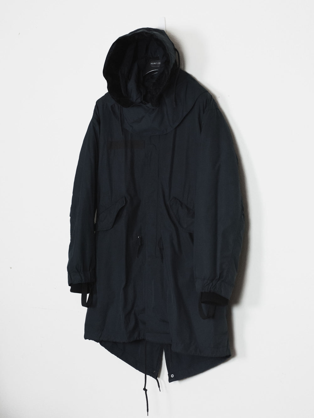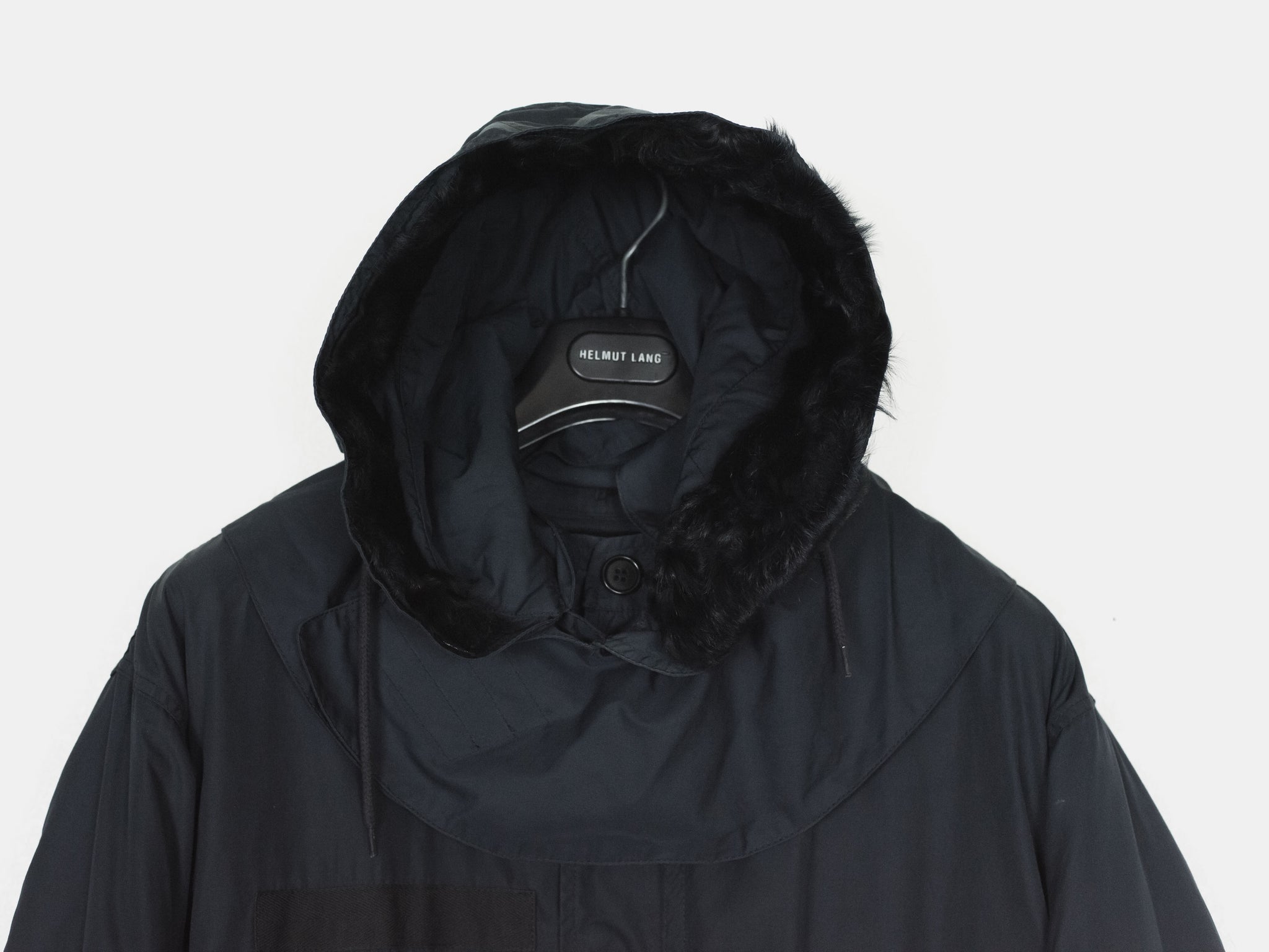 Perhaps one of Helmut Lang's most iconic yet understated silhouettes, his fishtail parka is one of the best homages and love letters to military garments there is. This version holds nothing back in elevating the derived parka, utilizing an extremely luxurious and smooth midnight cotton face fabric with a removable plush fleece liner and a removable goat fur hood liner adding structure and weight. The lining is finished off with cupro sleeves and a beautiful elastic cuff adorned with bondage strap motifs.