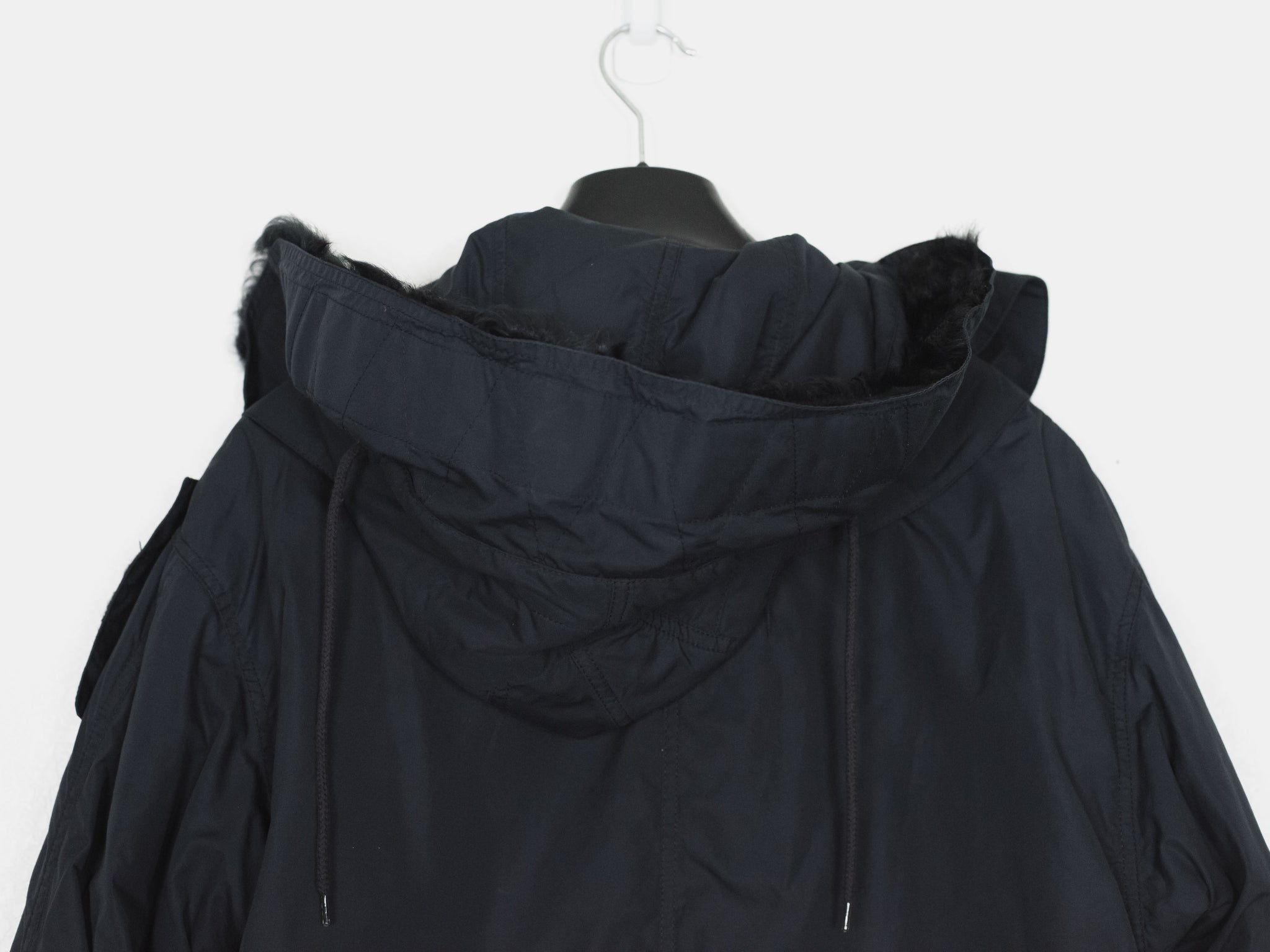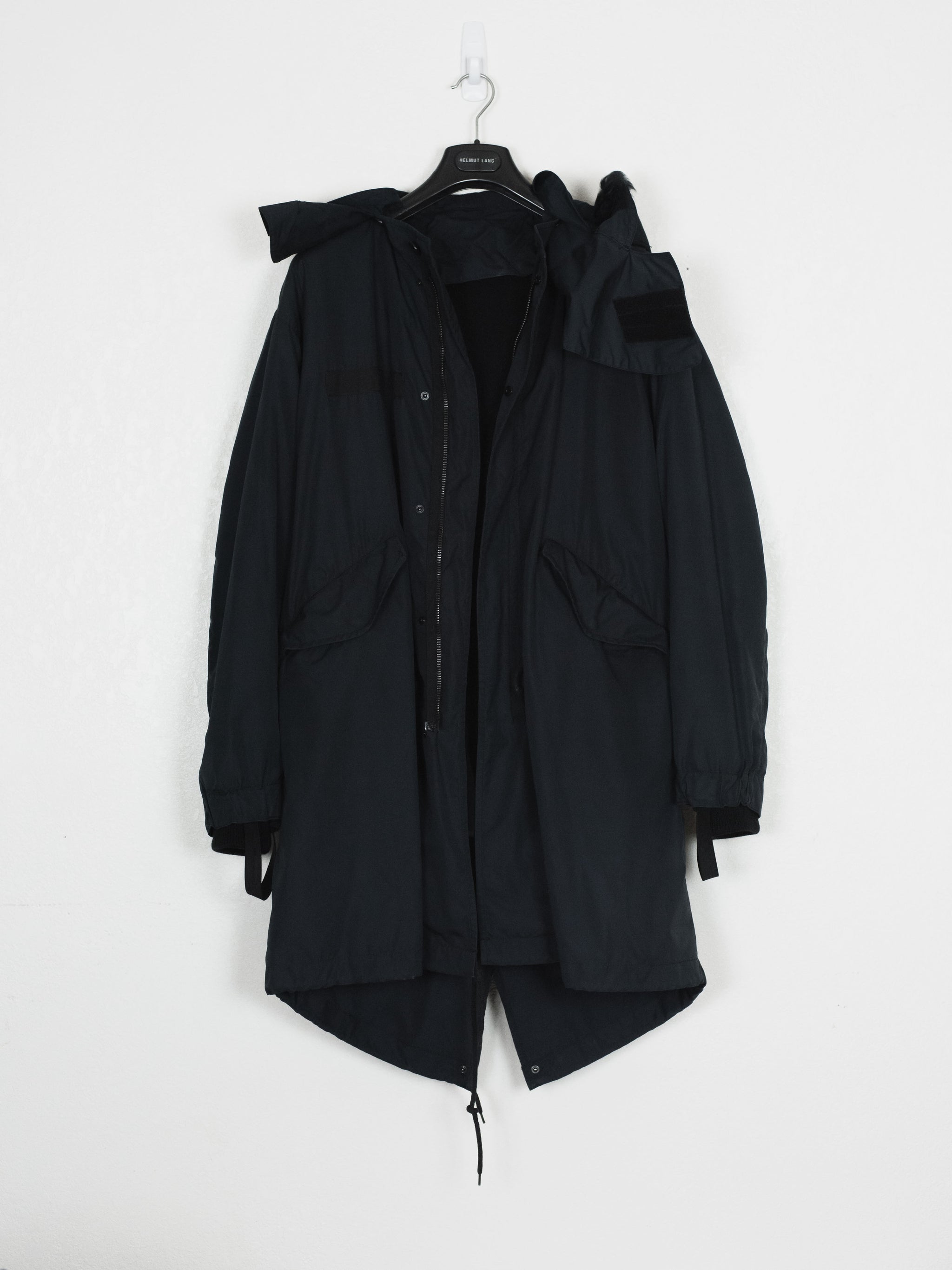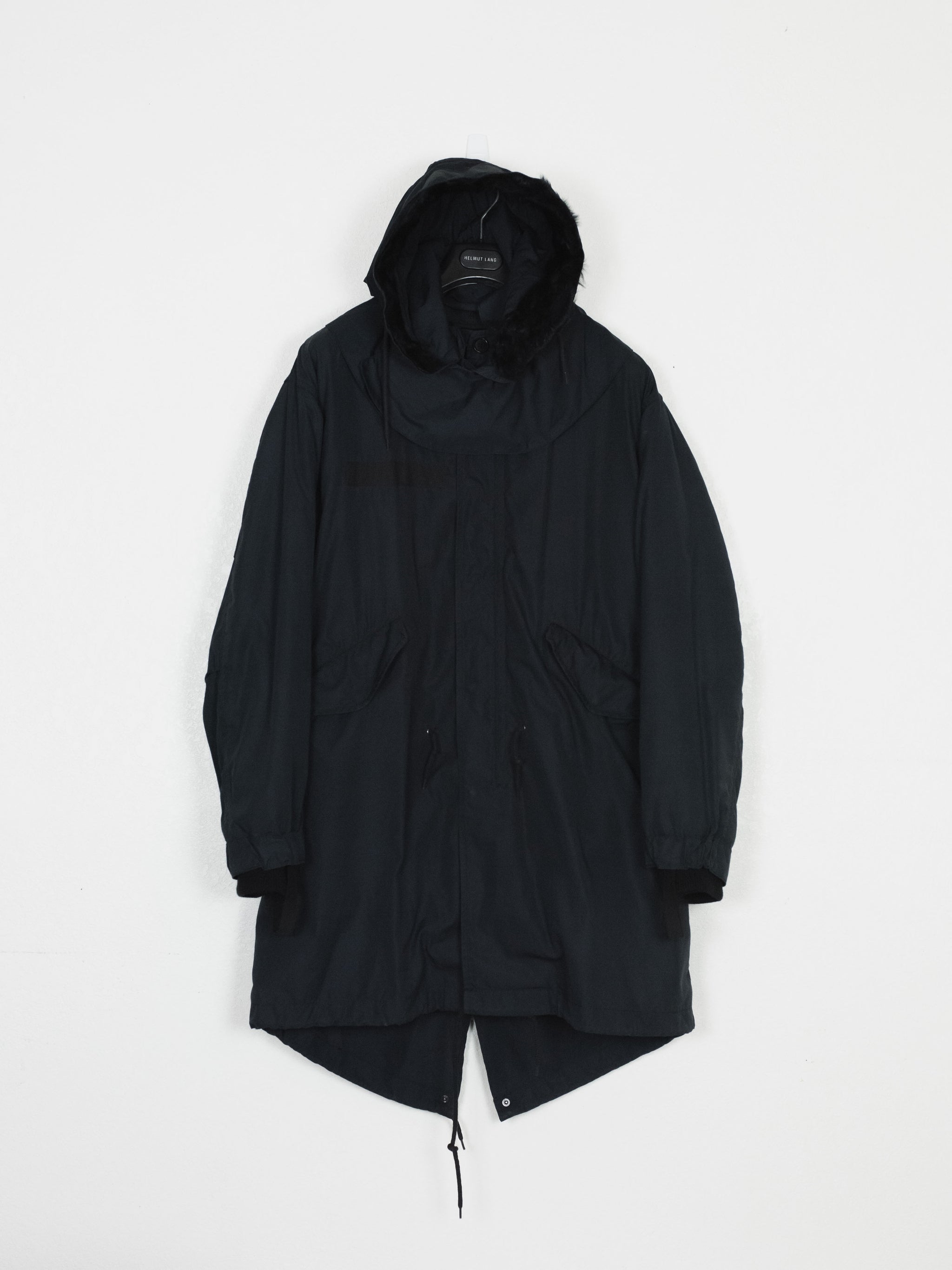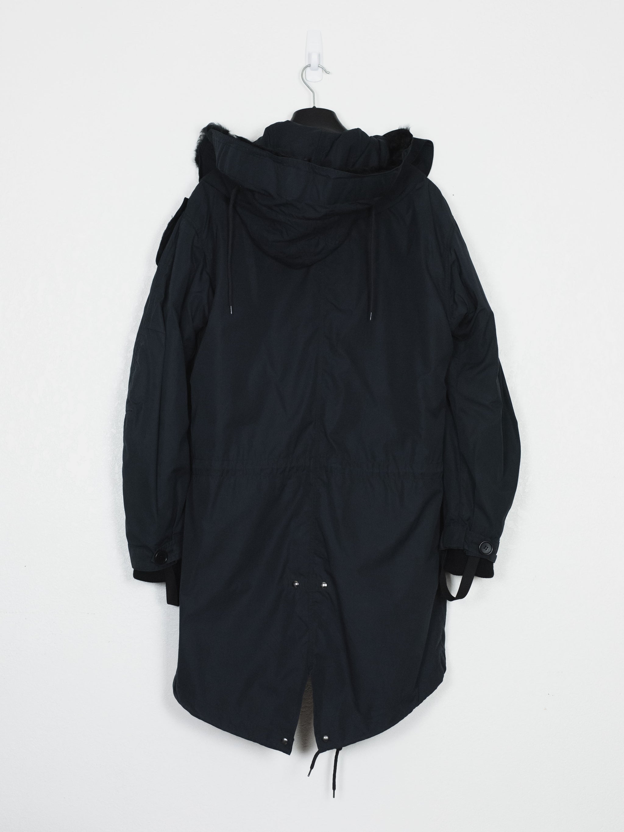 Perhaps one of Helmut Lang's most iconic yet understated silhouettes, his fishtail parka is one of the best homages and love letters to military garments there is. This version holds nothing back in elevating the derived parka, utilizing an extremely luxurious and smooth midnight cotton face fabric with a removable plush fleece liner and a removable goat fur hood liner adding structure and weight. The lining is finished off with cupro sleeves and a beautiful elastic cuff adorned with bondage strap motifs.