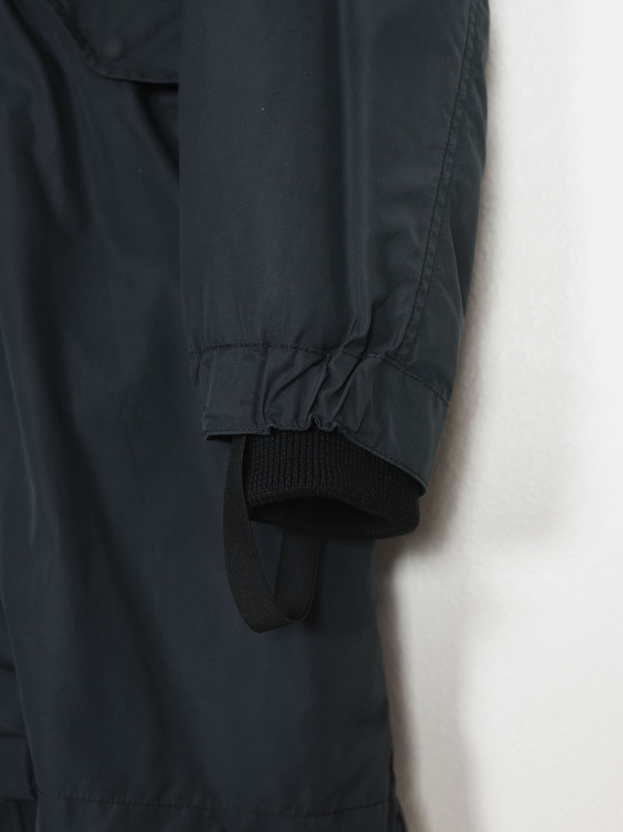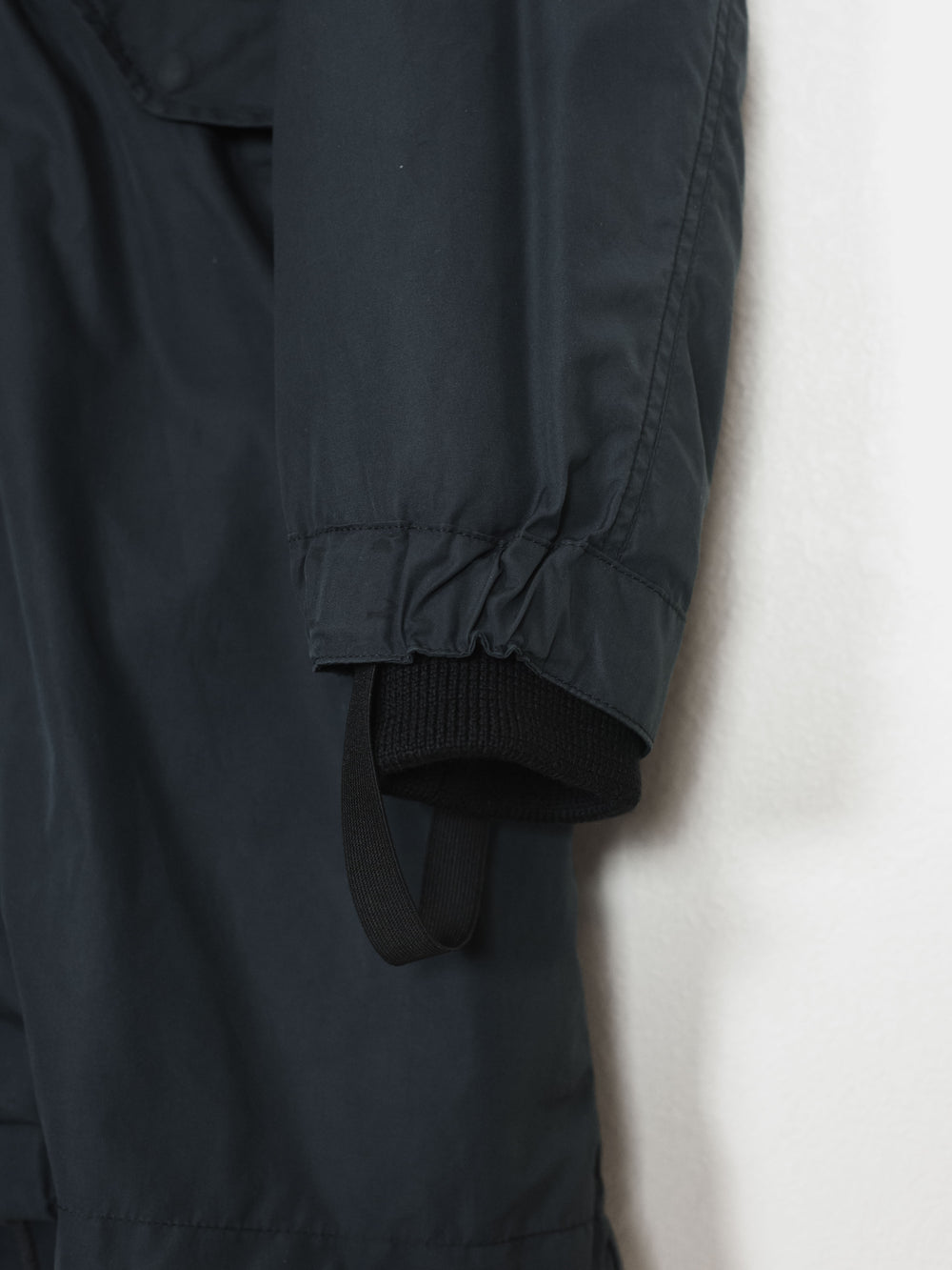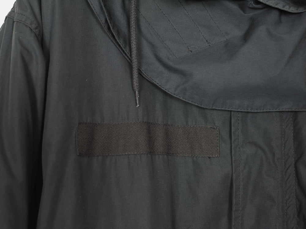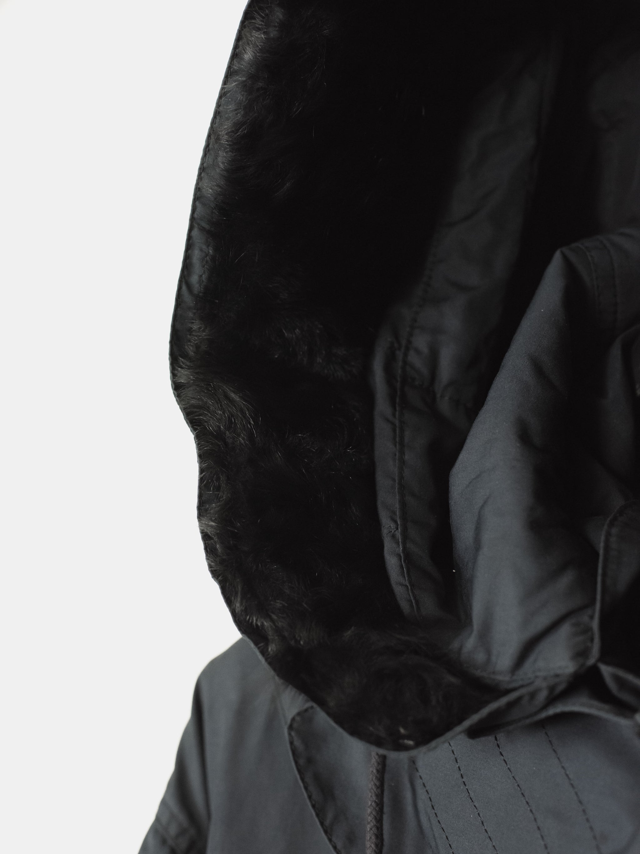 Perhaps one of Helmut Lang's most iconic yet understated silhouettes, his fishtail parka is one of the best homages and love letters to military garments there is. This version holds nothing back in elevating the derived parka, utilizing an extremely luxurious and smooth midnight cotton face fabric with a removable plush fleece liner and a removable goat fur hood liner adding structure and weight. The lining is finished off with cupro sleeves and a beautiful elastic cuff adorned with bondage strap motifs.