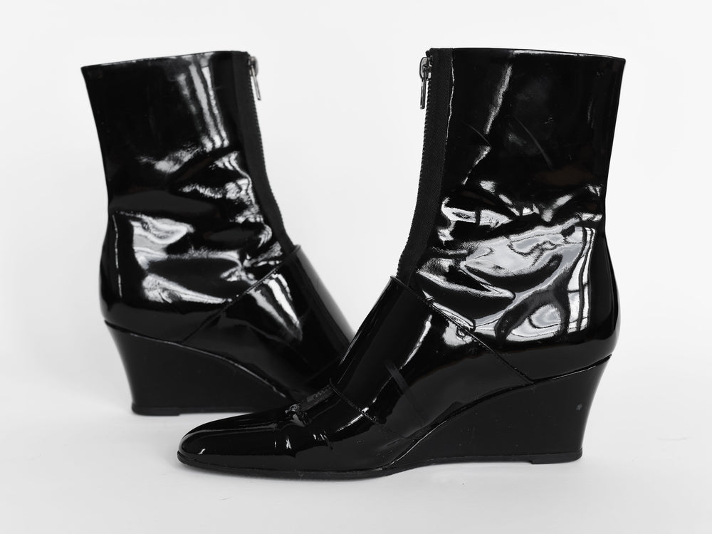 These are beautiful patent leather wedge boots with military buckle motifs, reframing the traditional military boot with a feminine silhouette.