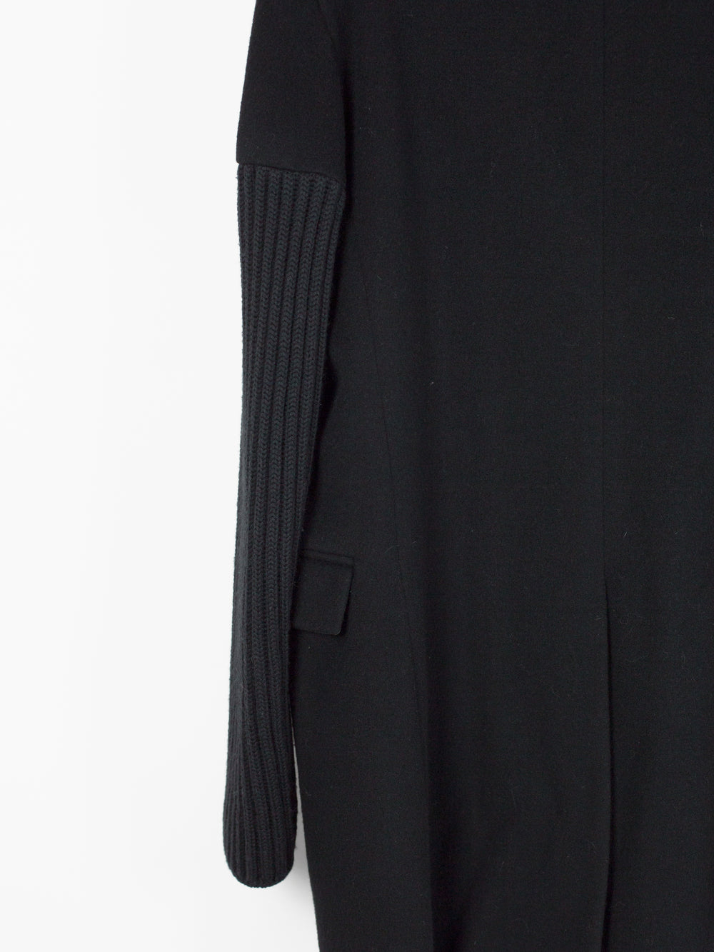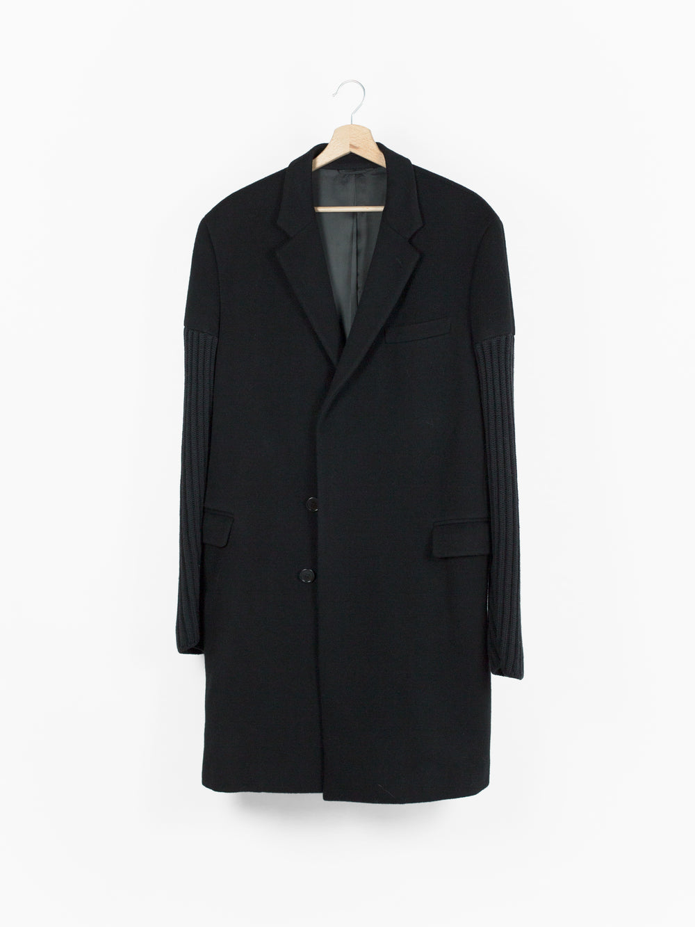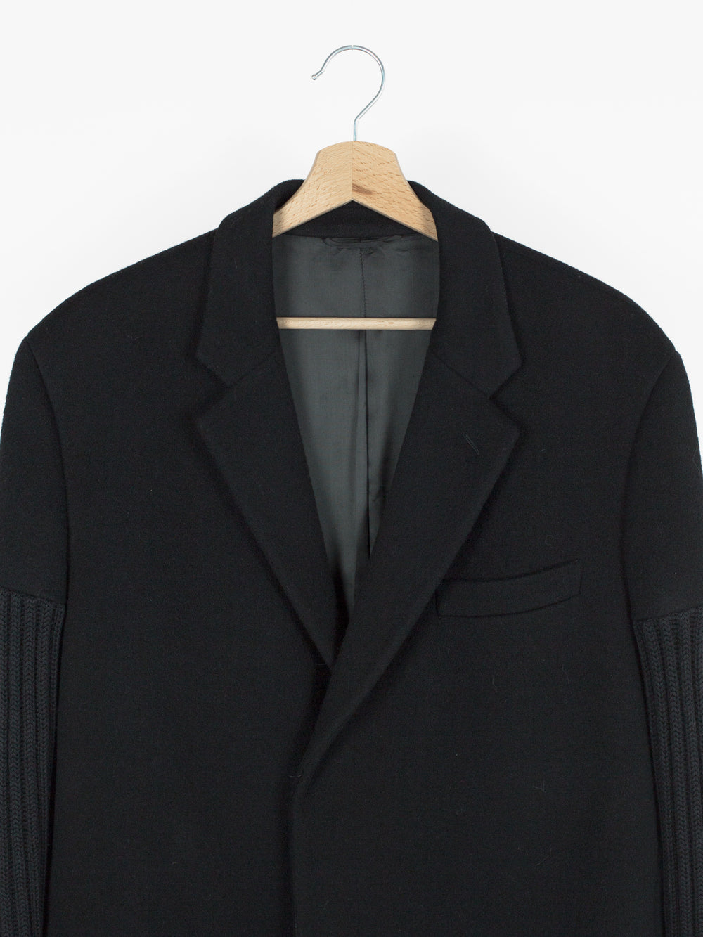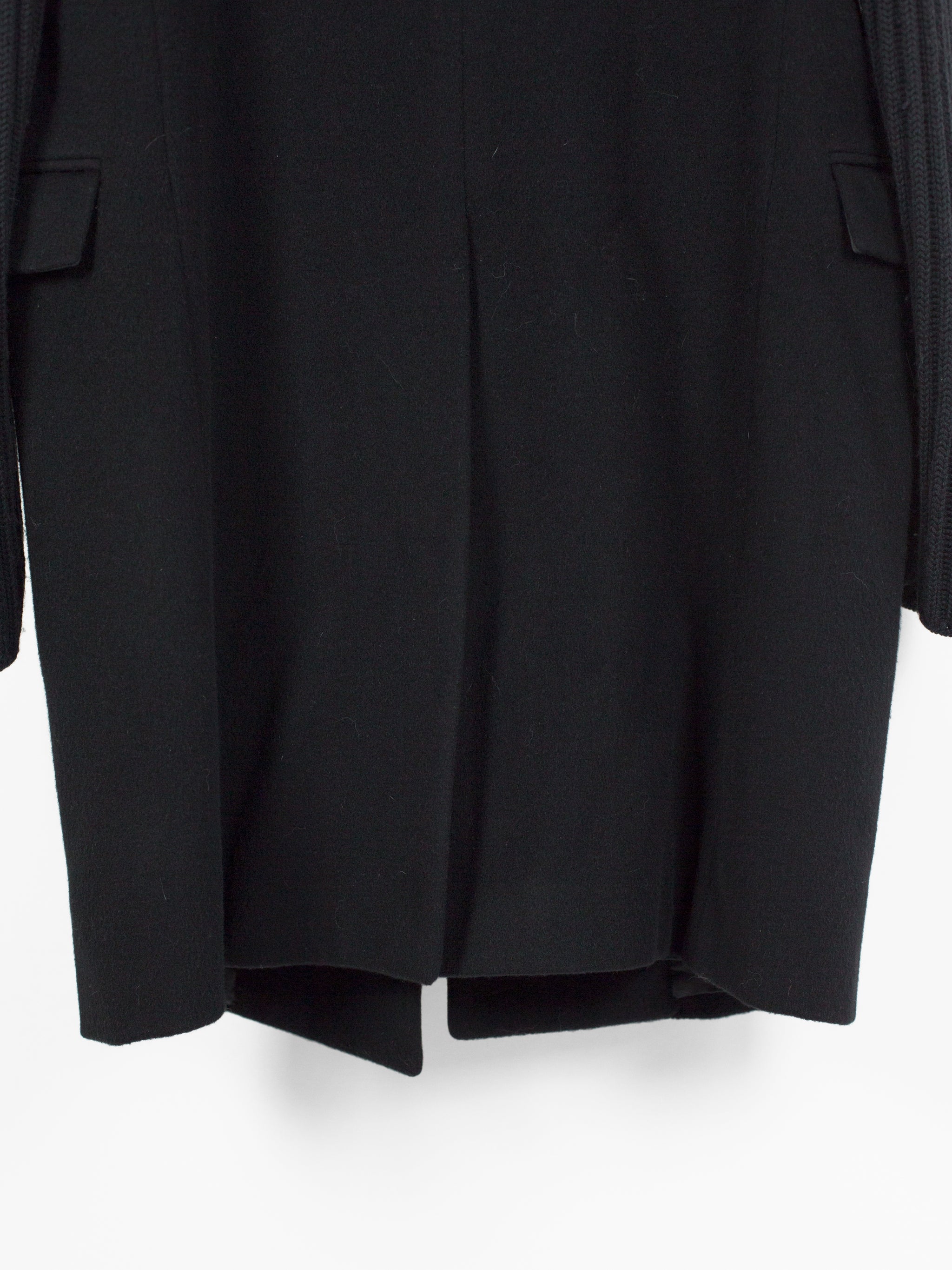 Featured in multiple runway shows across many years, the chester coat shape that forms the foundation of this piece is a staple within Helmut's repertoire. With subtlely structured shoulders and a slightly tailored waist, it has a subdued elegance and cleanliness that give it an air of timelessness (or as close to timeless as one can get). Rendered in a thick, plush cashmere/wool face fabric, the coat hangs off the shoulders with a weighty, fluid drape. At the upper arm, a statement chunky knit sleeve is inserted in place of a tailored one, creating a compelling play on proportions and an unexpected, subversive, layered look. The shape matches many of the composite layered ensembles shown in AW03--harnesses with a strap at the bicep, sleeve caps ending right under the shoulder, or knit armwarmer sleeves pulled up to below the armpit. While the AW03 runway reads more utilitarian and military inspired with its iconic aviator chaps, bombers, and fleece/3M reflective fabrics, this piece leans formal and versatile. It can be worn with other tailored garments or styled with military and workwear pieces for some tension in the mixed formalities.