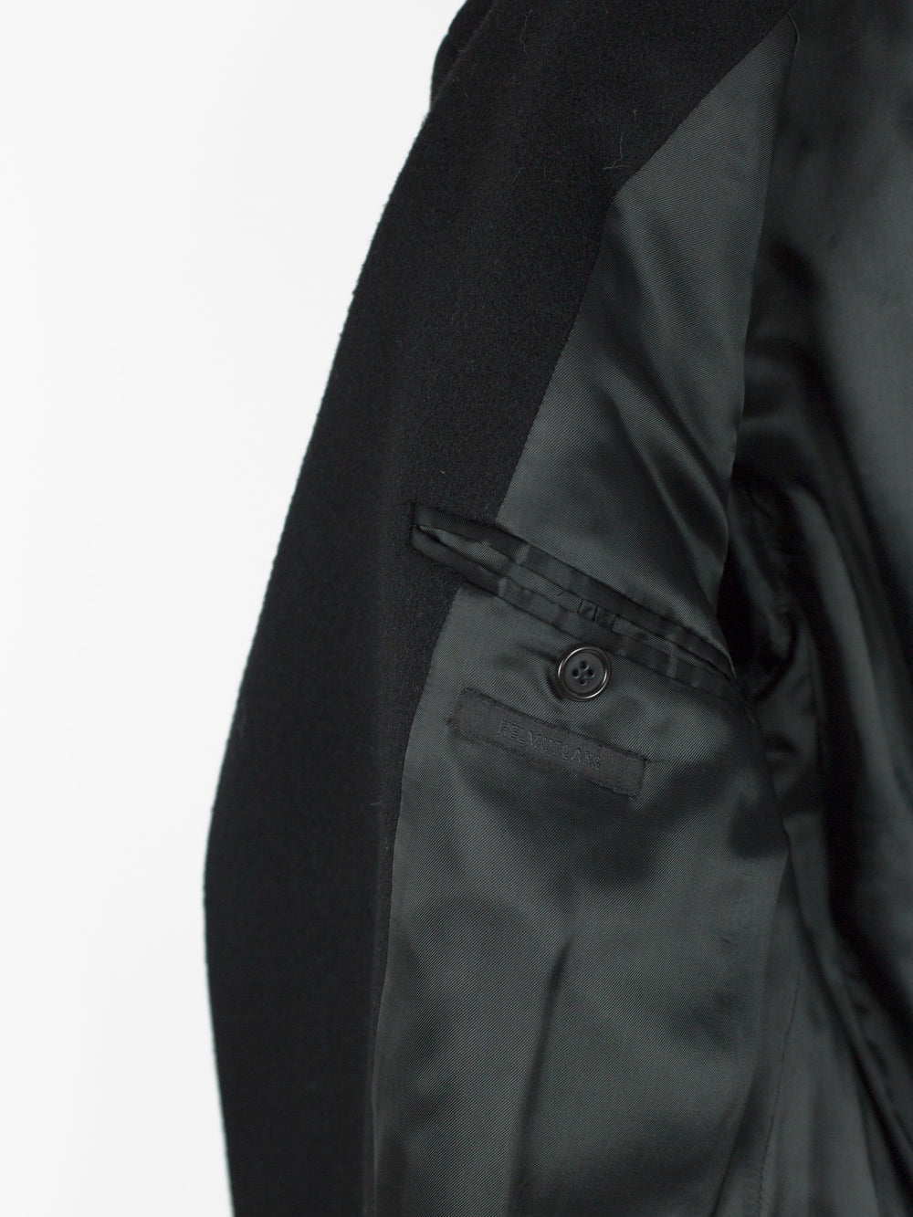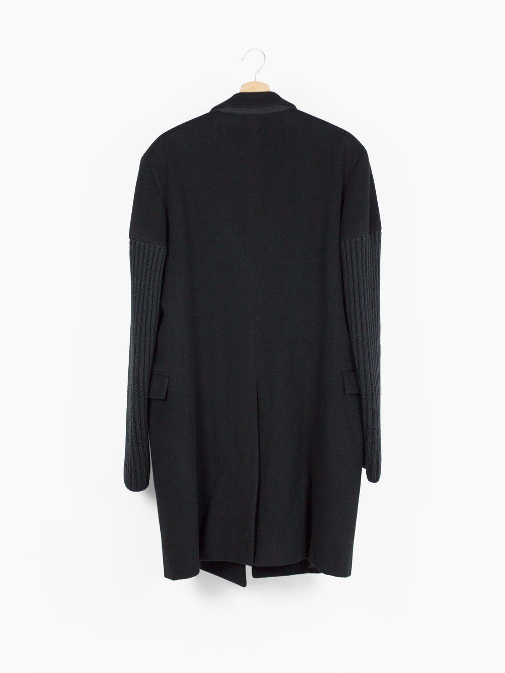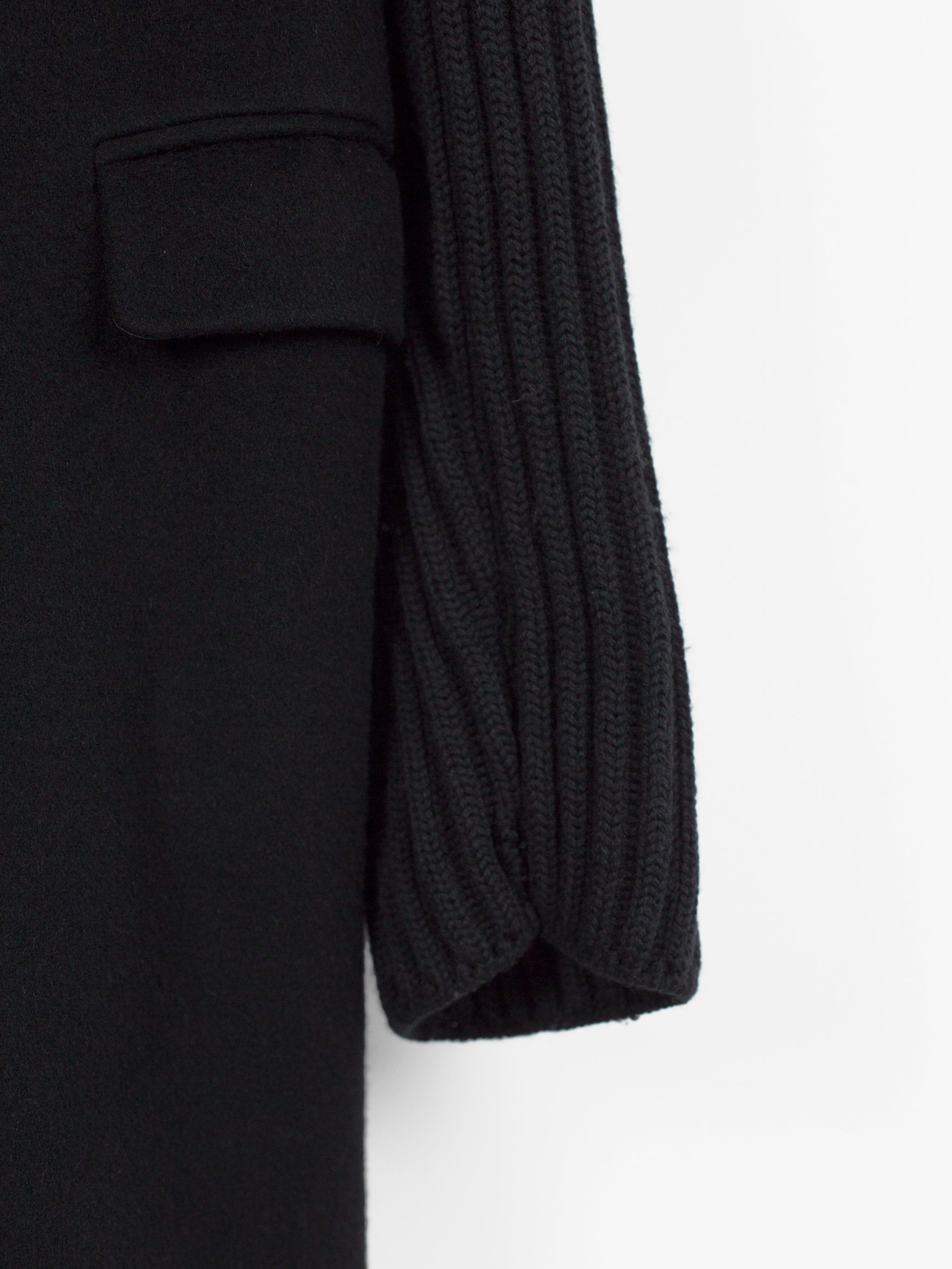Featured in multiple runway shows across many years, the chester coat shape that forms the foundation of this piece is a staple within Helmut's repertoire. With subtlely structured shoulders and a slightly tailored waist, it has a subdued elegance and cleanliness that give it an air of timelessness (or as close to timeless as one can get). Rendered in a thick, plush cashmere/wool face fabric, the coat hangs off the shoulders with a weighty, fluid drape. At the upper arm, a statement chunky knit sleeve is inserted in place of a tailored one, creating a compelling play on proportions and an unexpected, subversive, layered look. The shape matches many of the composite layered ensembles shown in AW03--harnesses with a strap at the bicep, sleeve caps ending right under the shoulder, or knit armwarmer sleeves pulled up to below the armpit. While the AW03 runway reads more utilitarian and military inspired with its iconic aviator chaps, bombers, and fleece/3M reflective fabrics, this piece leans formal and versatile. It can be worn with other tailored garments or styled with military and workwear pieces for some tension in the mixed formalities.