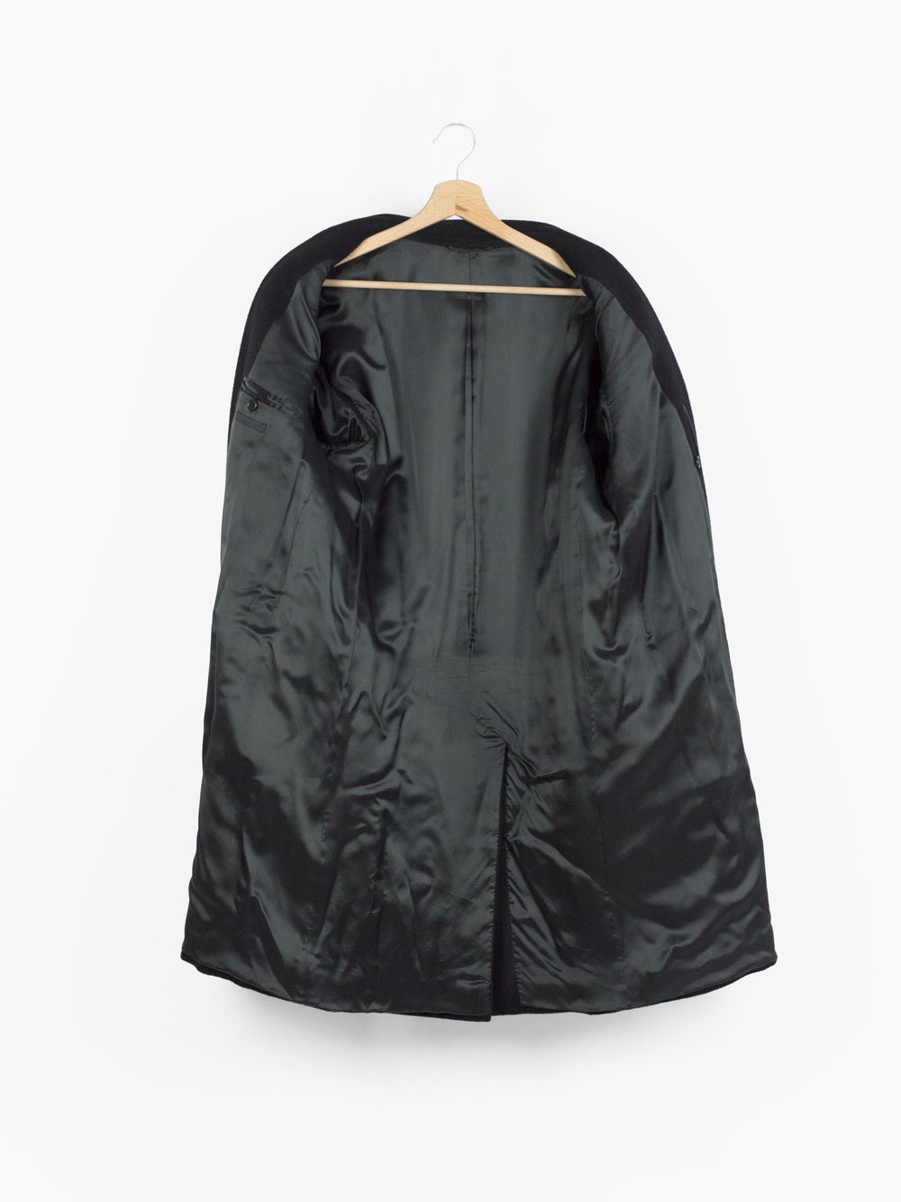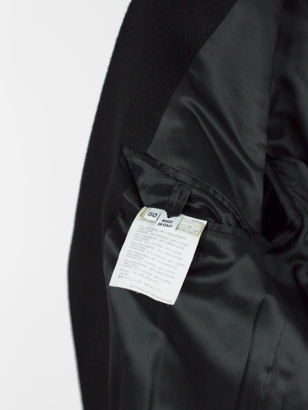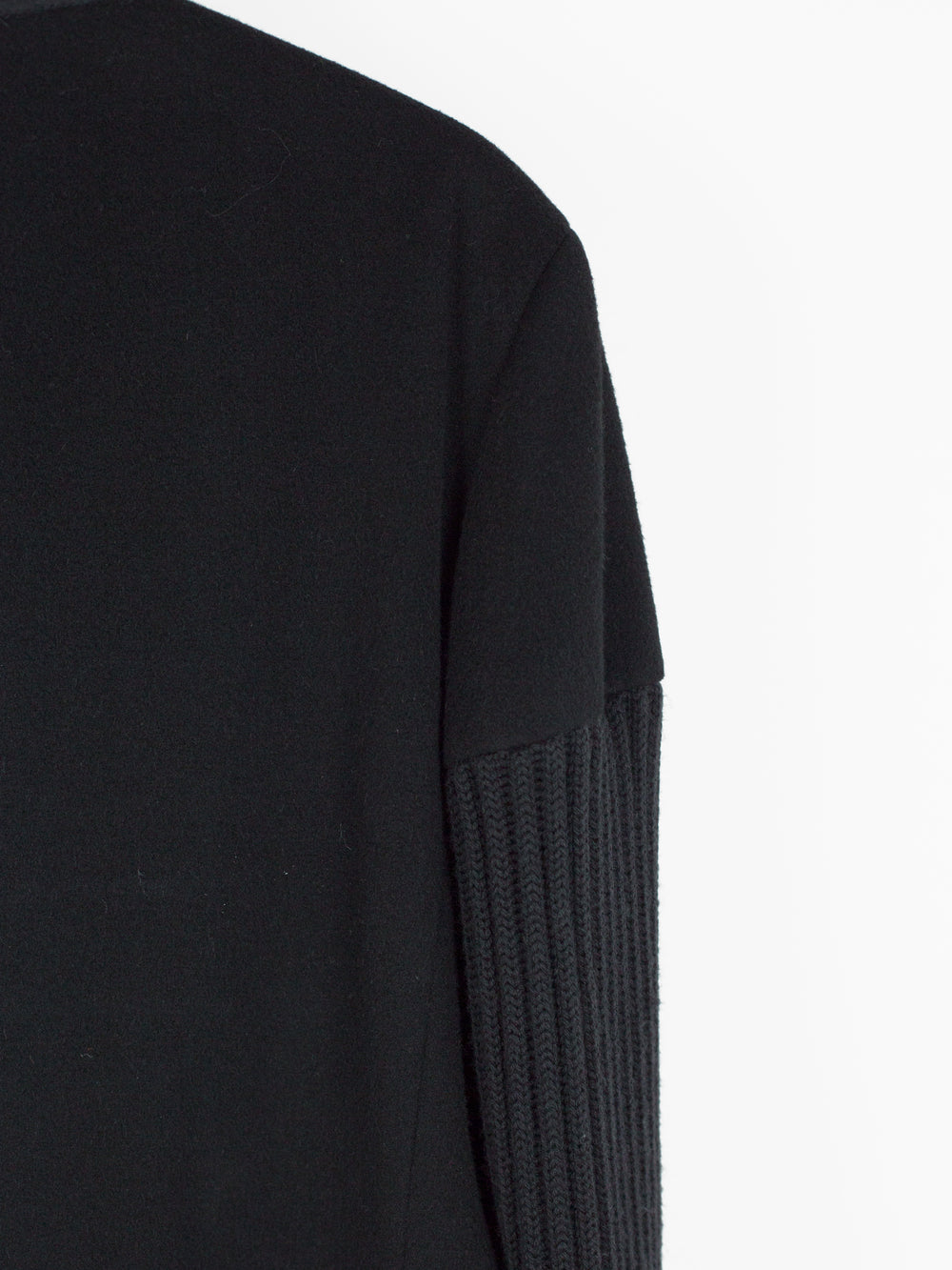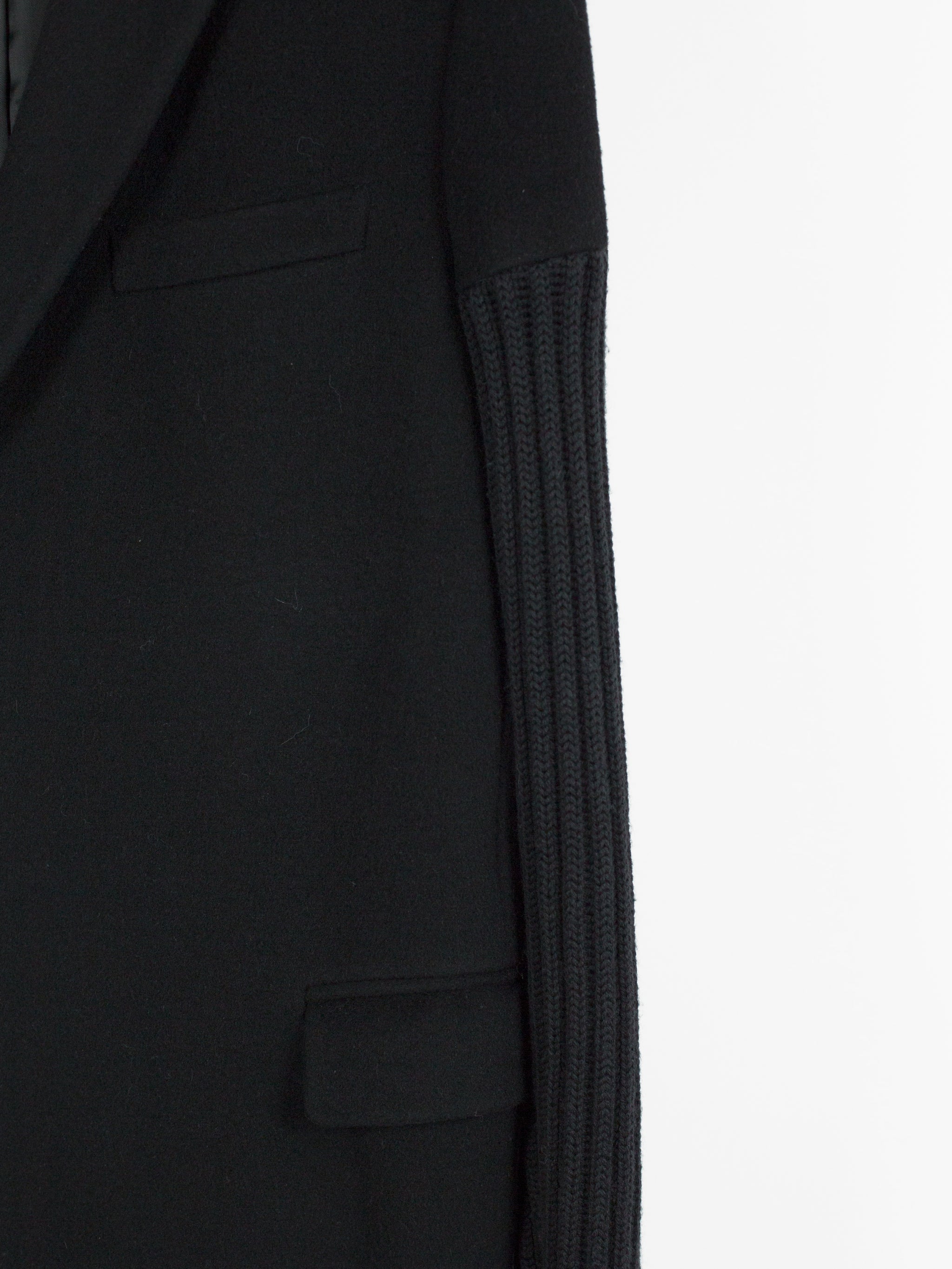 Featured in multiple runway shows across many years, the chester coat shape that forms the foundation of this piece is a staple within Helmut's repertoire. With subtlely structured shoulders and a slightly tailored waist, it has a subdued elegance and cleanliness that give it an air of timelessness (or as close to timeless as one can get). Rendered in a thick, plush cashmere/wool face fabric, the coat hangs off the shoulders with a weighty, fluid drape. At the upper arm, a statement chunky knit sleeve is inserted in place of a tailored one, creating a compelling play on proportions and an unexpected, subversive, layered look. The shape matches many of the composite layered ensembles shown in AW03--harnesses with a strap at the bicep, sleeve caps ending right under the shoulder, or knit armwarmer sleeves pulled up to below the armpit. While the AW03 runway reads more utilitarian and military inspired with its iconic aviator chaps, bombers, and fleece/3M reflective fabrics, this piece leans formal and versatile. It can be worn with other tailored garments or styled with military and workwear pieces for some tension in the mixed formalities.