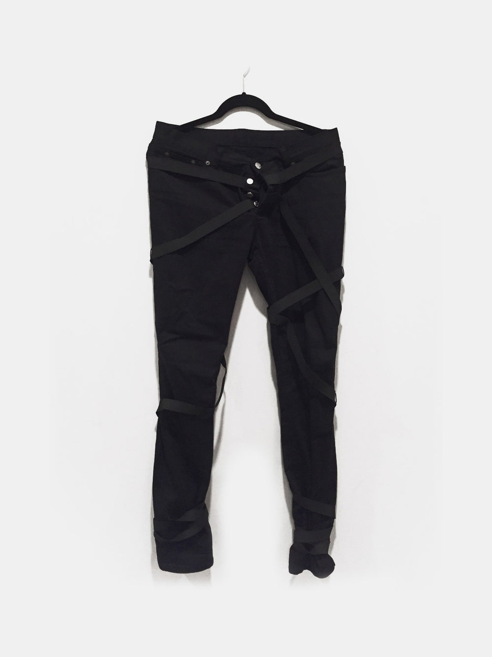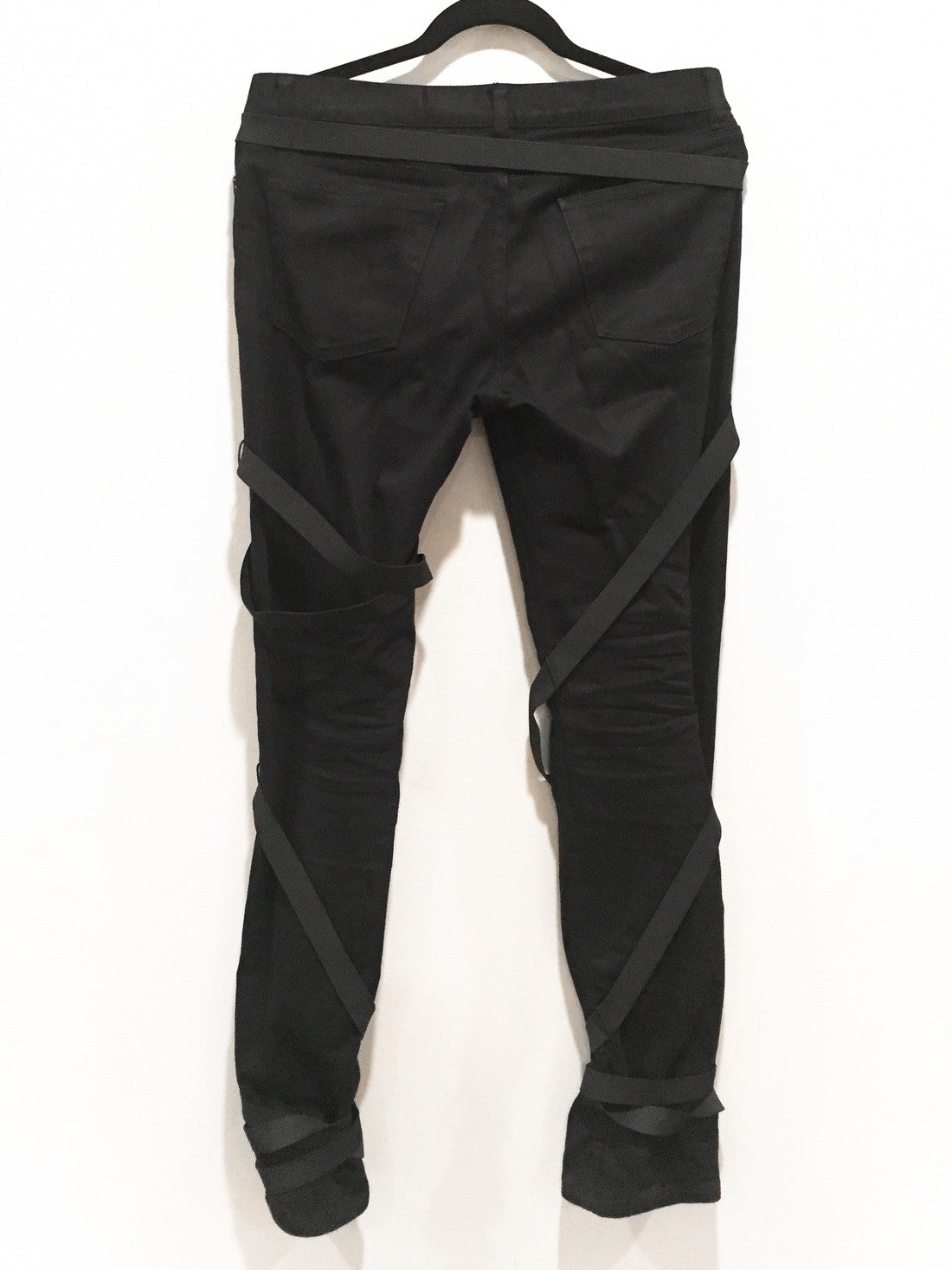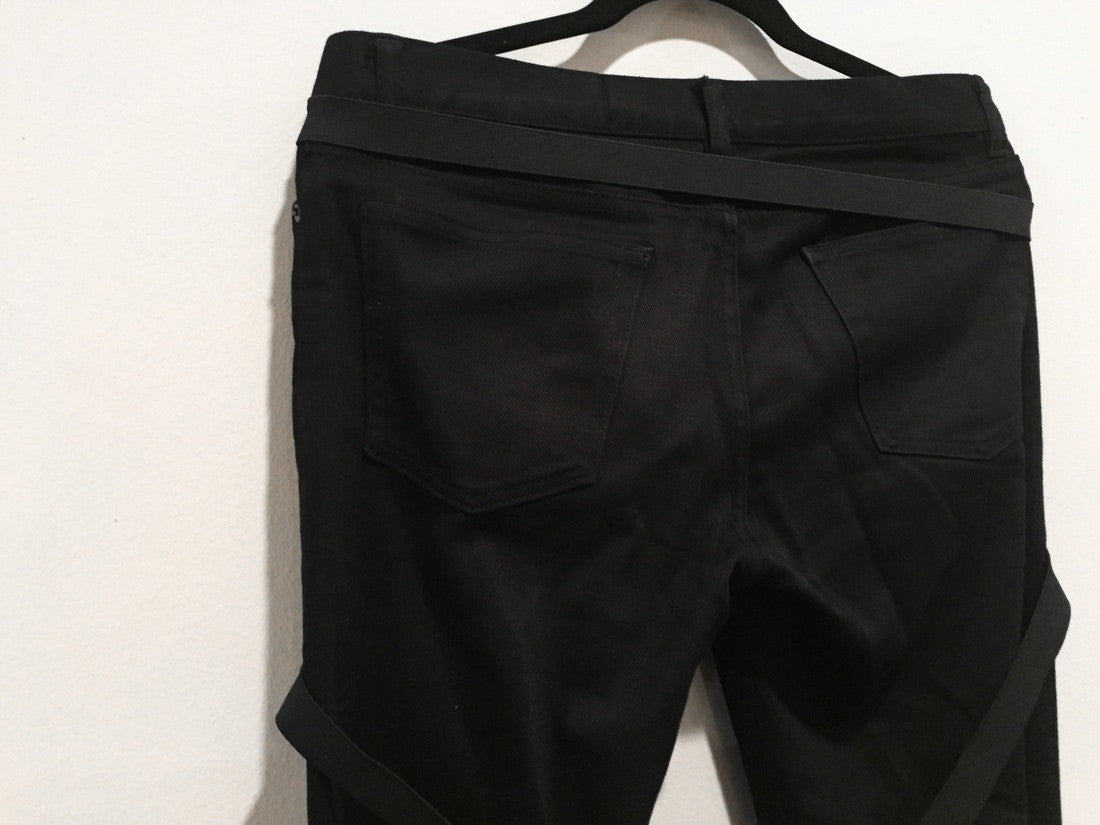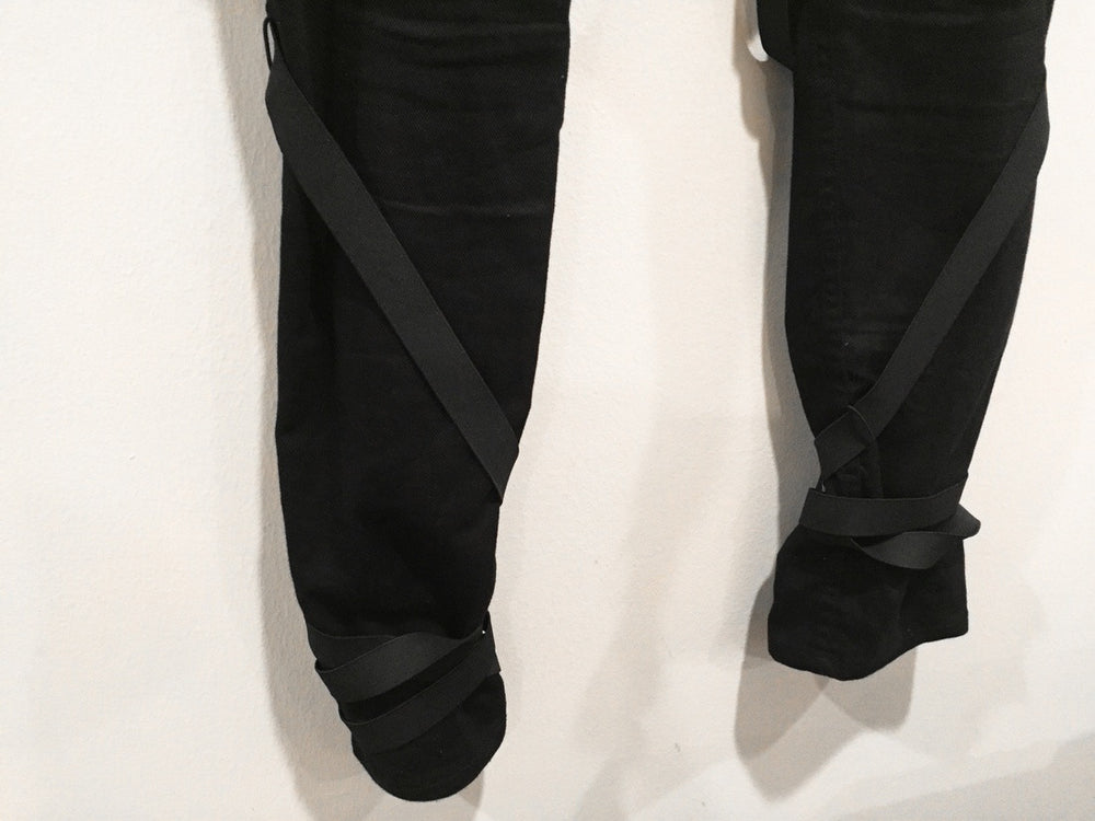 Tagged size 30 but fits more like a 32 Waist. This pair was produced in Japan but design is in-line with original Helmut productions. This iteration of the bondage jeans, made with a 2% polyurethane for stretch is inherently more wearable and comfortable than a rigid raw denim. Cut is a slim straight but the bands alter the silhouette depending on how you wear them. Stacking is very interesting with them wrapped around the ankle.