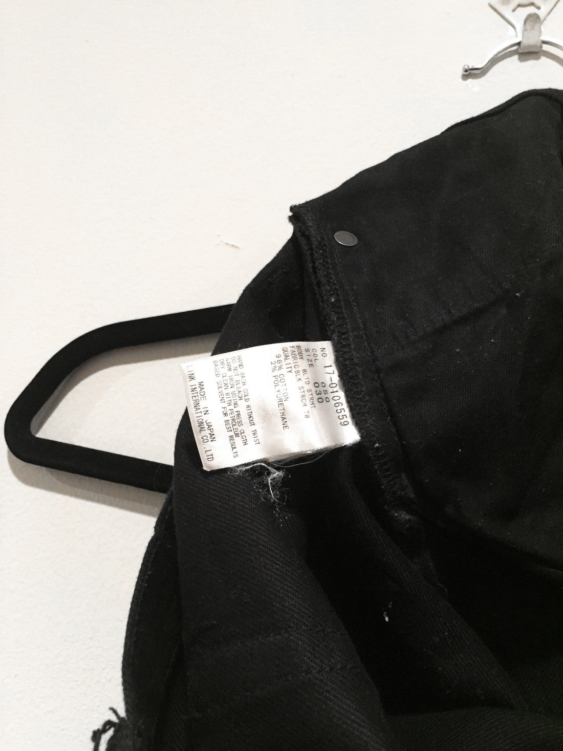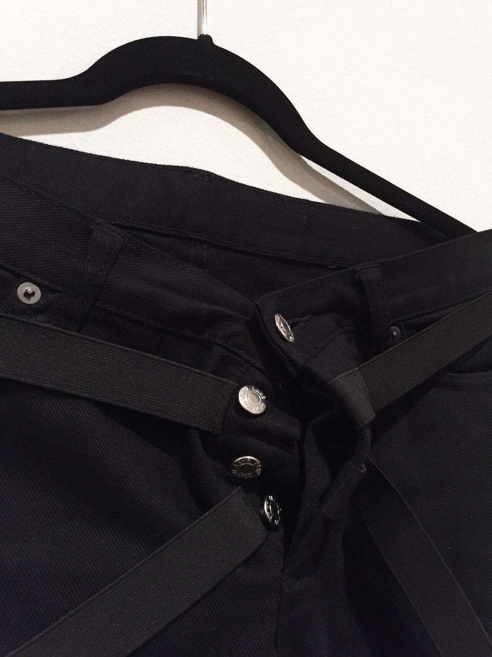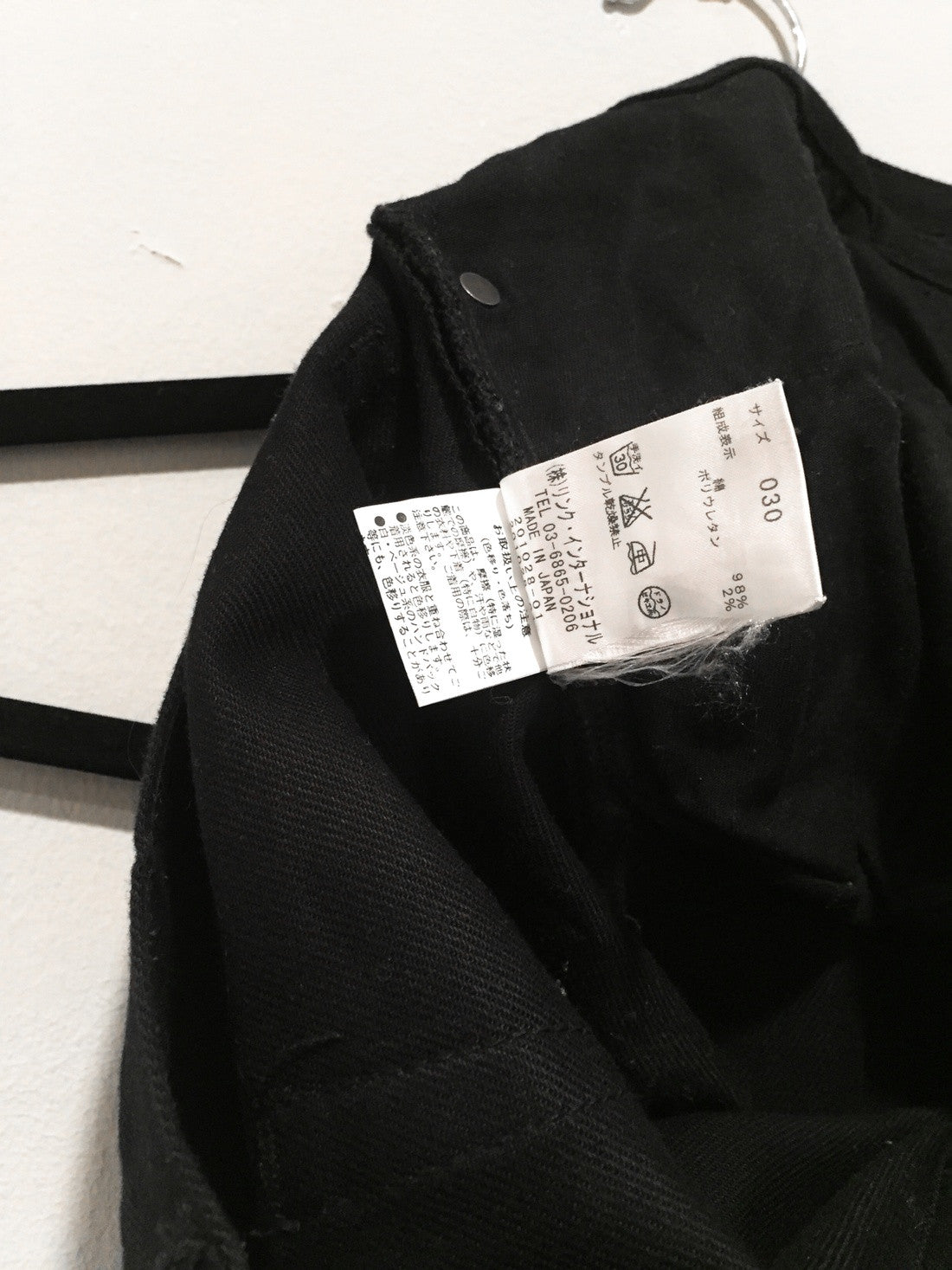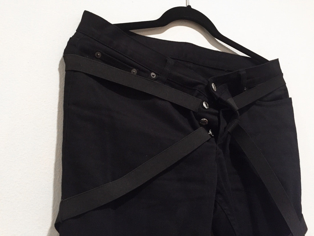Tagged size 30 but fits more like a 32 Waist. This pair was produced in Japan but design is in-line with original Helmut productions. This iteration of the bondage jeans, made with a 2% polyurethane for stretch is inherently more wearable and comfortable than a rigid raw denim. Cut is a slim straight but the bands alter the silhouette depending on how you wear them. Stacking is very interesting with them wrapped around the ankle.