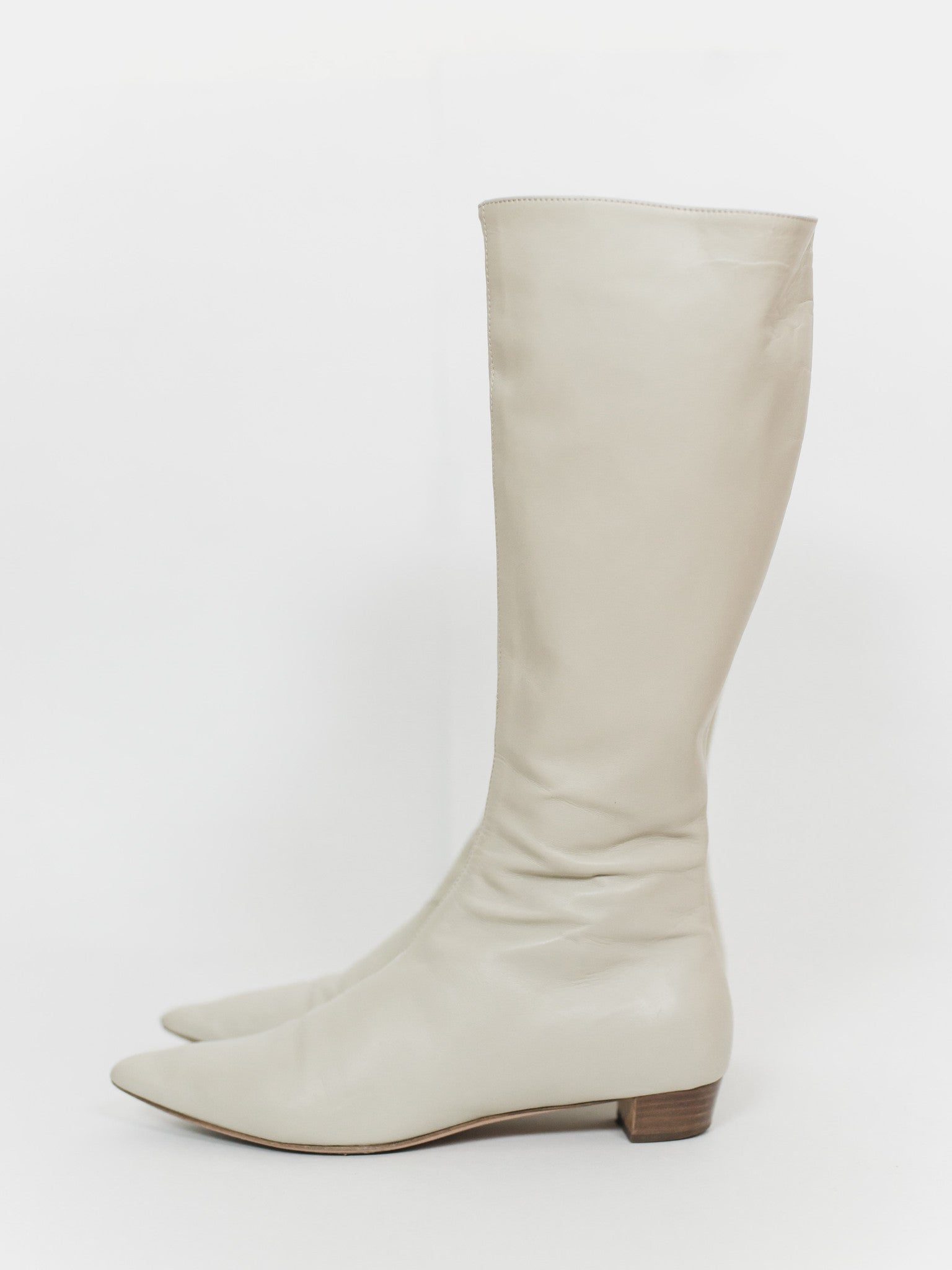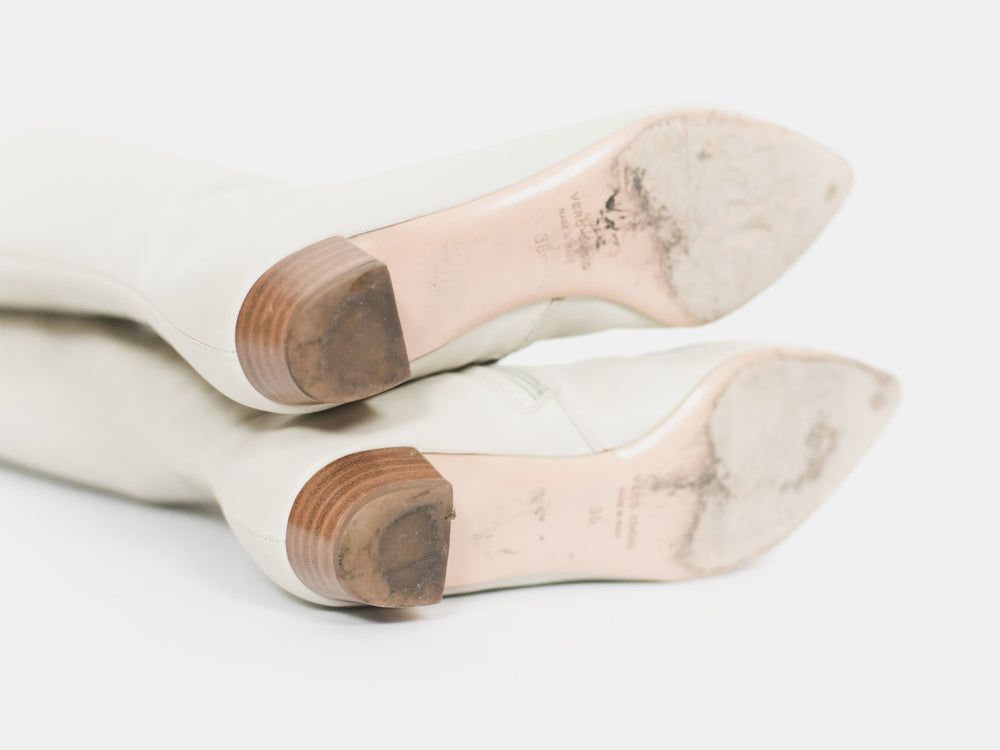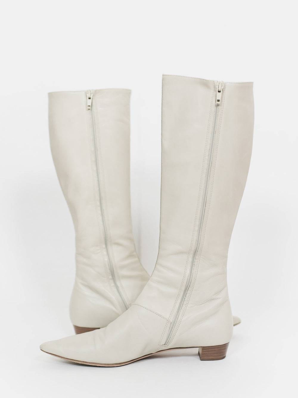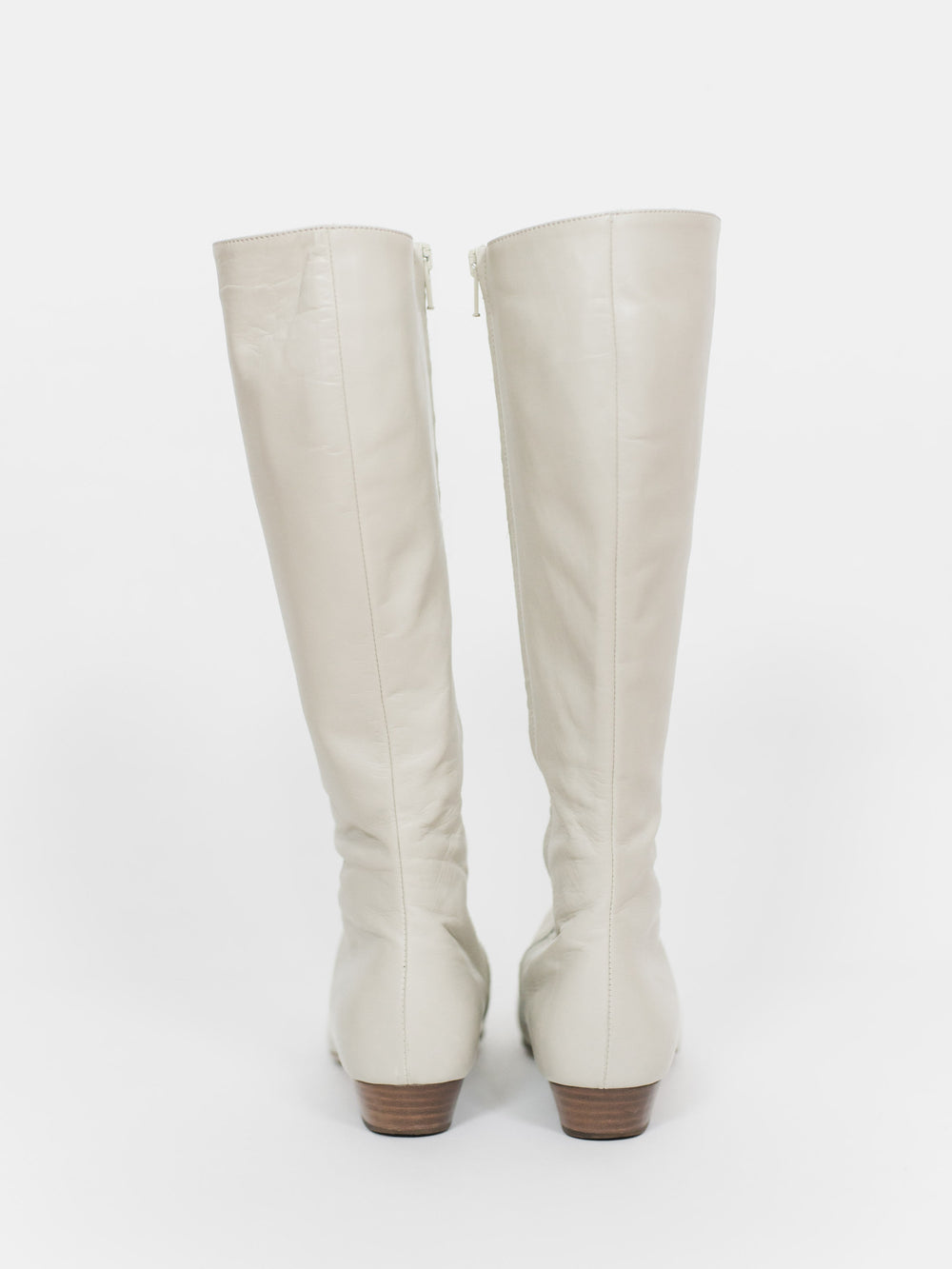 Vintage pair of creamy grey leather boots with a low stacked leather heel and side zip. The natural leather soles are scuffed.