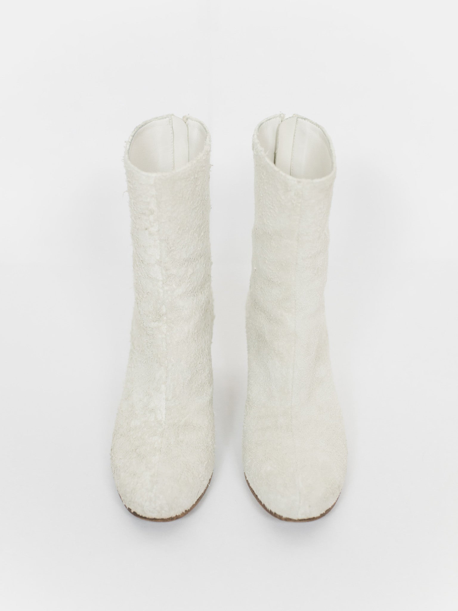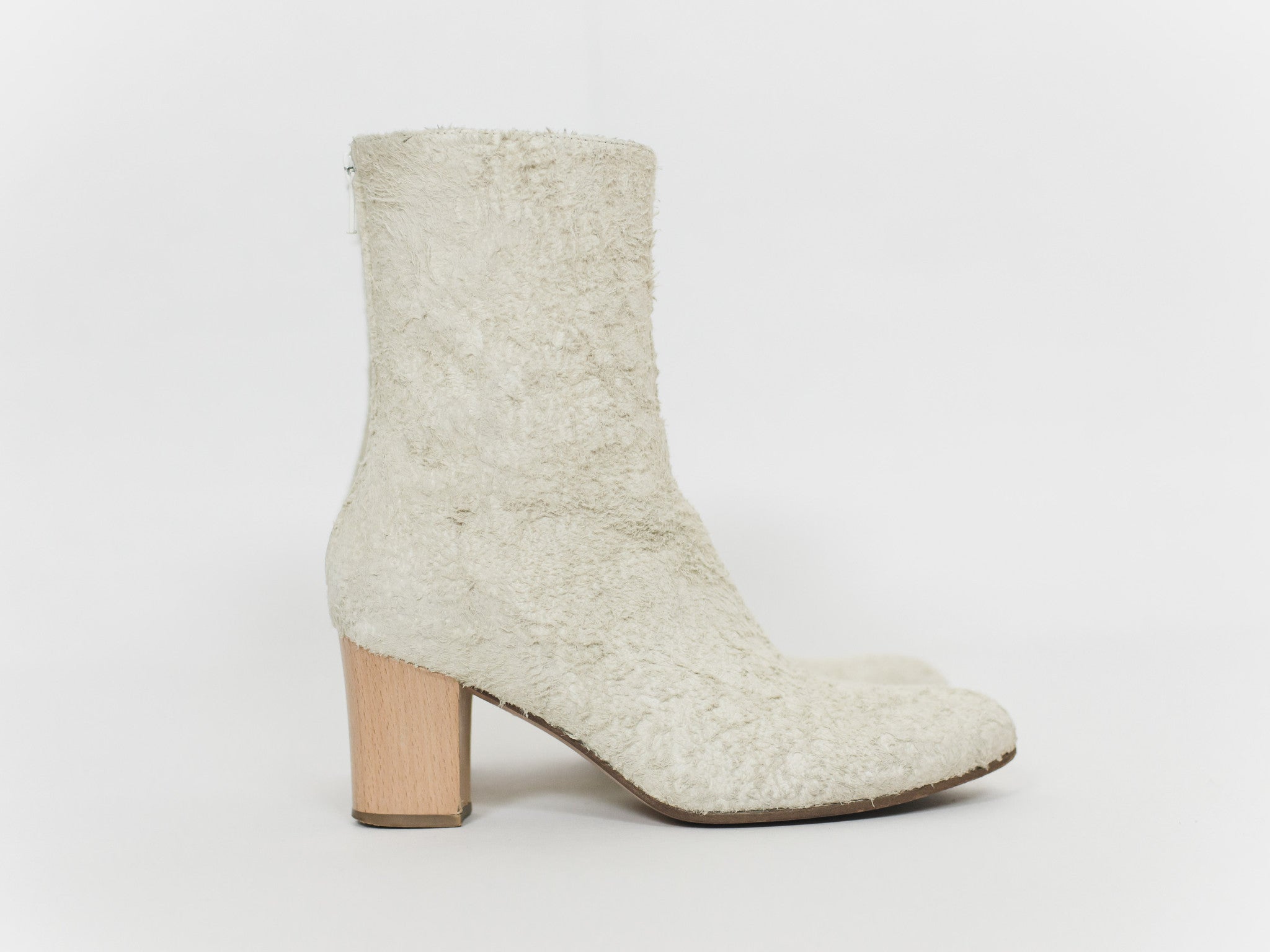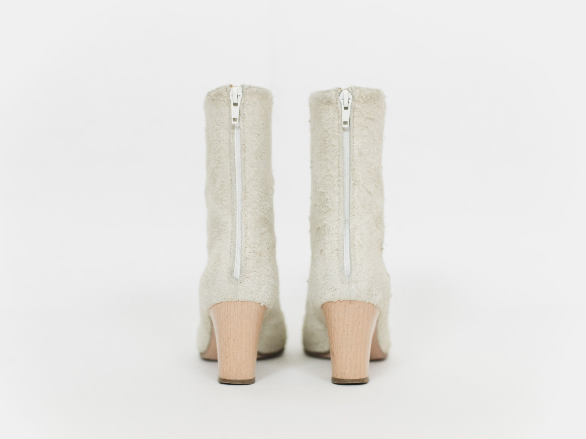 Vintage pair of creamy grey rough out boots with a wooden heel and back zip. The natural leather soles are scuffed.