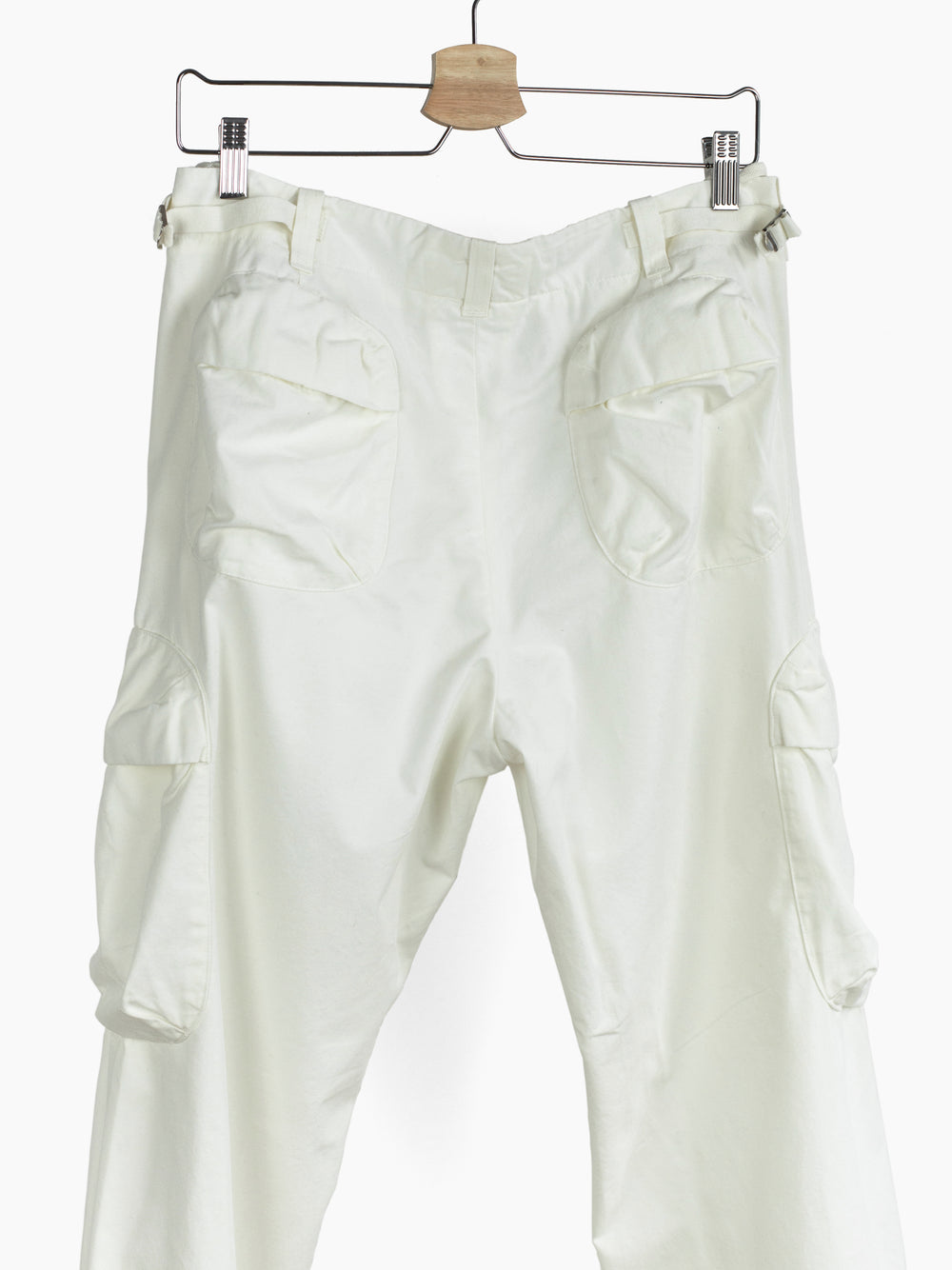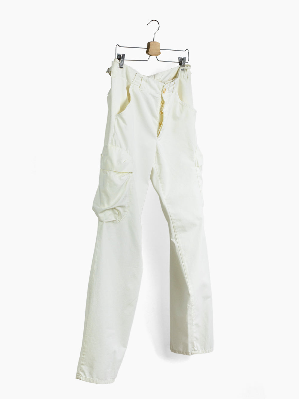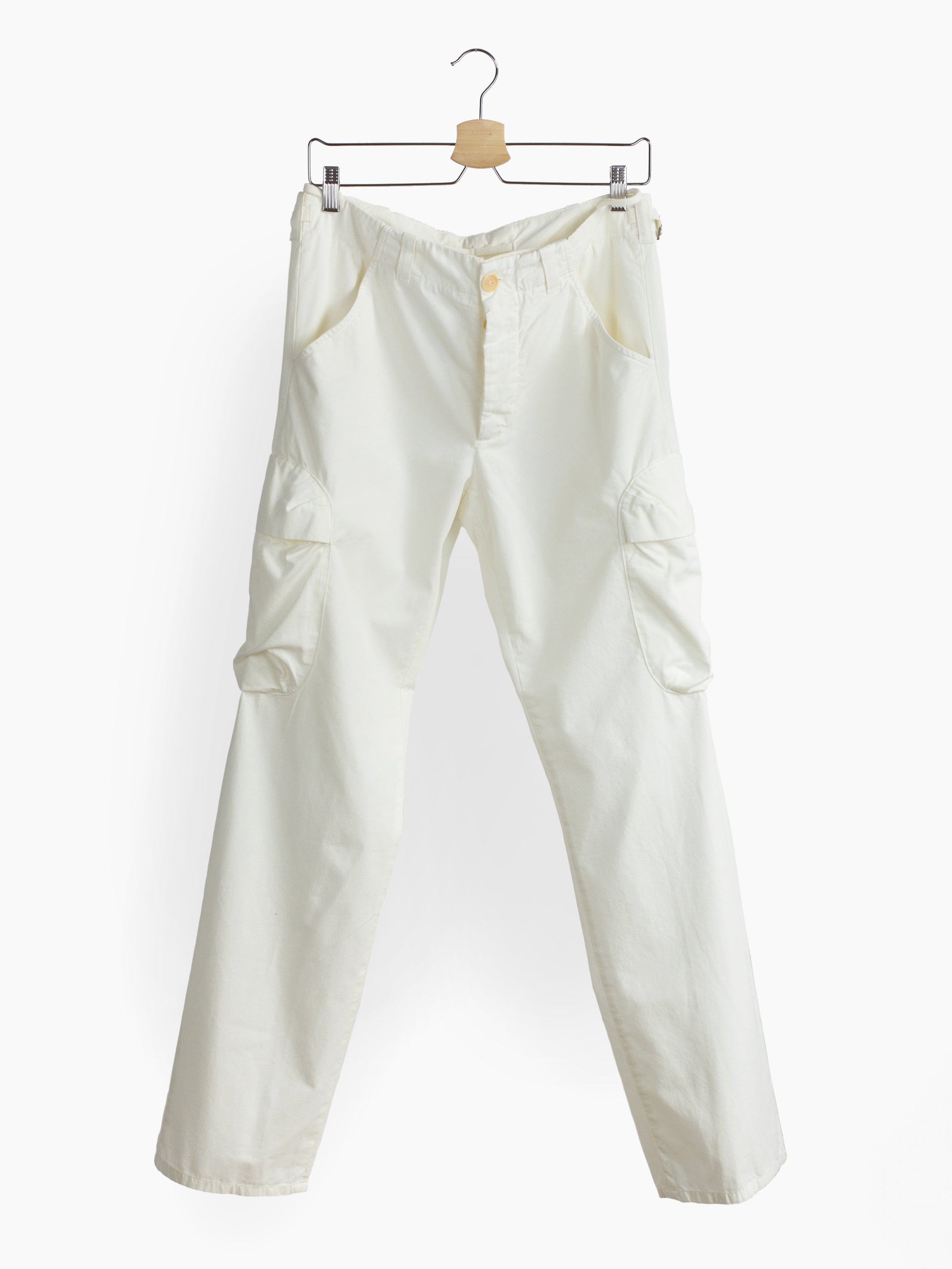 The archetypical men's cargo trouser, recut and refashioned with Helmut Lang's refined sensibility. Here traditionally rectangular pockets are rounded and darted, minimizing panels and creating a sculptural 3D volumes. Set at the thighs and seat, the pockets bring a sense of organic/soft tension to a traditionally aggressive menswear staple. Legs are cut straight with an elegant taper in a soft, aged eggshell white cotton twill that's perfect for summer and a perfect match with the ovaloid 3D pockets.