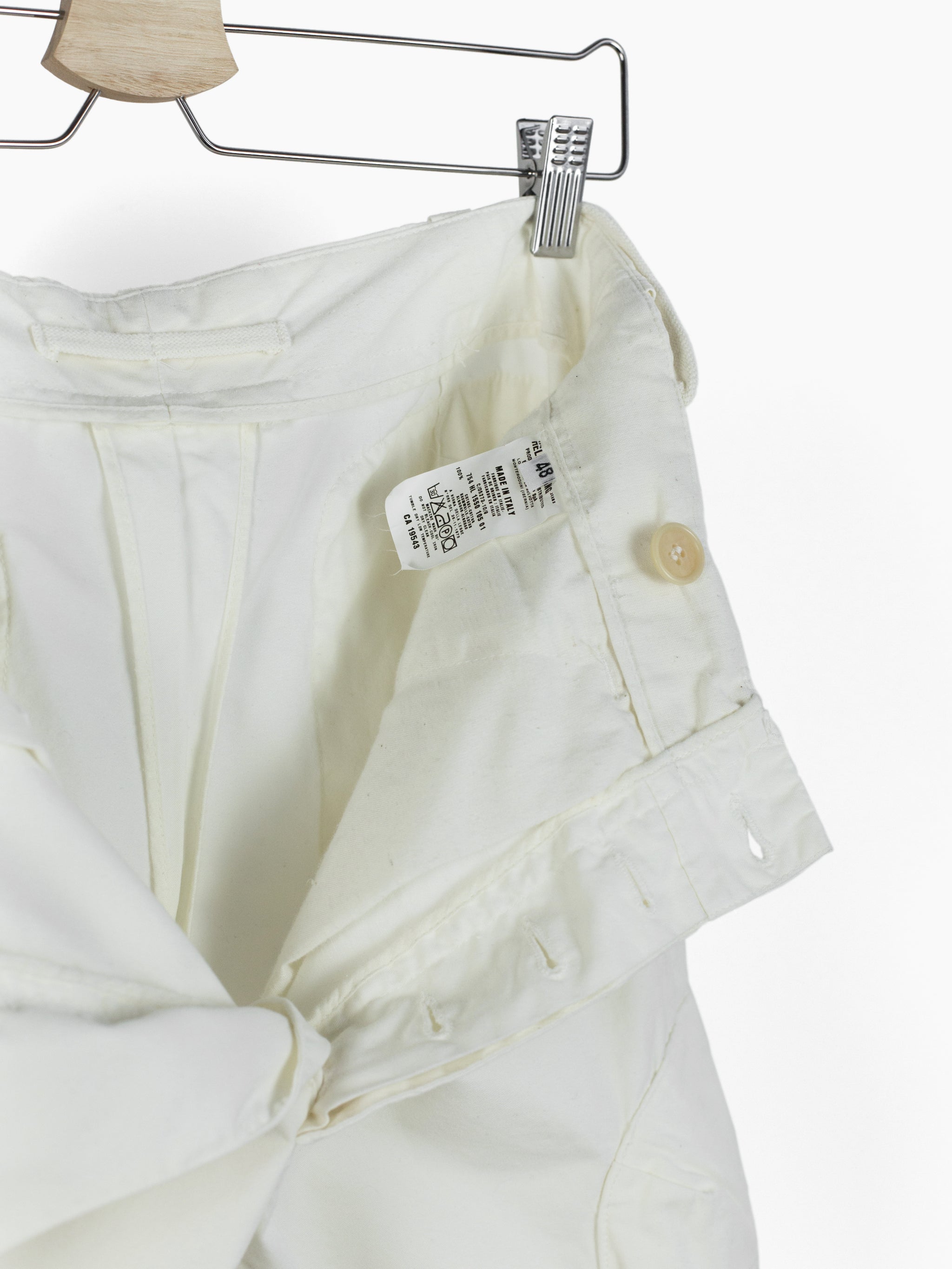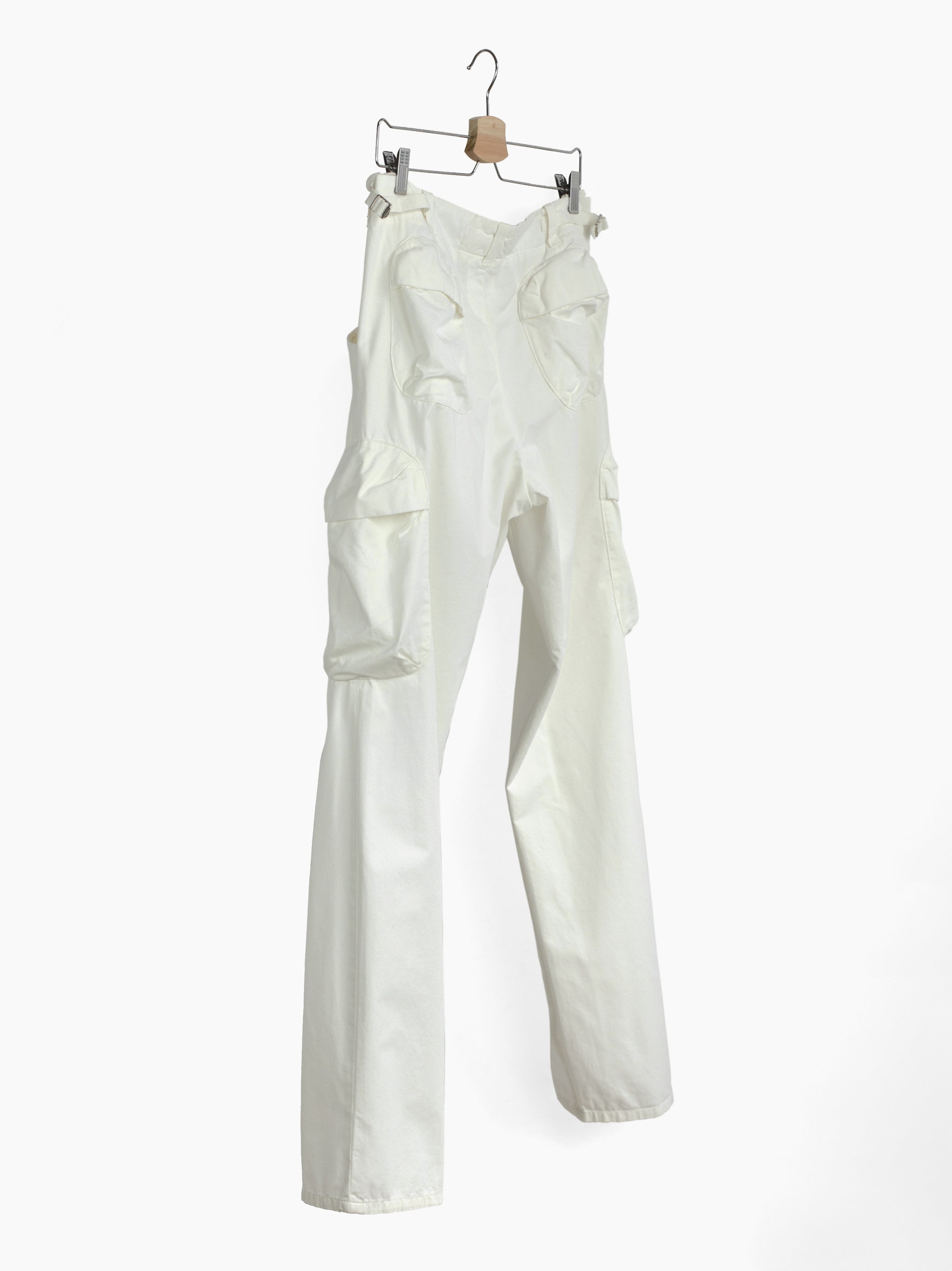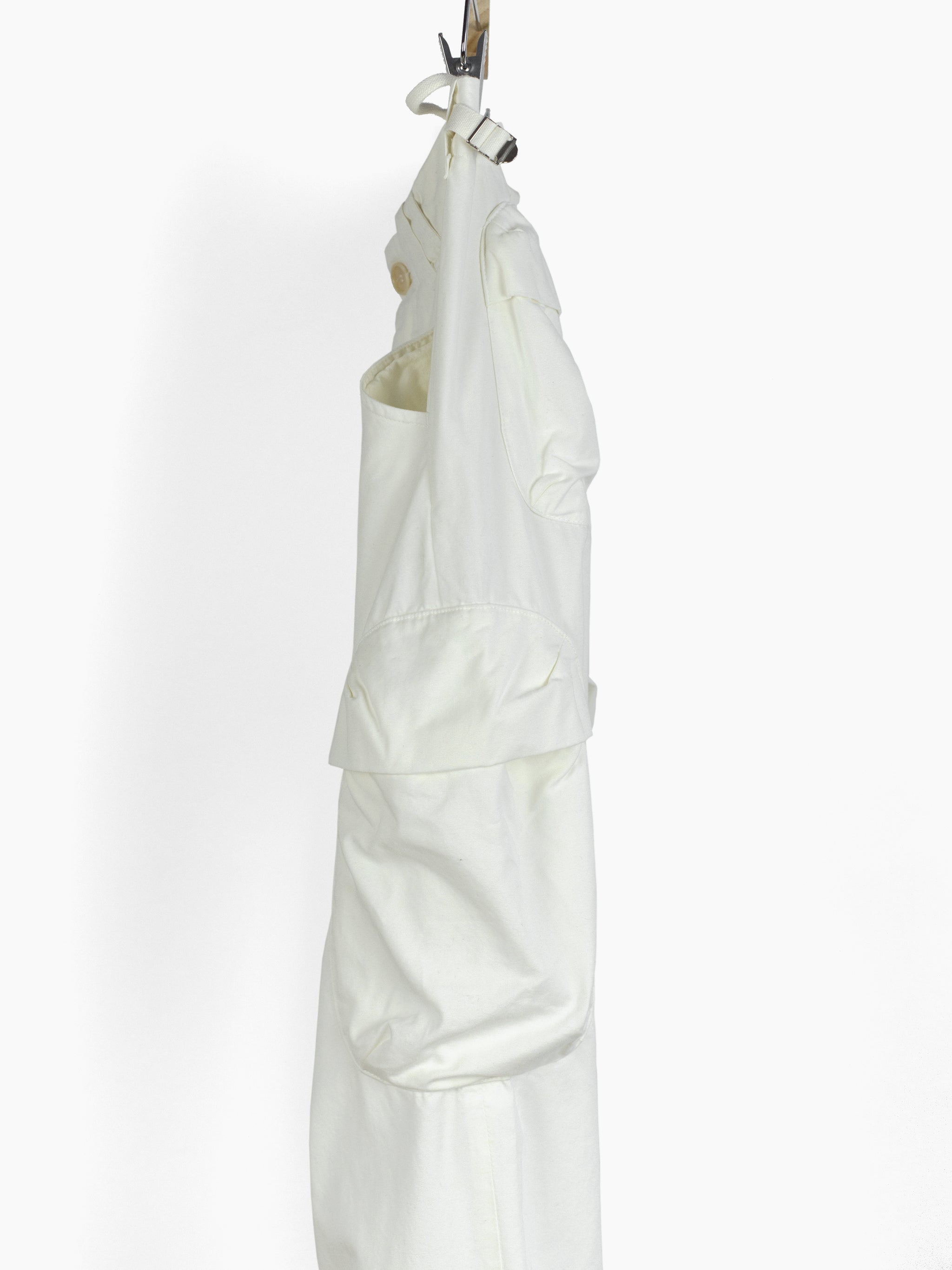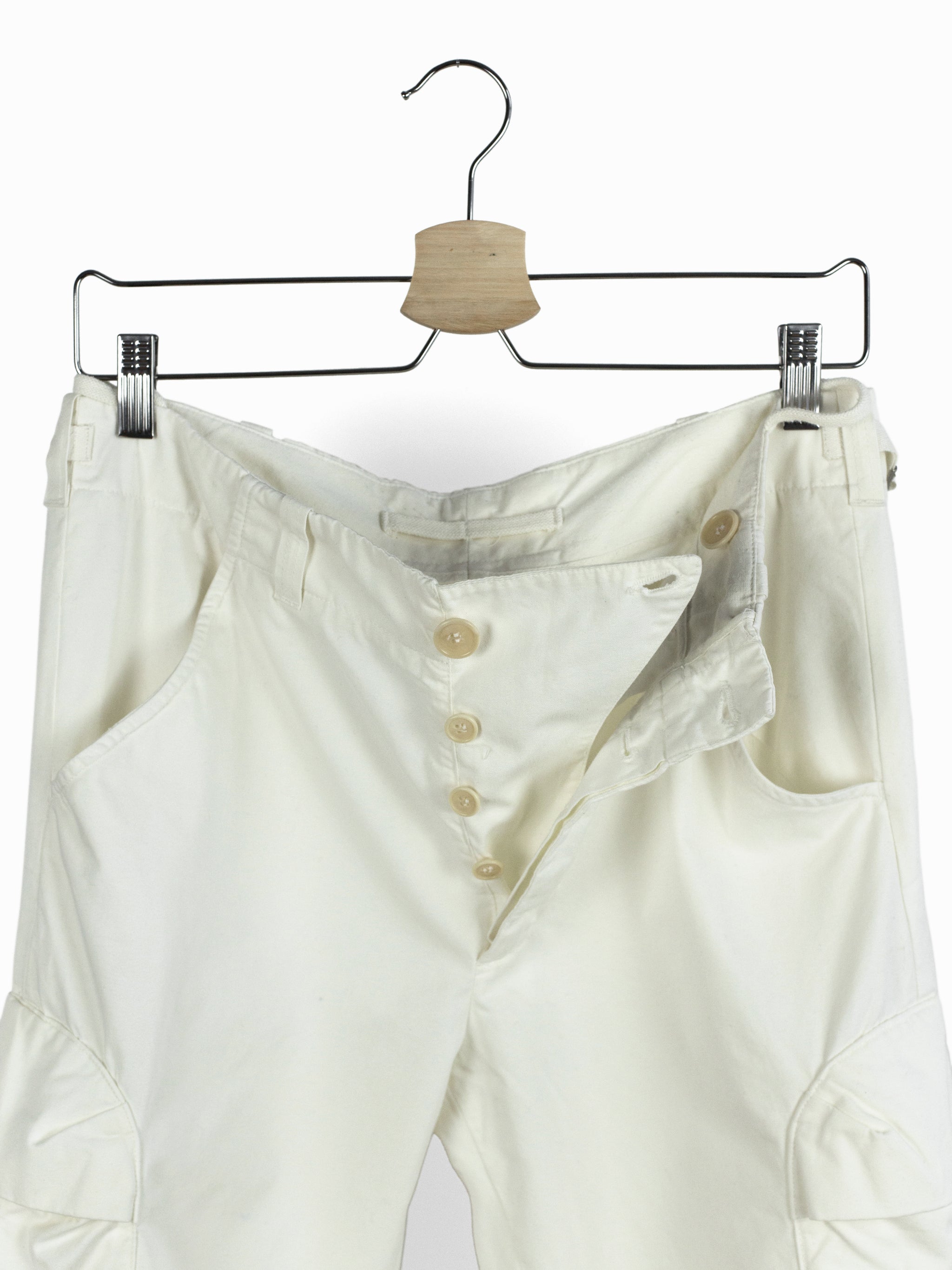 The archetypical men's cargo trouser, recut and refashioned with Helmut Lang's refined sensibility. Here traditionally rectangular pockets are rounded and darted, minimizing panels and creating a sculptural 3D volumes. Set at the thighs and seat, the pockets bring a sense of organic/soft tension to a traditionally aggressive menswear staple. Legs are cut straight with an elegant taper in a soft, aged eggshell white cotton twill that's perfect for summer and a perfect match with the ovaloid 3D pockets.