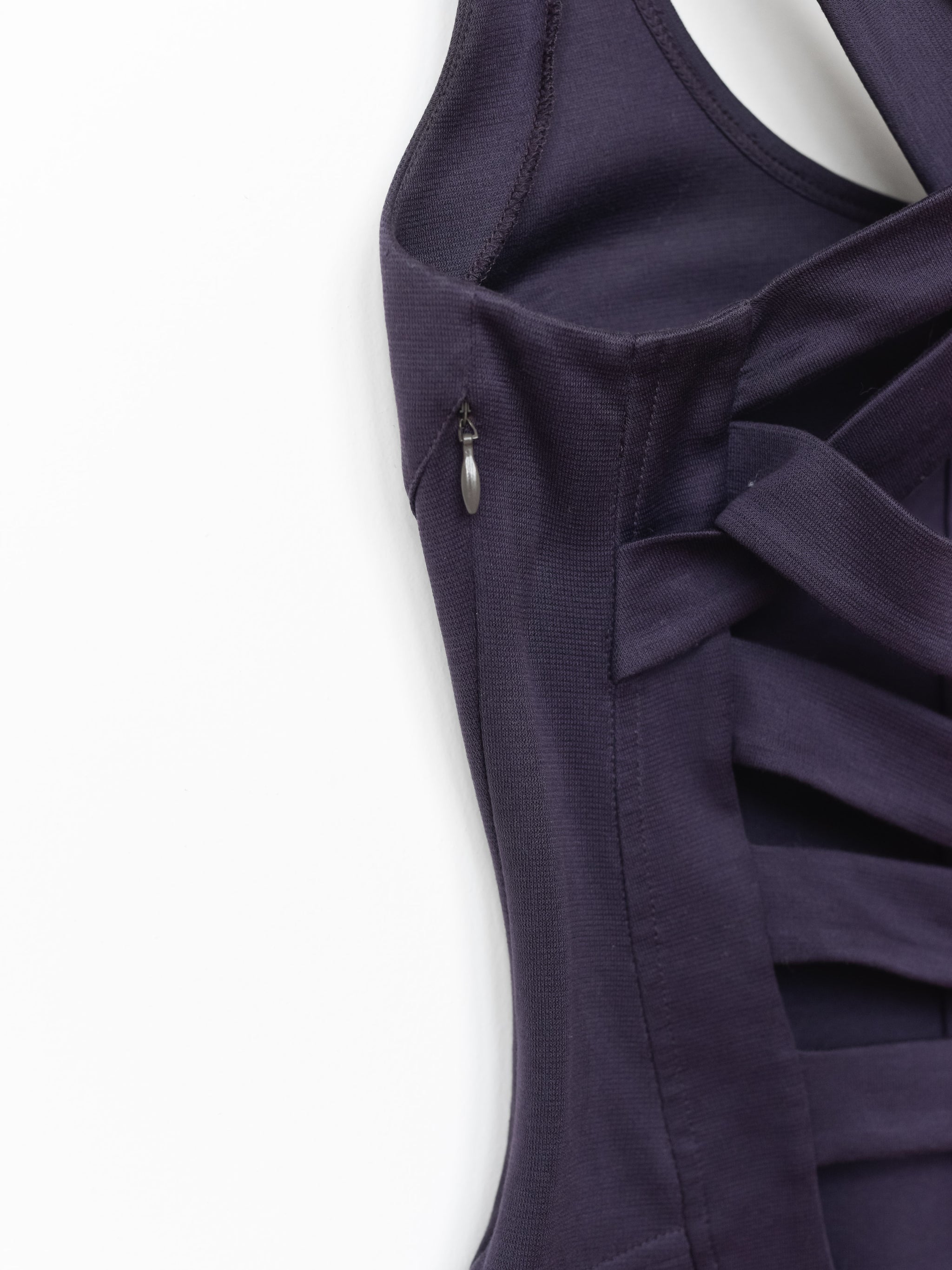 With the straps in front, the anatomically positioned crossing and use of a luxuriously smooth cotton enables the body to become integral to the design of the garment supported by intricate darting throughout while the curved seams in the upper back anatomically accentuates the shoulder blade. Worn the other way, the curved seams continue to flatter and conform to the wearer.