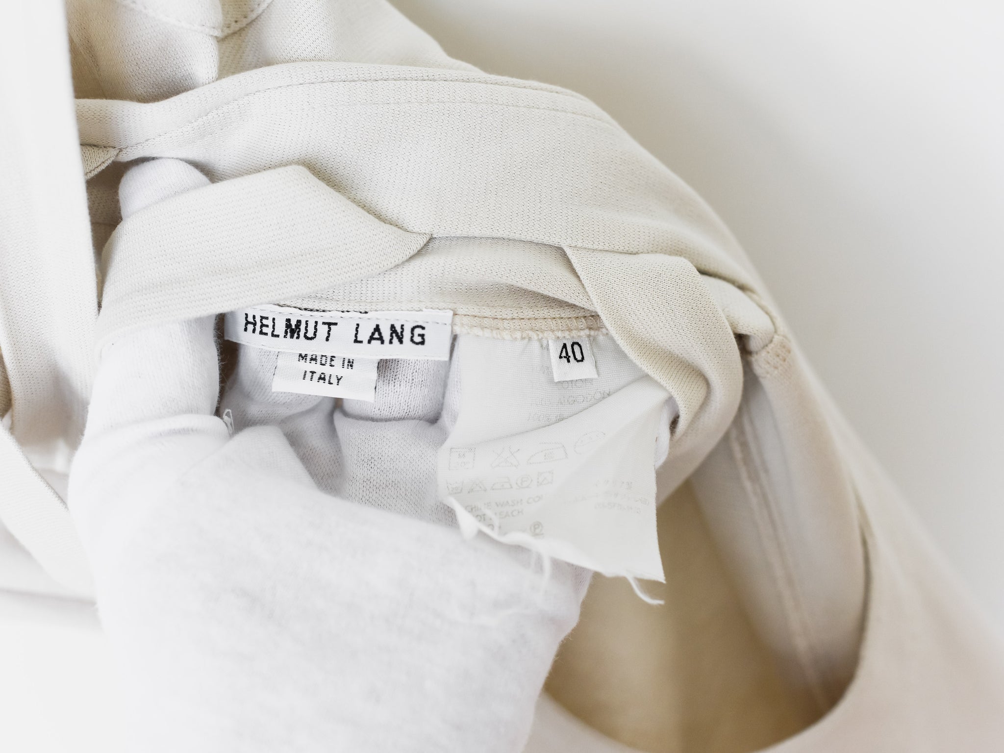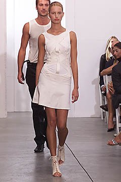 "Helmut Lang has often been praised for his 'deconstructive' designs. With basic garment forms as the starting point, Lang created subversively elegant and abstract designs that combined the classic with the avant-garde. This experimentation was amply demonstrated in S/S 2001, where Lang explored ways of revealing the body. Cut-outs and laces were used to decorate tops, trousers and outerwear, while dresses featured straps and perforations that created a subtle yet sensual effect.The wearer's body is highlighted and in turn becomes an essential component of the design itself. S/S 2001 can thus be understood as a quintessential Helmut Lang collection, combining his cerebral conceptualism with a new sense ofraw-yet-refined sexiness." - Endyma