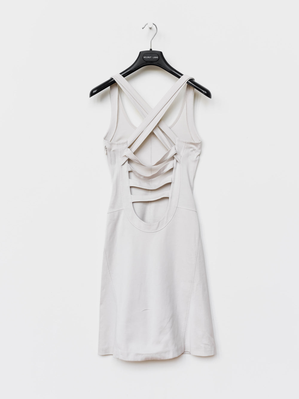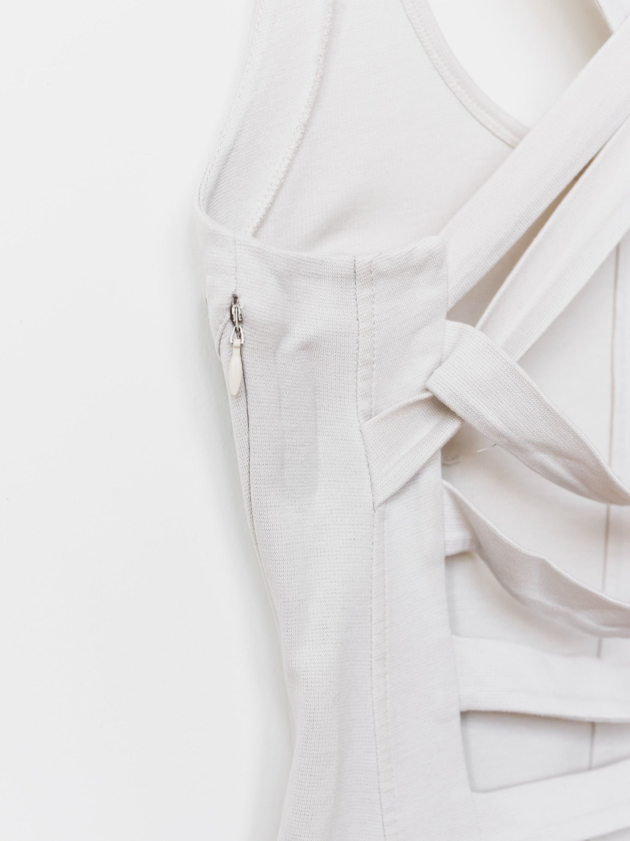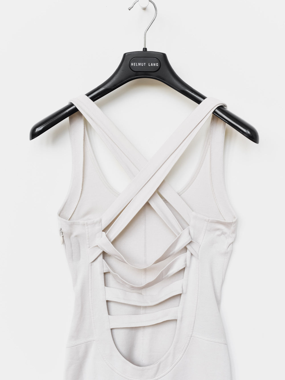 The crossed bandage details are one of the most iconic motifs of SS01, exemplifying a subtle sexiness of an unconventional deconstruction, able to be worn with either side in the front as showcased in the runway.