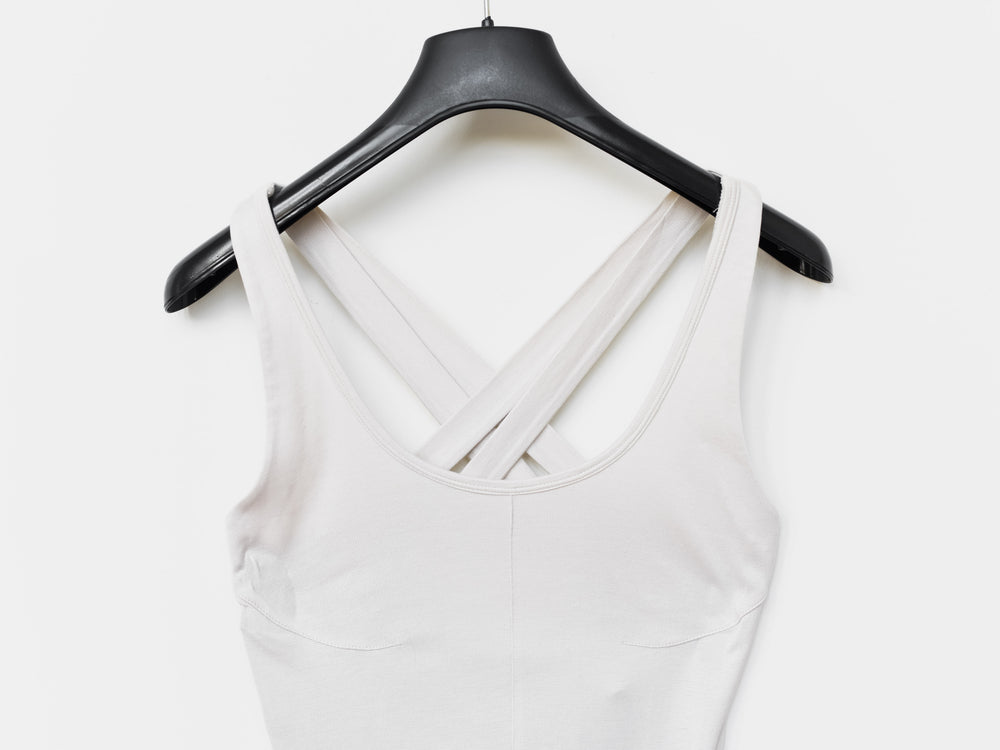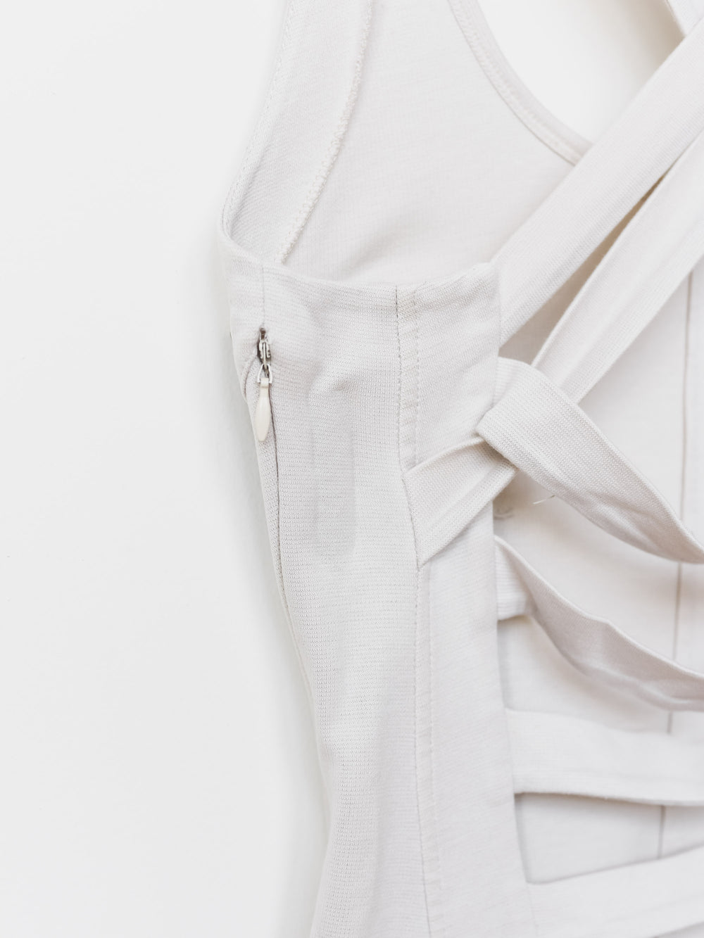 With the straps in front, the anatomically positioned crossing and use of a luxuriously smooth cotton enables the body to become integral to the design of the garment supported by intricate darting throughout while the curved seams in the upper back anatomically accentuates the shoulder blade. Worn the other way, the curved seams continue to flatter and conform to the wearer.