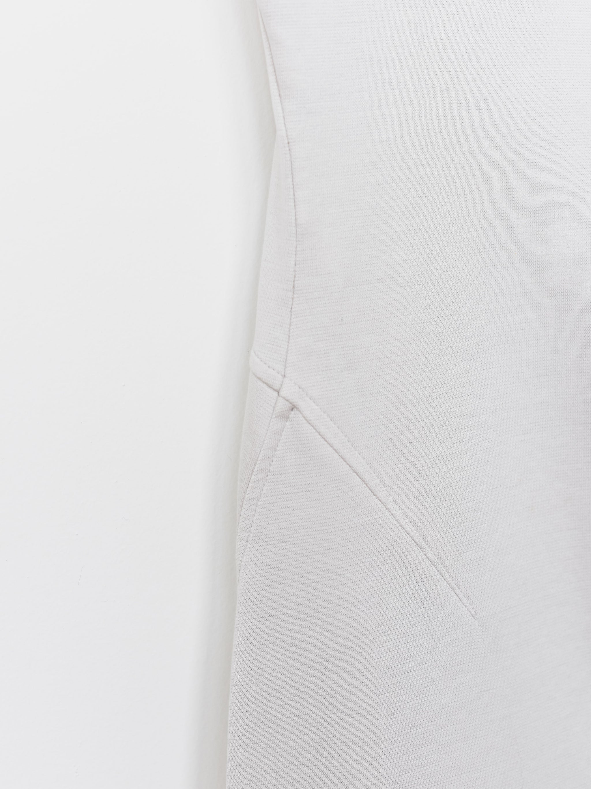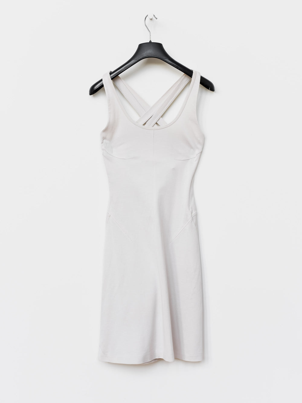 The construction is impeccable despite the final simplicity of the garment, with beautiful curved panels and seams near the hem and extremely clean collars and edges contrasting with the seamless straps.
