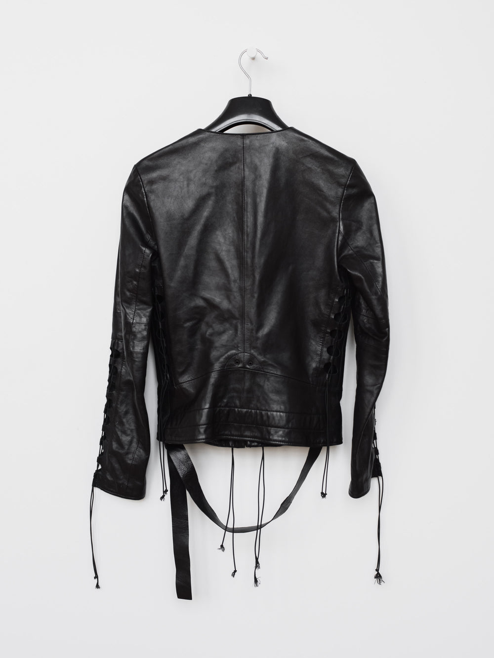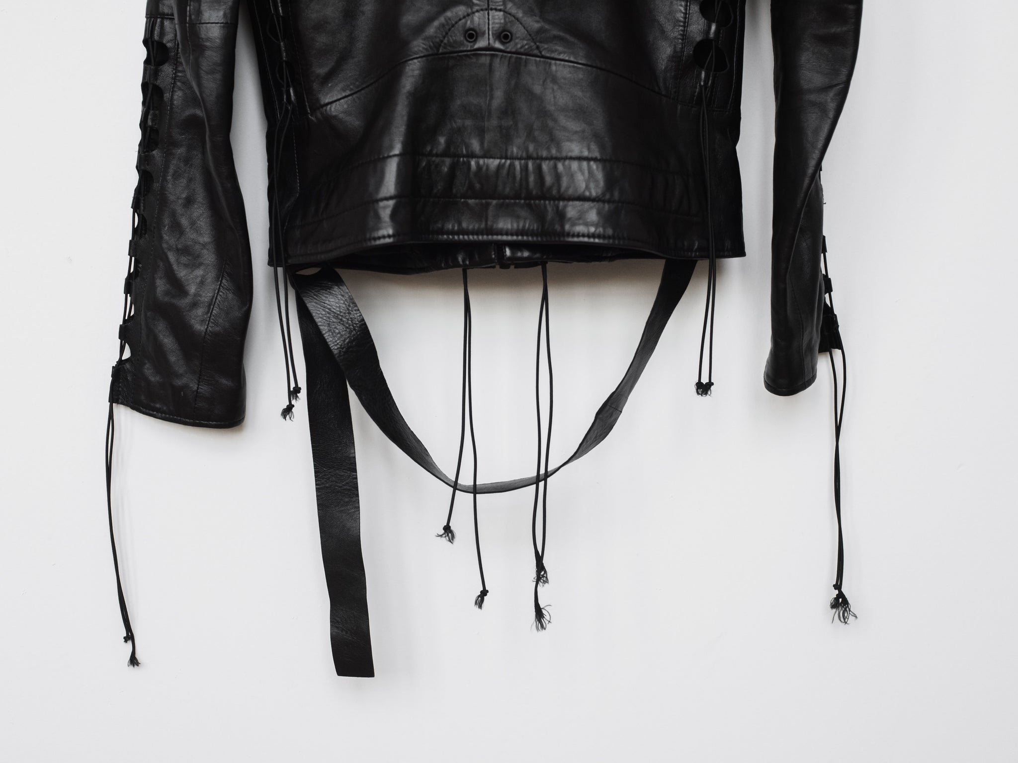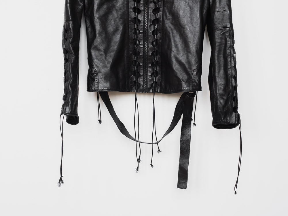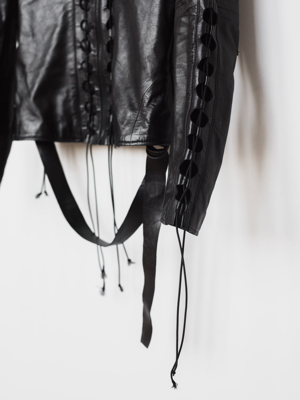 The cutouts are stitched together out of the main body panel without using any additional pieces of leather in an ingenious and intensive process where the supple and delicate leather is carefully thinned and skived then folded over to maintain a smooth seamless surface. The signature dropped back bondage strap, usually crafted in cotton webbing, is rendered here in the same leather as the rest of the jacket. This choice creates a nearly singular material vocabulary while complementing and driving focus towards the other outer material: the elongated adjustable corset ties that runs throughout the lacing panels of the piece.