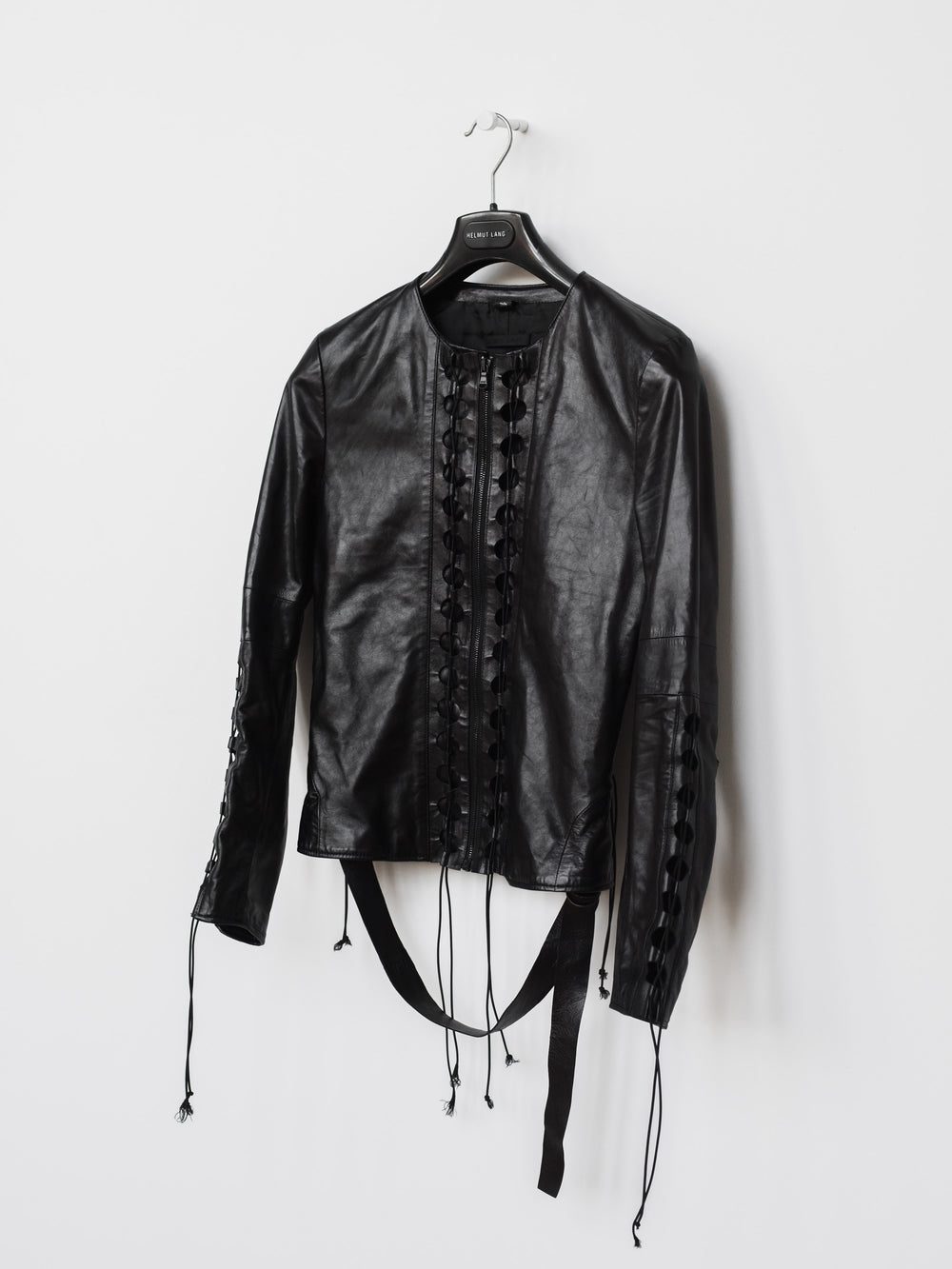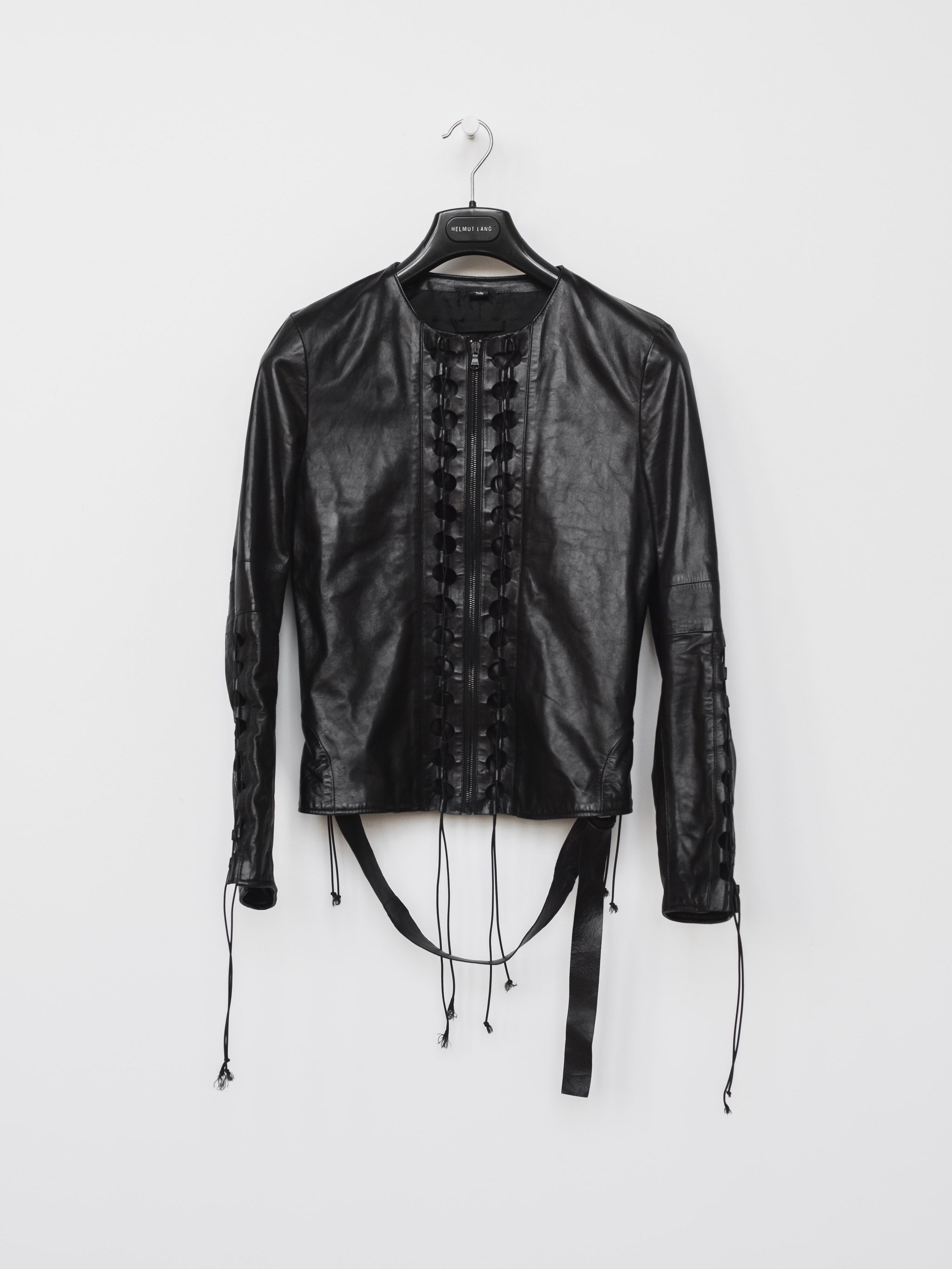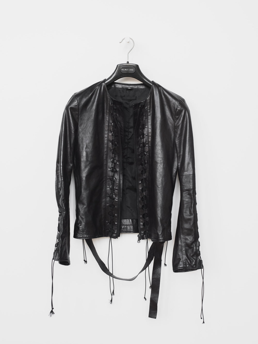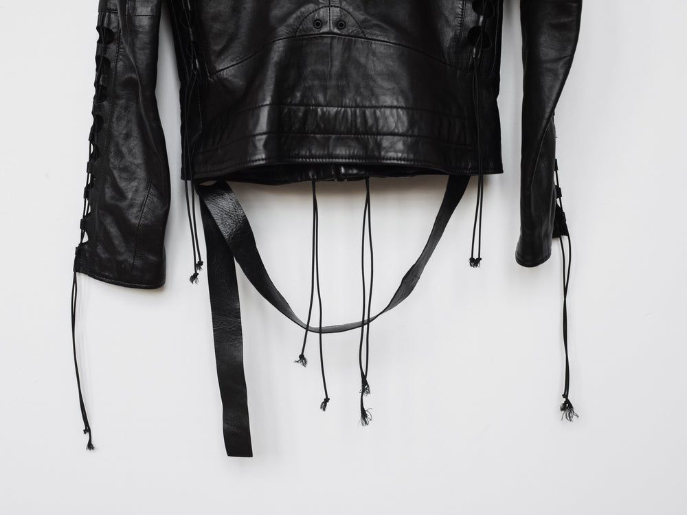 The cutouts are stitched together out of the main body panel without using any additional pieces of leather in an ingenious and intensive process where the supple and delicate leather is carefully thinned and skived then folded over to maintain a smooth seamless surface. The signature dropped back bondage strap, usually crafted in cotton webbing, is rendered here in the same leather as the rest of the jacket. This choice creates a nearly singular material vocabulary while complementing and driving focus towards the other outer material: the elongated adjustable corset ties that runs throughout the lacing panels of the piece.