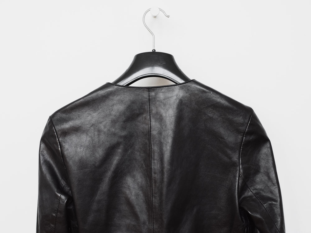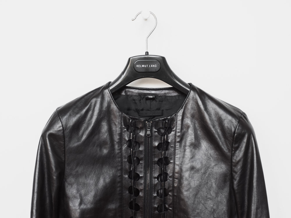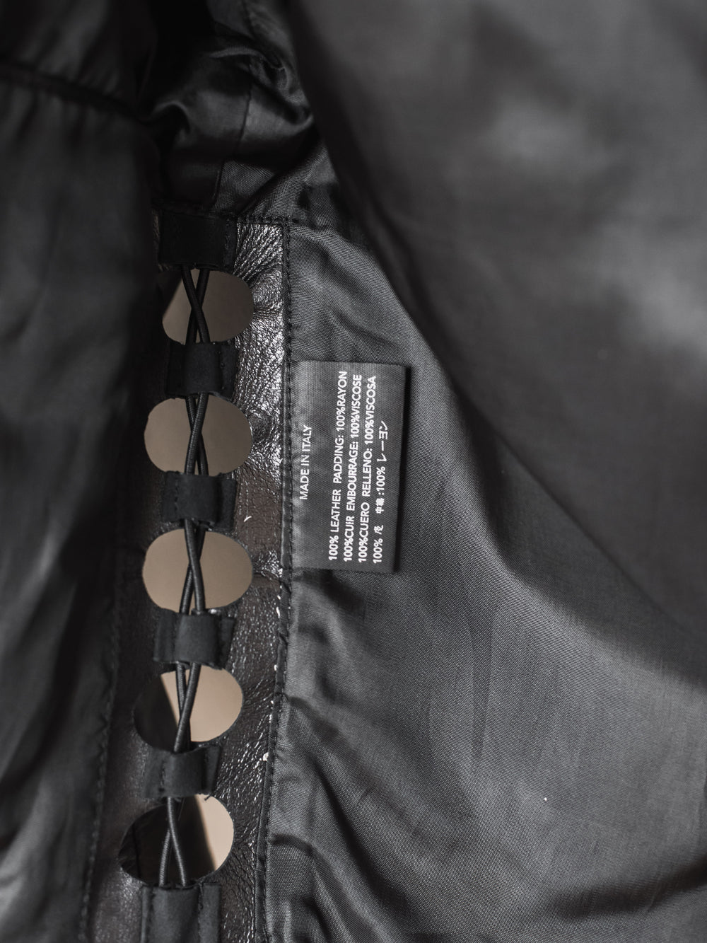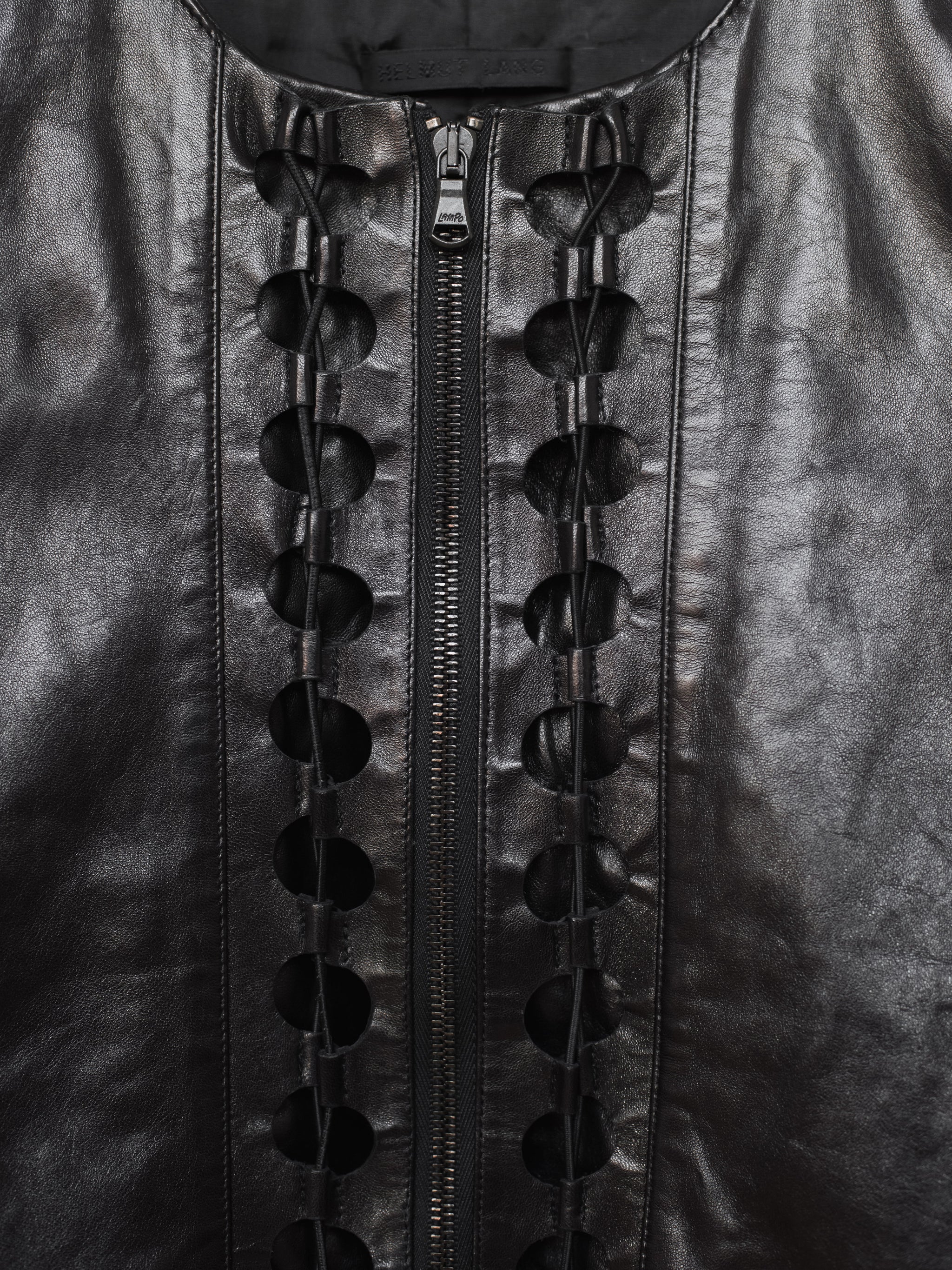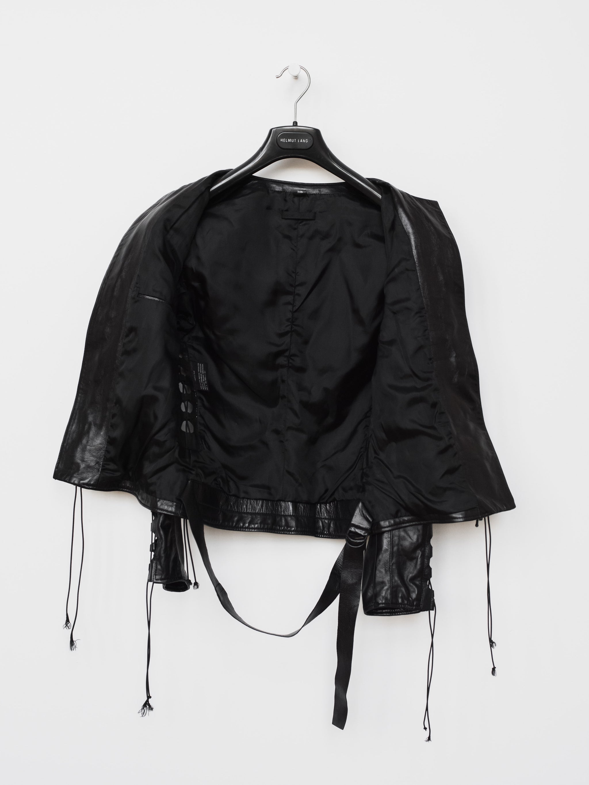 The cutouts are stitched together out of the main body panel without using any additional pieces of leather in an ingenious and intensive process where the supple and delicate leather is carefully thinned and skived then folded over to maintain a smooth seamless surface. The signature dropped back bondage strap, usually crafted in cotton webbing, is rendered here in the same leather as the rest of the jacket. This choice creates a nearly singular material vocabulary while complementing and driving focus towards the other outer material: the elongated adjustable corset ties that runs throughout the lacing panels of the piece.