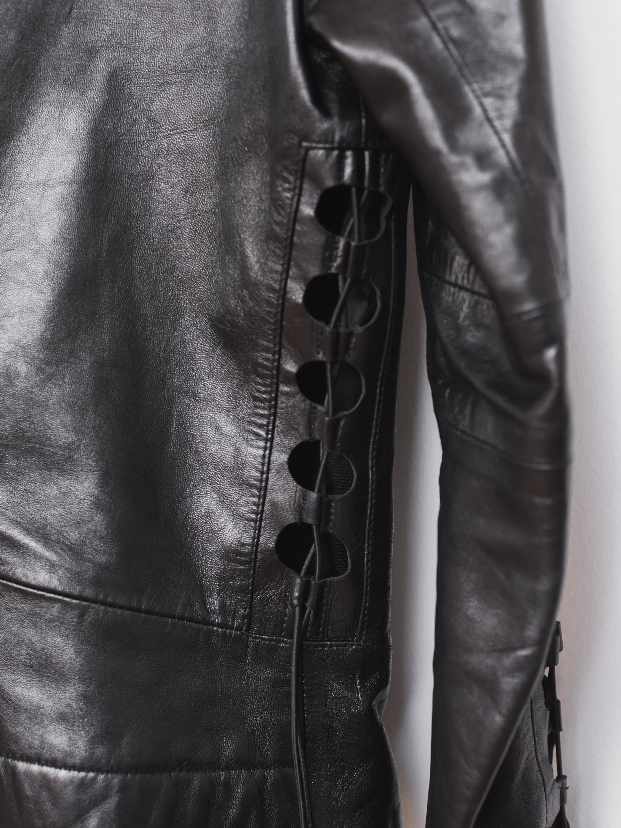 This piece is crafted in a supple sheep leather with an immaculate sheen. Laced corset panels along the body and sleeves open to below, revealing another layer of leather underneath the body and a subtle part of the wearer’s skin in the sleeves. The rest of the piece is finished with impeccably detailed construction, with curved panelling cut to echo the circular geometry of the corset detailing.
