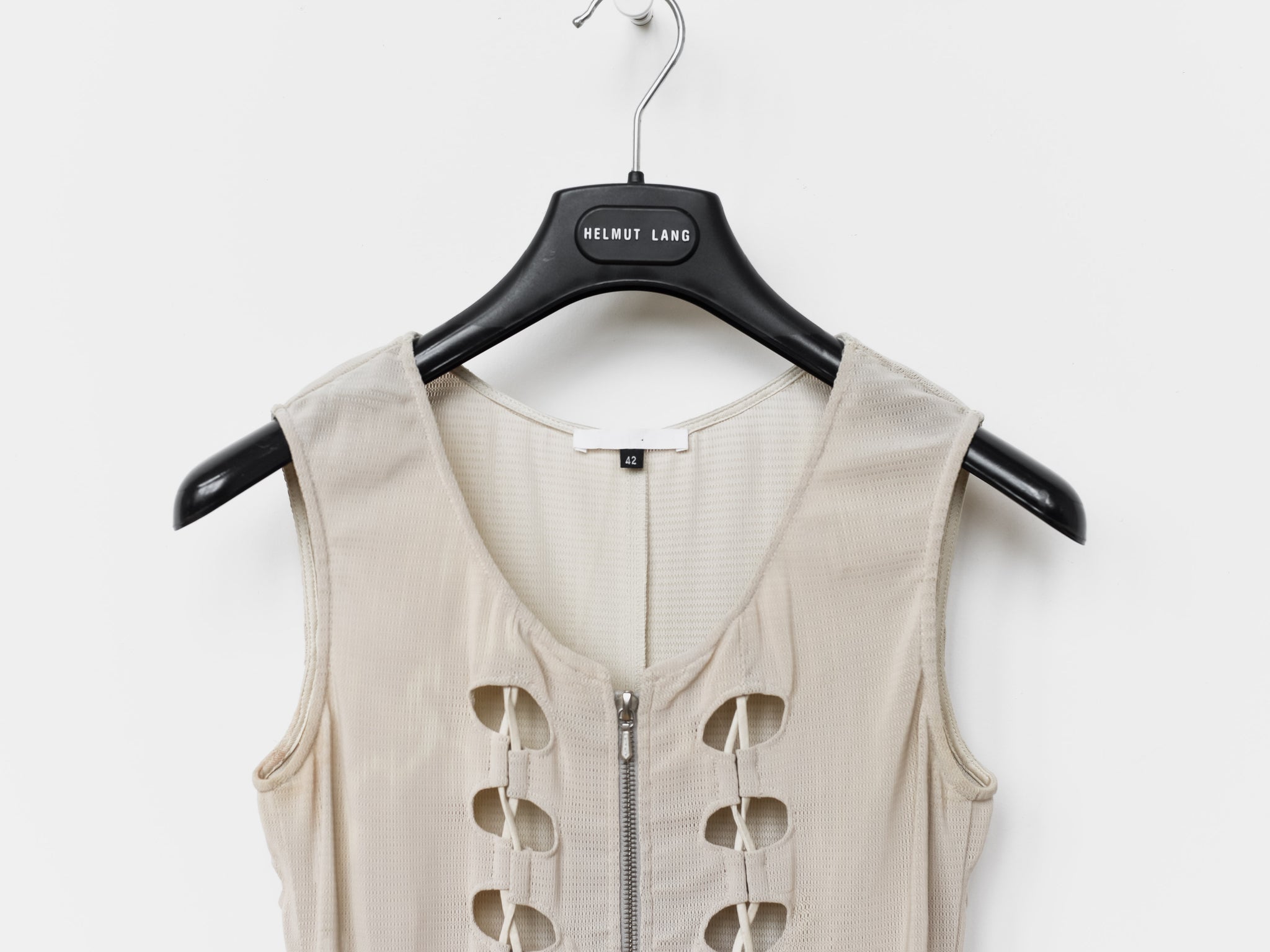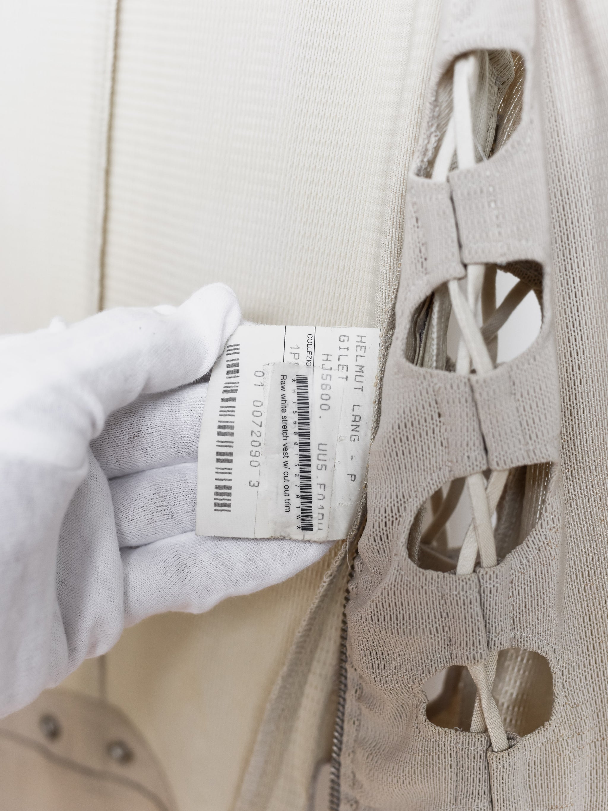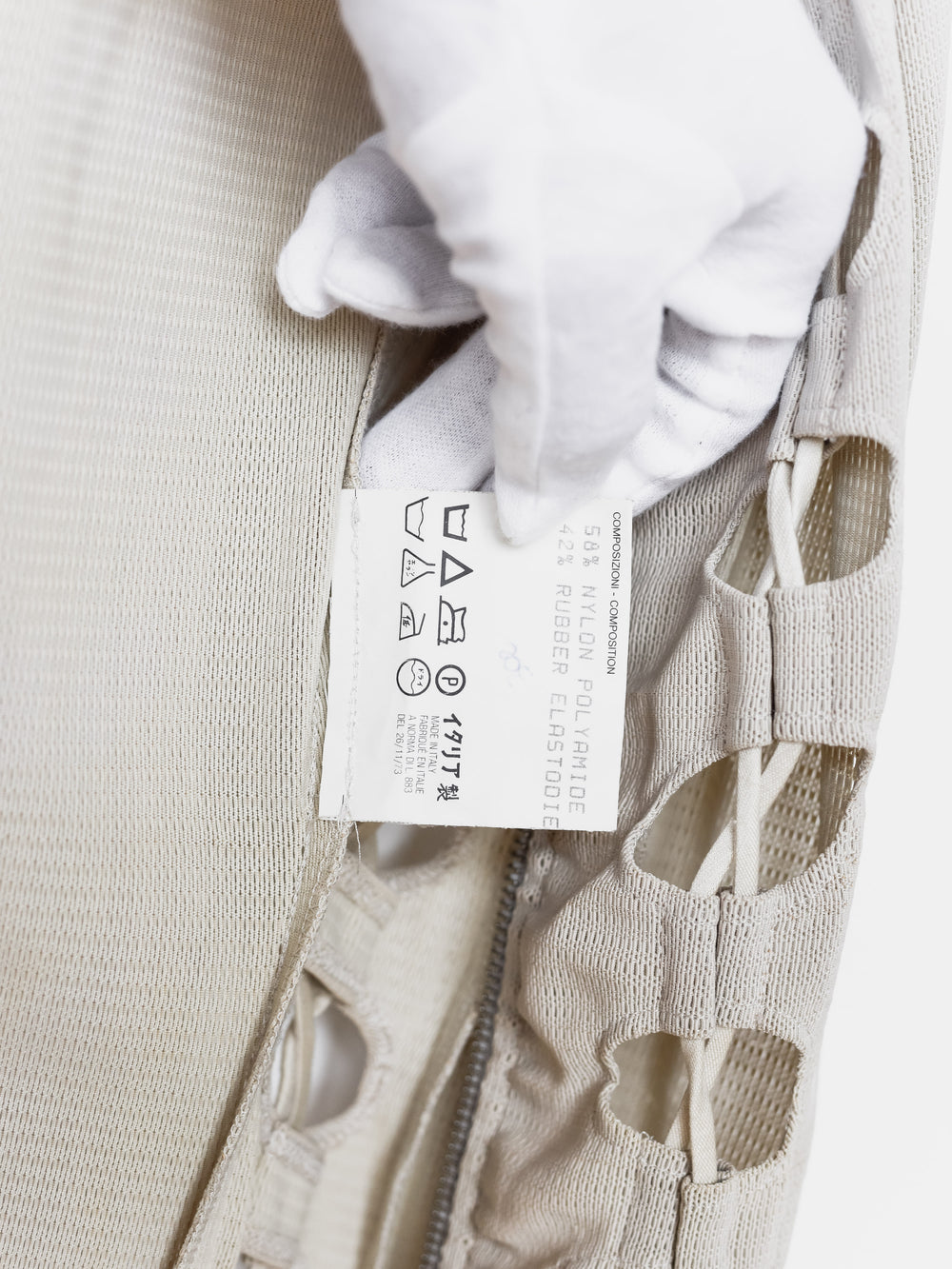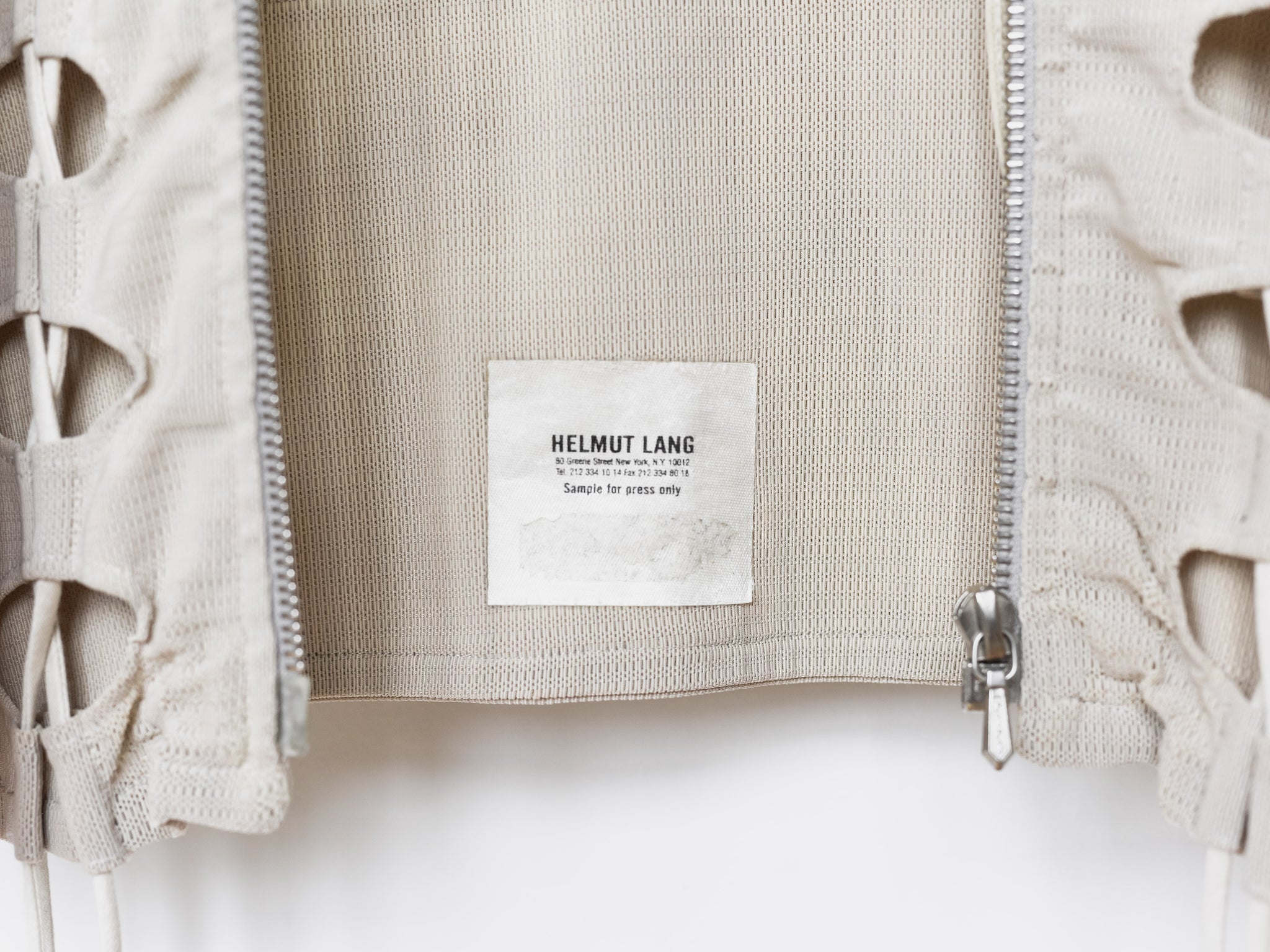 Though this top cannot be seen from any online runway publication, this press sample piece exemplifies the season's carefully crafted deconstruction. Cutouts with adjustable ties along the front and back of the top uniquely subtly expose the wearer's skin and evoke images of a corset along with the form-fitting cut, while the back vents, panelling, and zipper are reminiscent of an athletic motorcycle jacket. The construction in fact, is an exact replication of leather jacket iteration. The back panel wrap around the front of the wearer's waist ending in a perfect anatomic curve consistent with the curved cutouts. The details and perfect execution make this rare press sample a valuable example of Helmut Lang's work throughout SS01 and the early 00s.