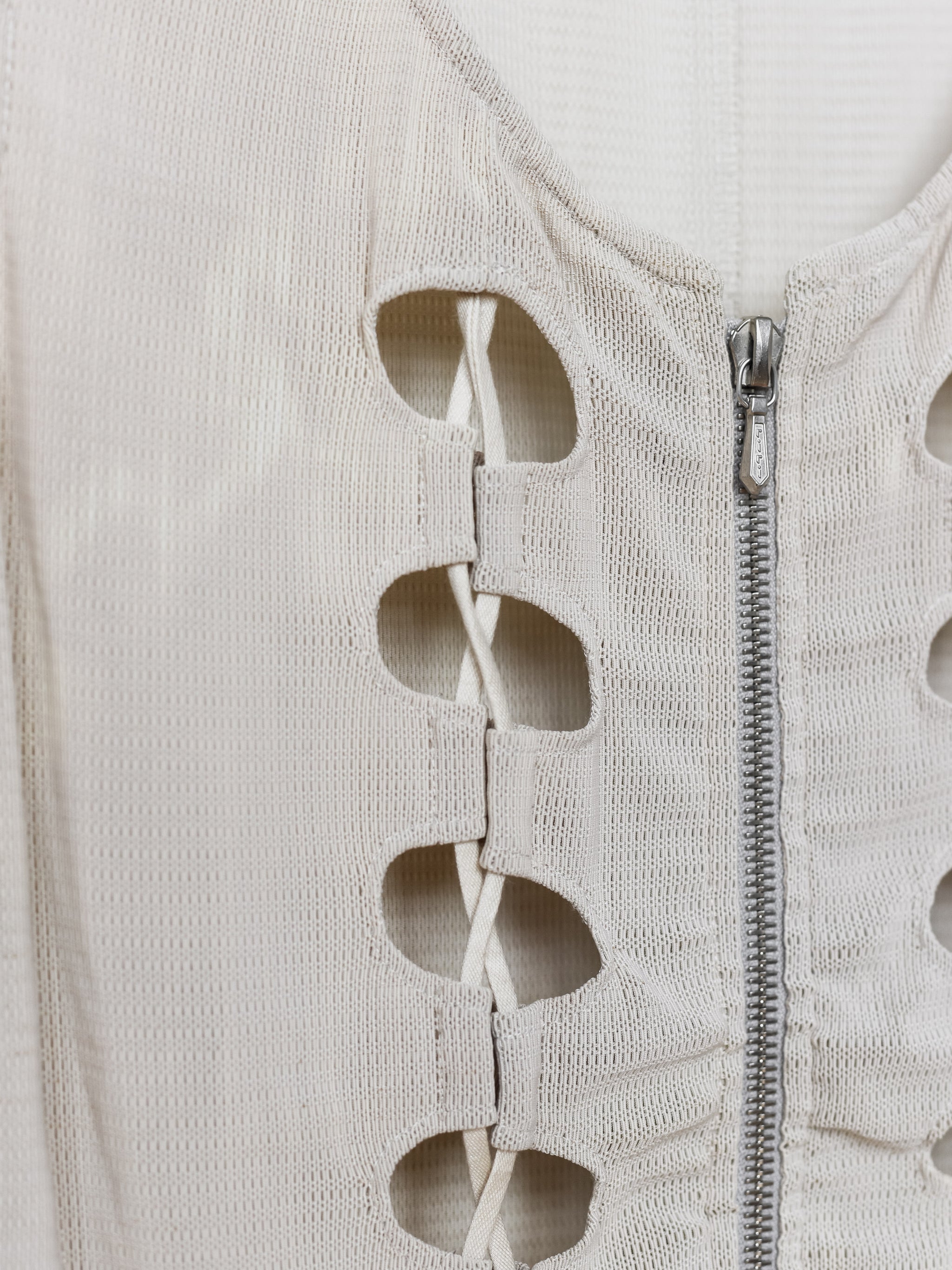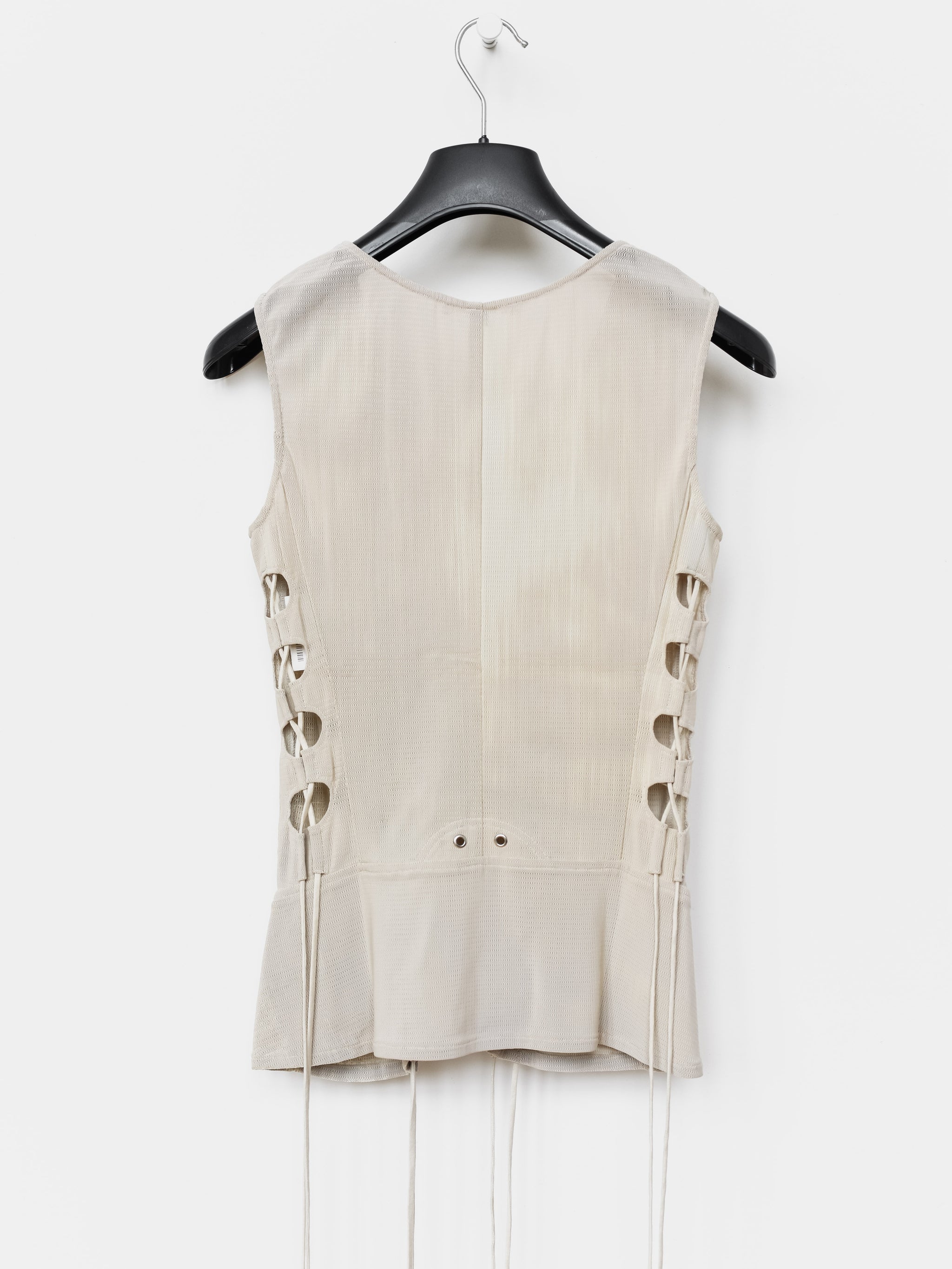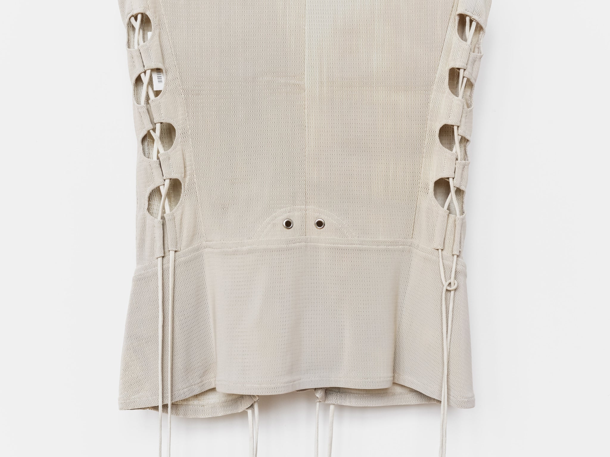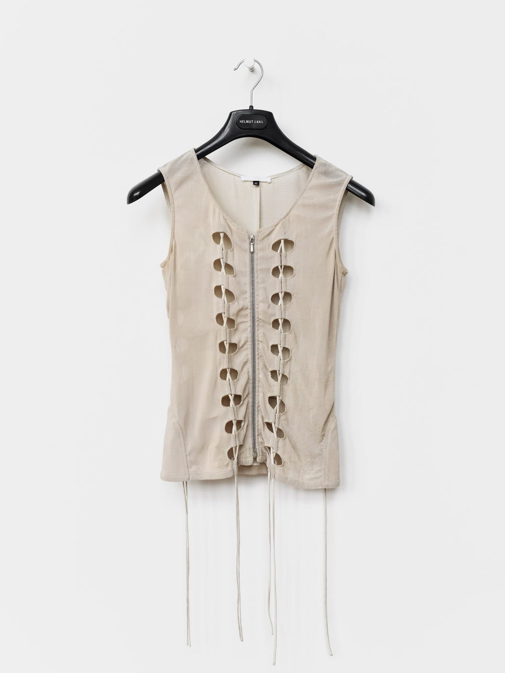 Though this top cannot be seen from any online runway publication, this press sample piece exemplifies the season's carefully crafted deconstruction. Cutouts with adjustable ties along the front and back of the top uniquely subtly expose the wearer's skin and evoke images of a corset along with the form-fitting cut, while the back vents, panelling, and zipper are reminiscent of an athletic motorcycle jacket. The construction in fact, is an exact replication of leather jacket iteration. The back panel wrap around the front of the wearer's waist ending in a perfect anatomic curve consistent with the curved cutouts. The details and perfect execution make this rare press sample a valuable example of Helmut Lang's work throughout SS01 and the early 00s.