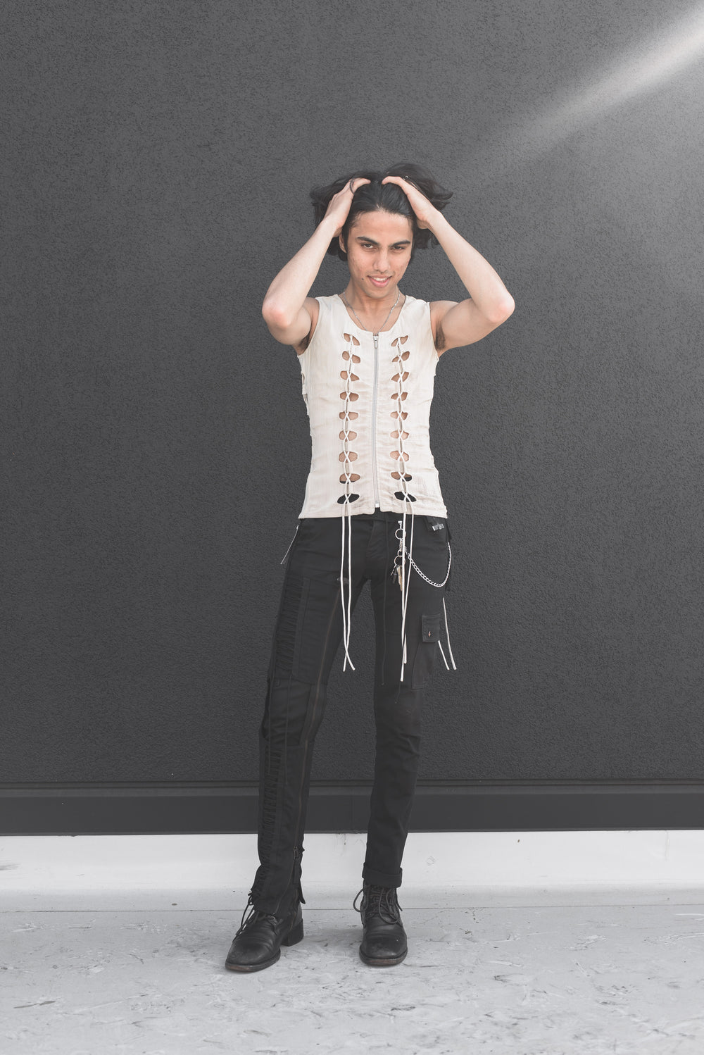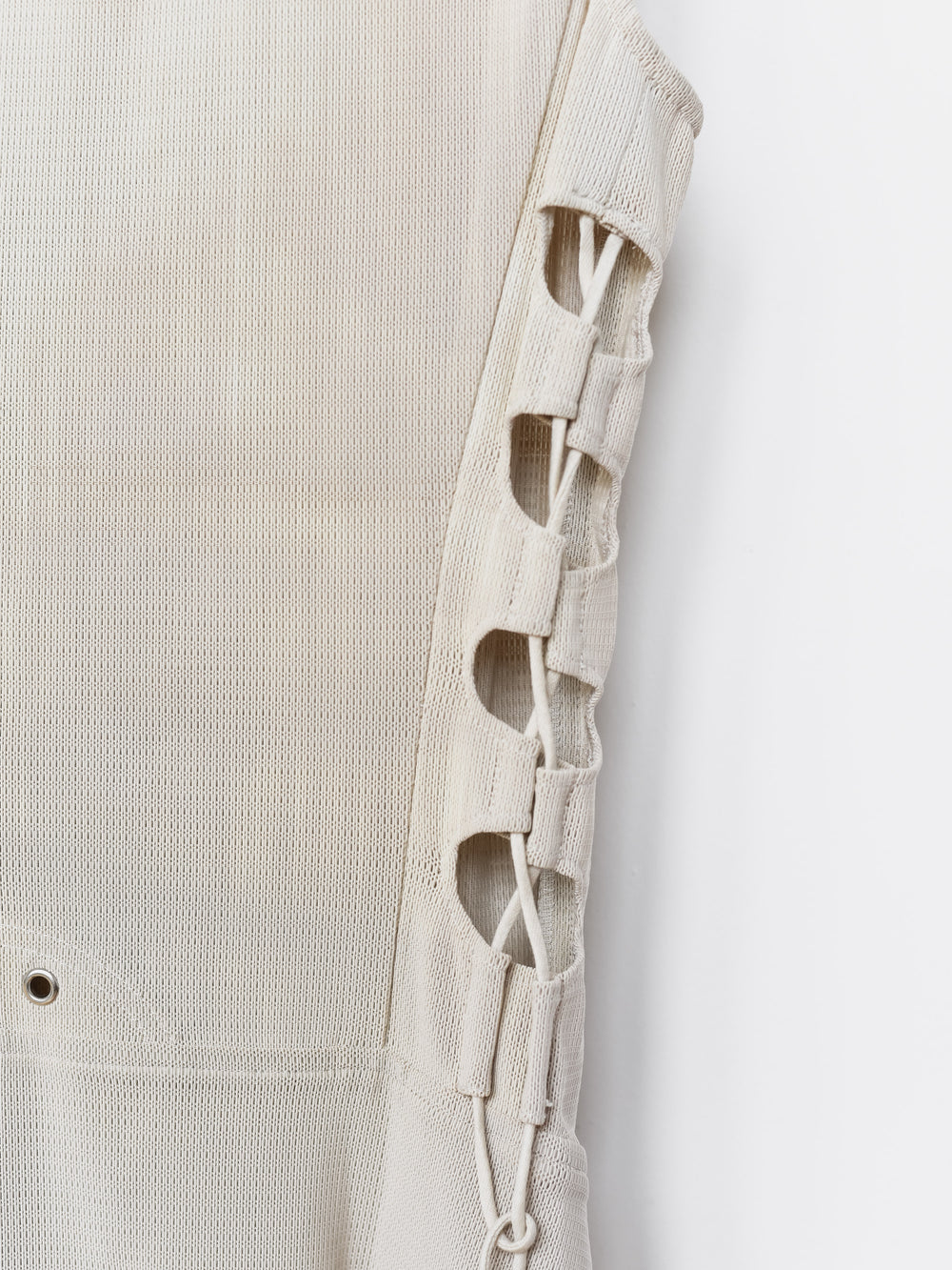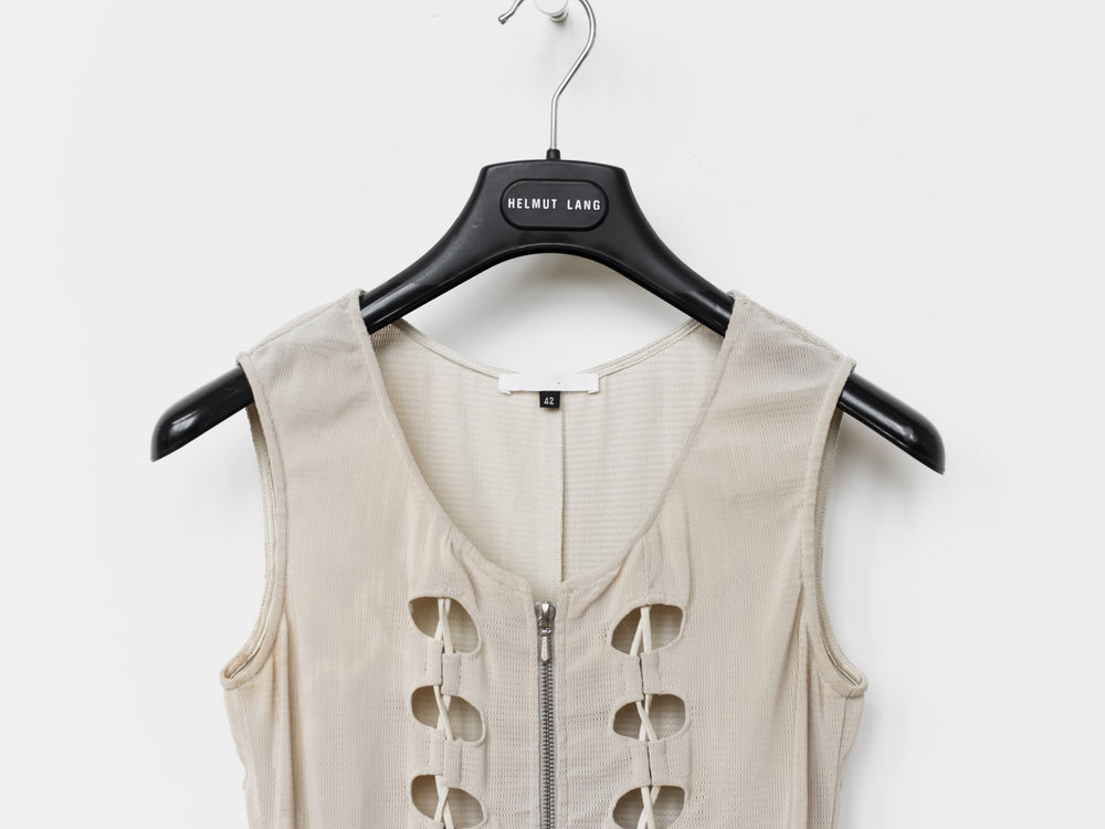 "Helmut Lang has often been praised for his 'deconstructive' designs. With basic garment forms as the starting point, Lang created subversively elegant and abstract designs that combined the classic with the avant-garde. This experimentation was amply demonstrated in S/S 2001, where Lang explored ways of revealing the body. Cut-outs and laces were used to decorate tops, trousers and outerwear, while dresses featured straps and perforations that created a subtle yet sensual effect.The wearer's body is highlighted and in turn becomes an essential component of the design itself. S/S 2001 can thus be understood as a quintessential Helmut Lang collection, combining his cerebral conceptualism with a new sense ofraw-yet-refined sexiness." - Endyma