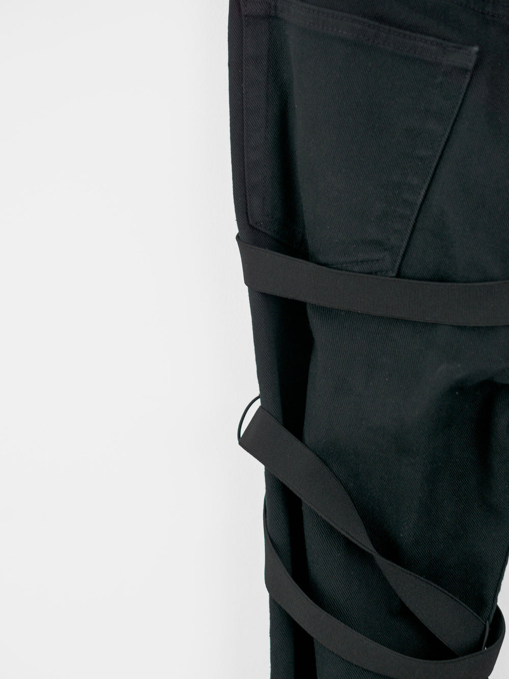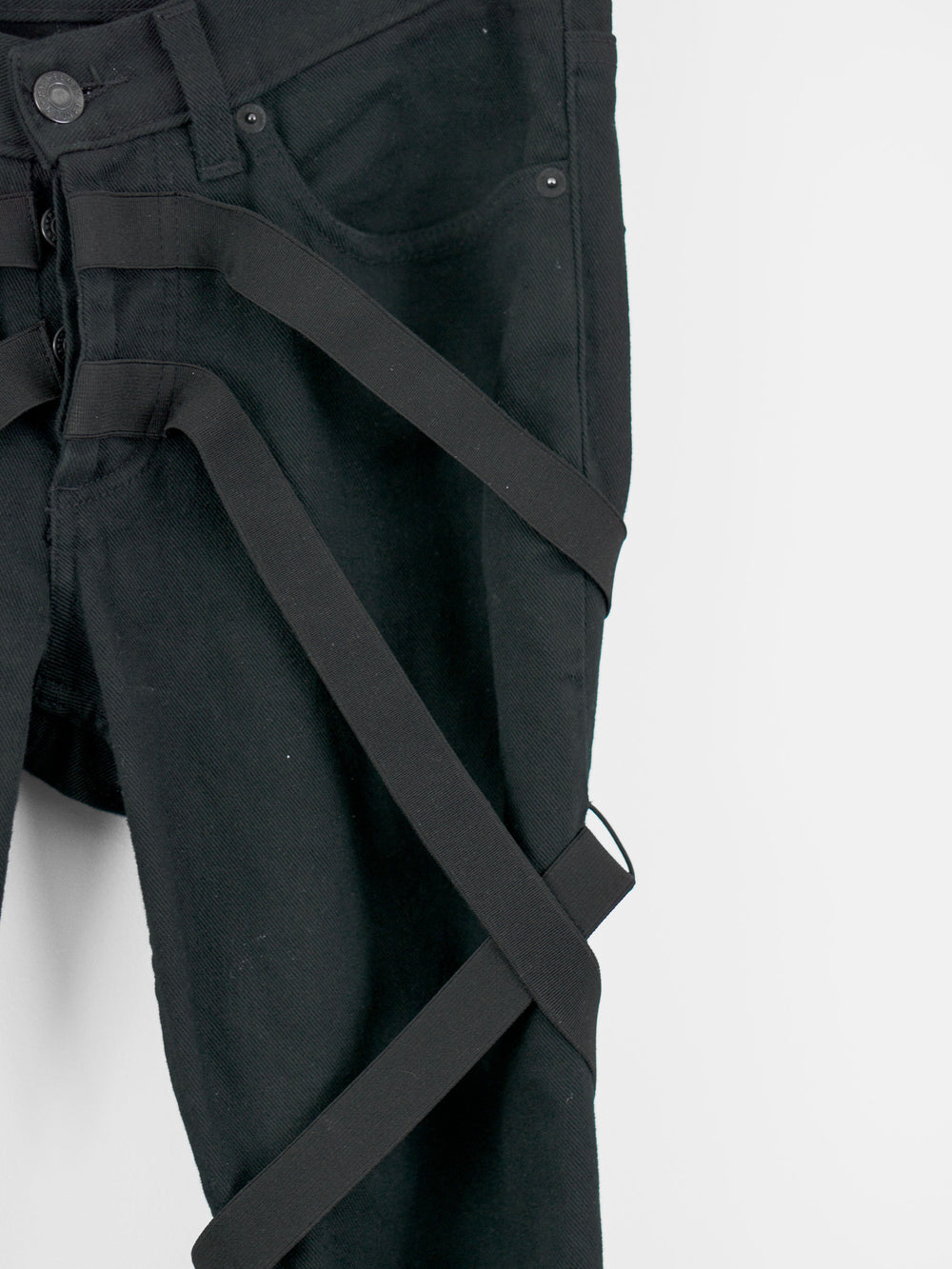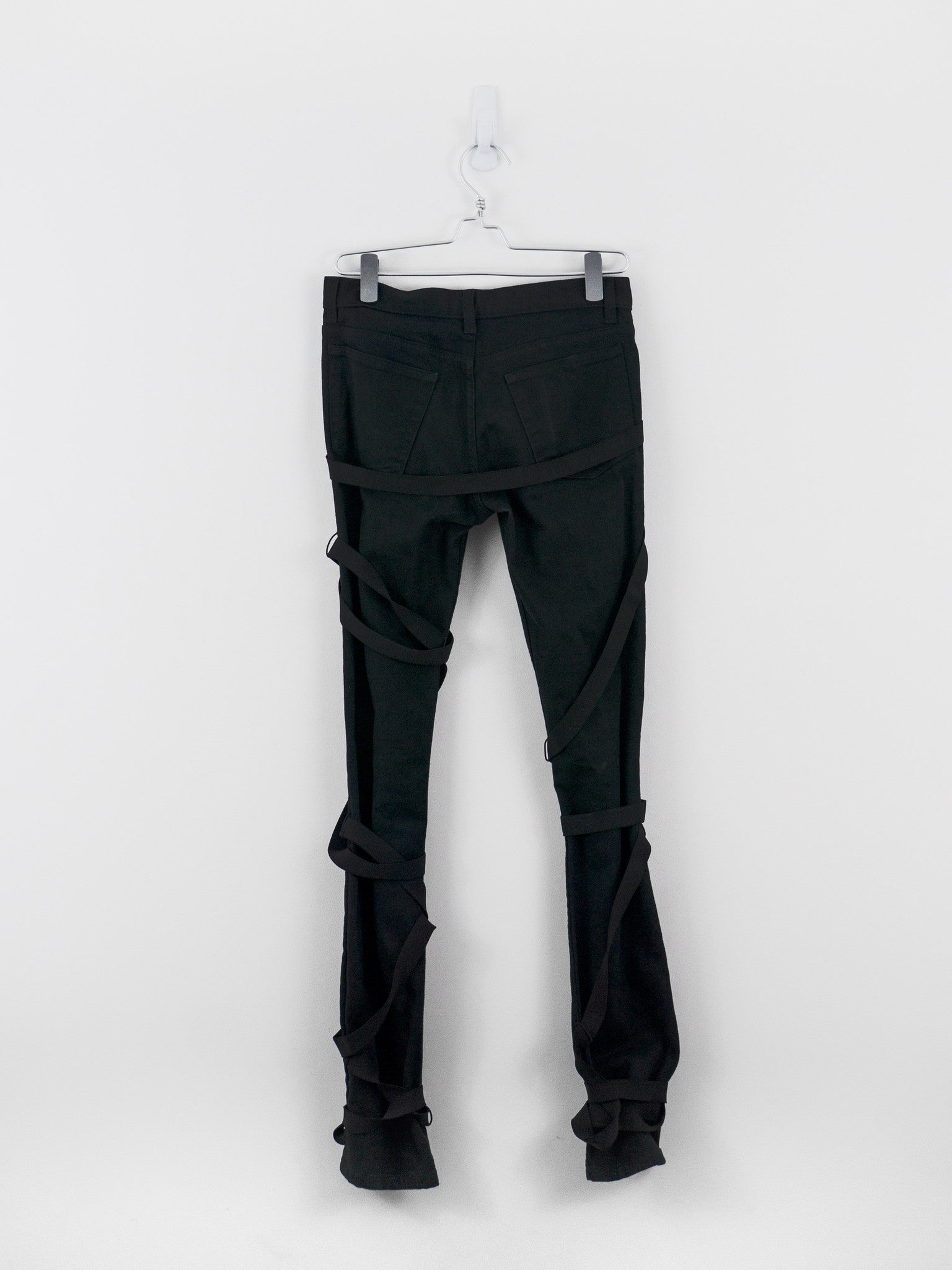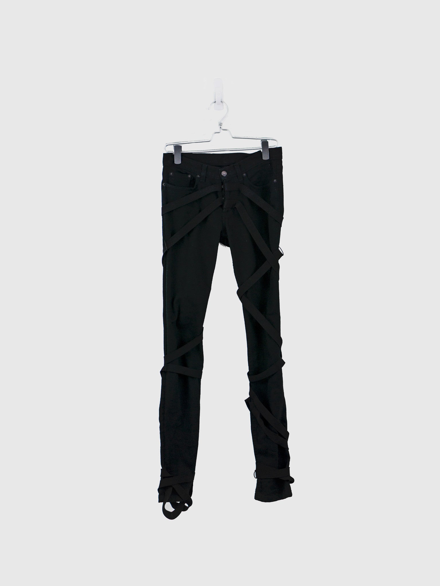 These are the iconic mummy jeans from Helmut Lang’s Spring/Summer 2004 collection done in a slim-cut stretch denim. Elastic straps feature along the legs and seat, giving this pair a striking visual impression and a unique tactile sensation when worn—a manifestation of Helmut’s oft-utilized bondage theme. Each of these jeans seem to feature a different application of the elastic straps, making them not only violently beautiful but also distinctively unique to the owner. This feature is also elaborated on by the ability to customize the shape and fit of the denim by adjusting the straps. A truly wonderful garment and one of Lang's shining moments.