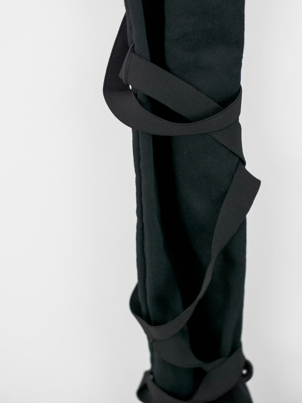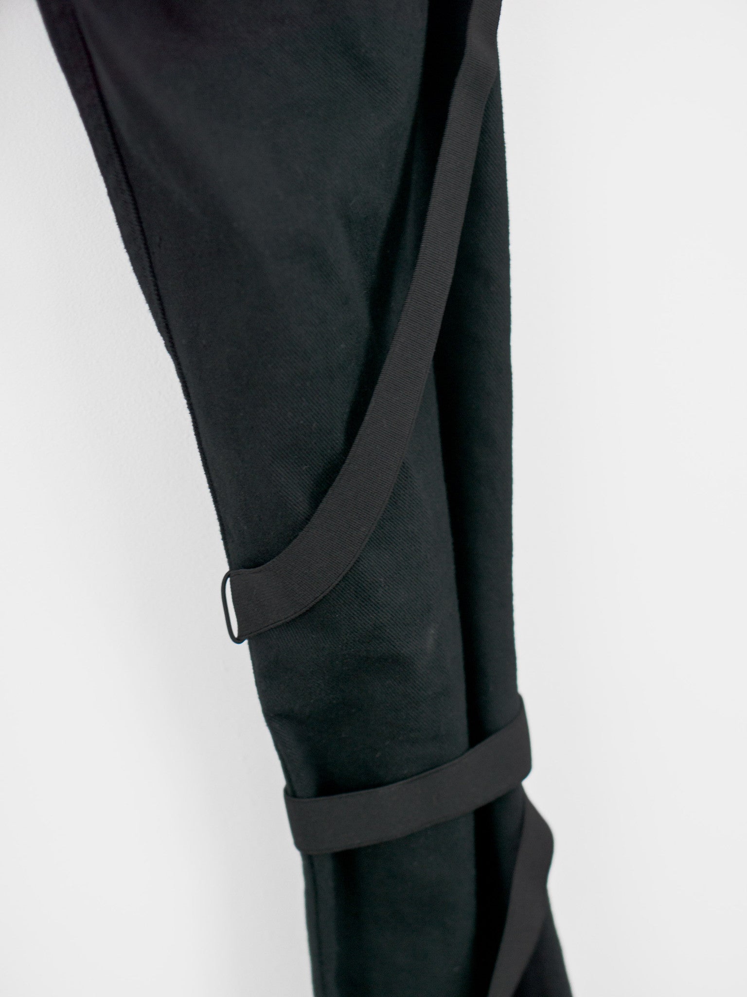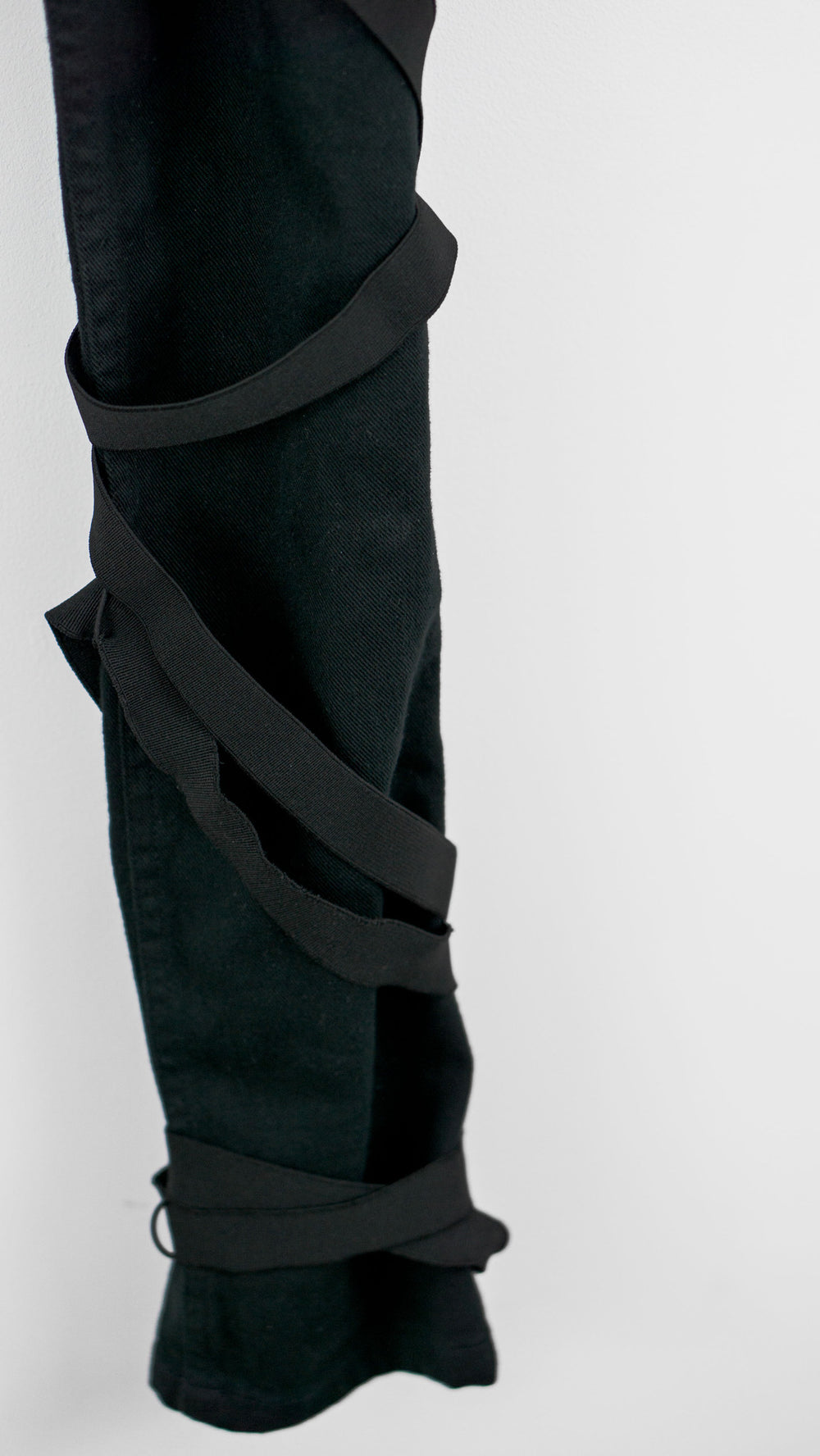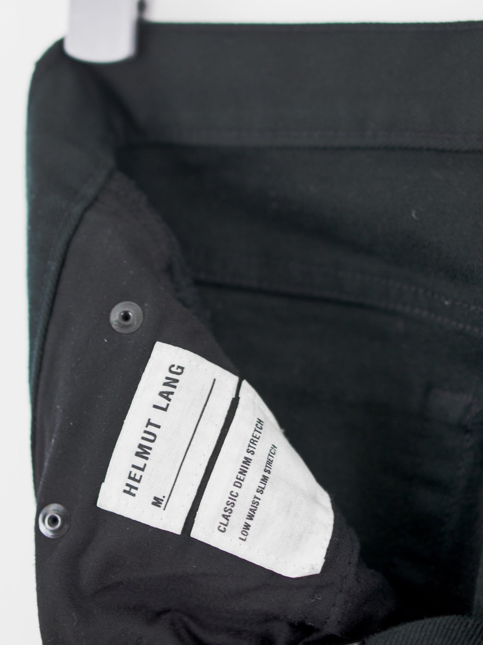 These are the iconic mummy jeans from Helmut Lang’s Spring/Summer 2004 collection done in a slim-cut stretch denim. Elastic straps feature along the legs and seat, giving this pair a striking visual impression and a unique tactile sensation when worn—a manifestation of Helmut’s oft-utilized bondage theme. Each of these jeans seem to feature a different application of the elastic straps, making them not only violently beautiful but also distinctively unique to the owner. This feature is also elaborated on by the ability to customize the shape and fit of the denim by adjusting the straps. A truly wonderful garment and one of Lang's shining moments.