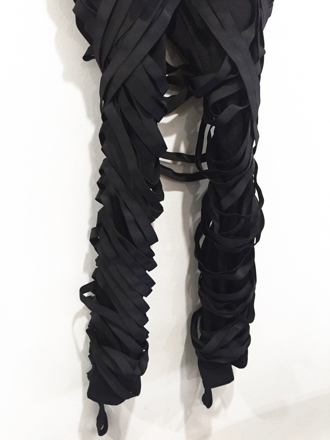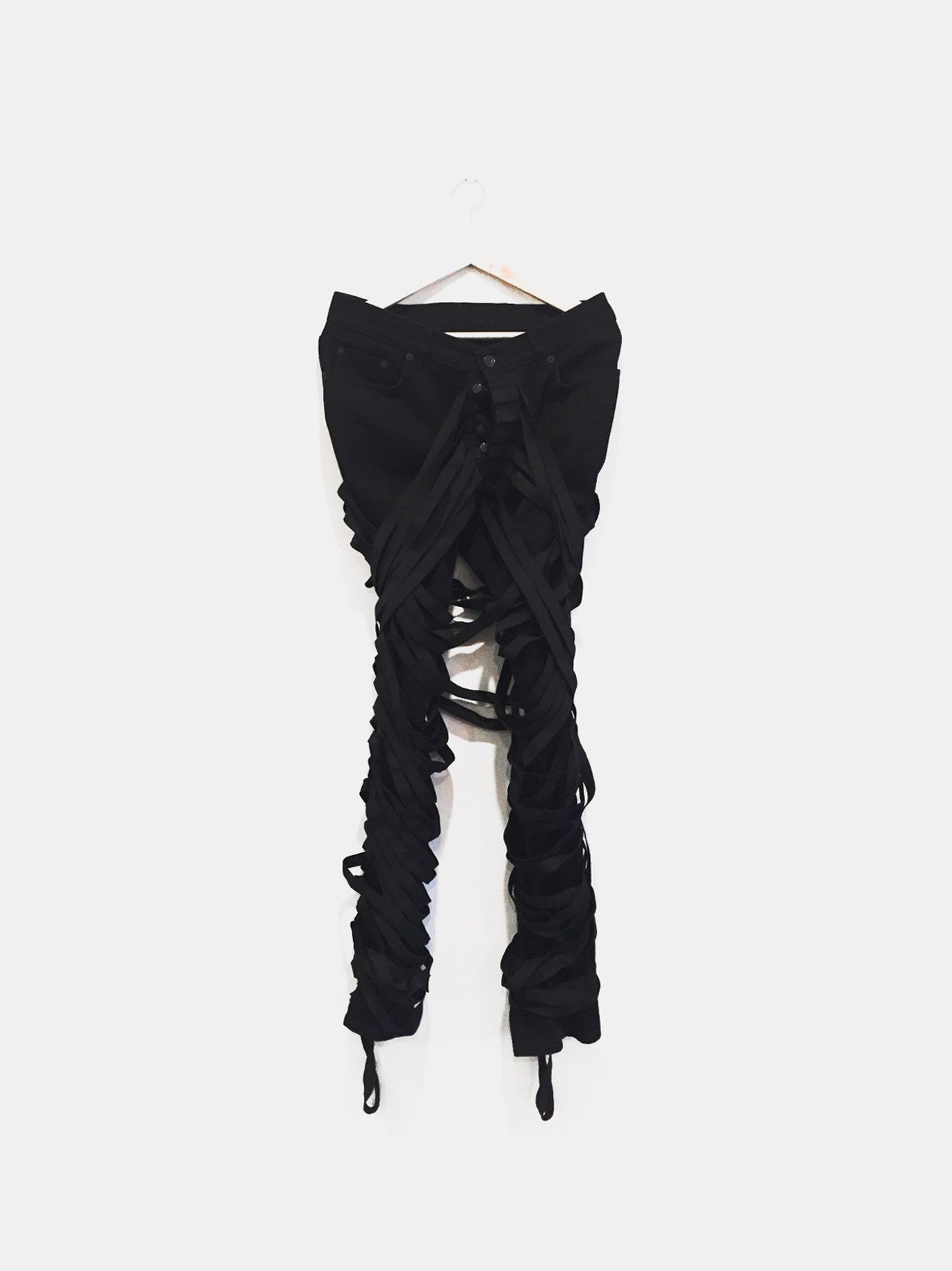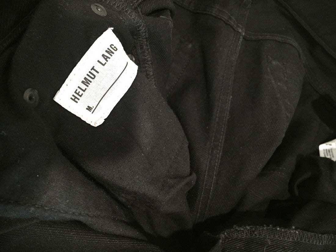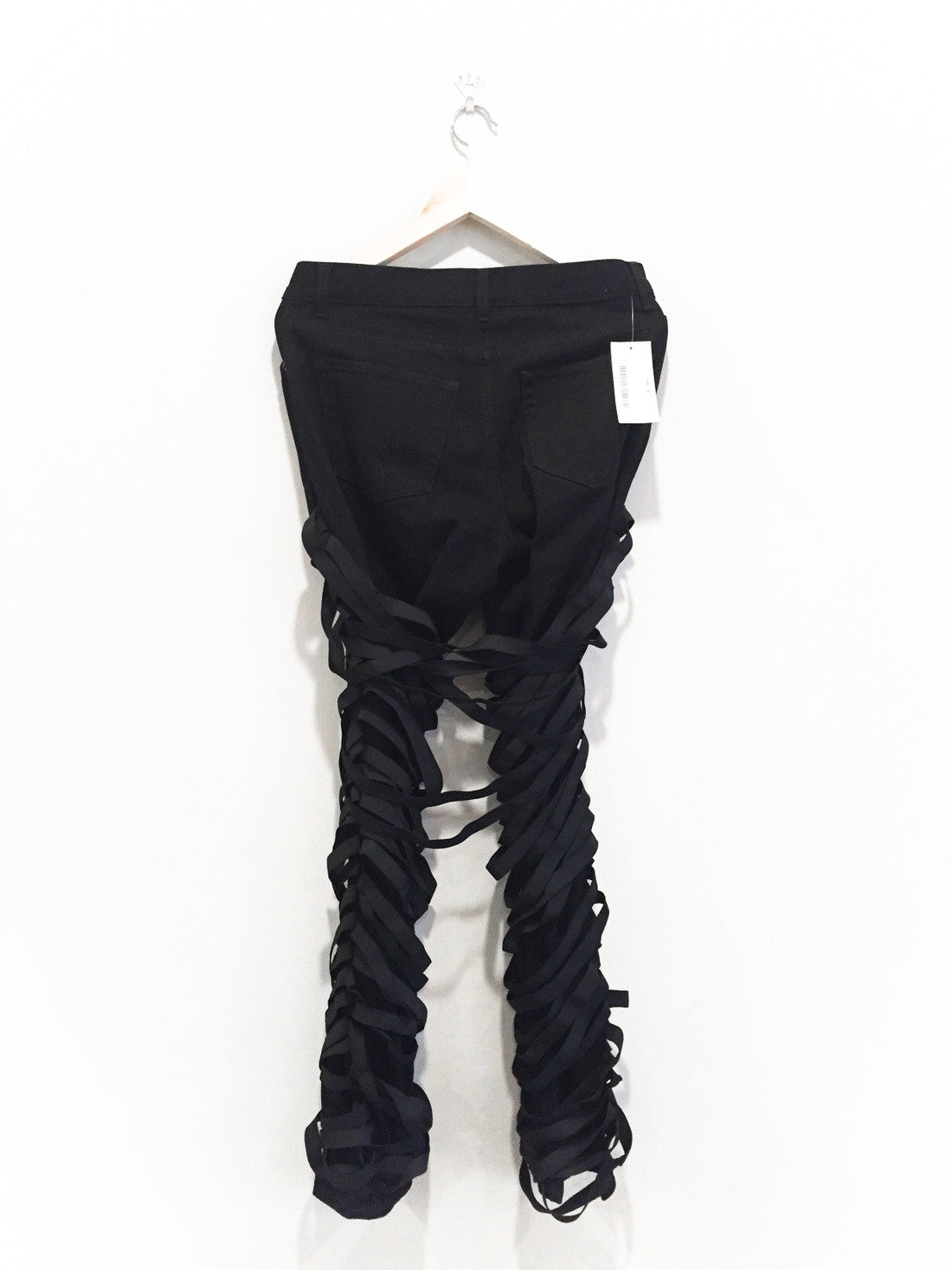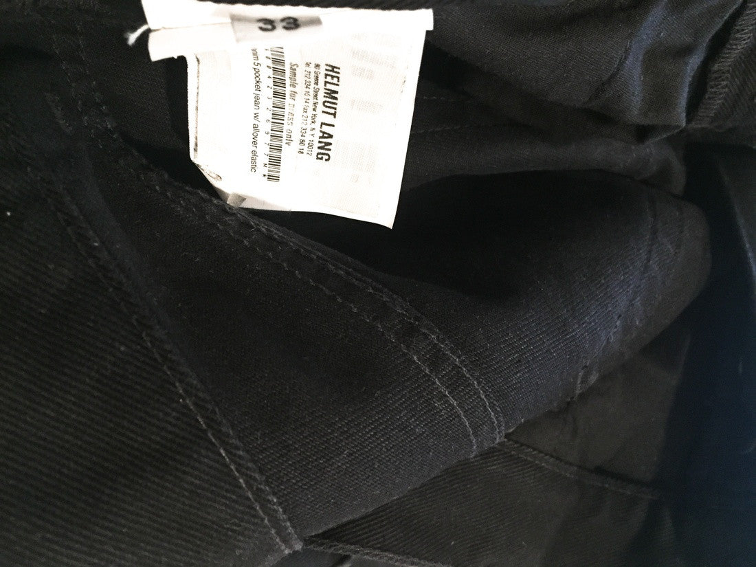 These are the iconic mummy jeans from Helmut Lang’s Spring/Summer 2004 collection done in a slim-cut stretch denim. Elastic straps feature along the legs and seat, giving this pair a striking visual impression when seen and a unique tactile sensation when worn—a manifestation of Helmut’s oft-utilized bondage theme. This pair is a “sample for press only” as is denoted on the tag, a piece of history possibly used for the famous Helmut Lang ad campaigns.