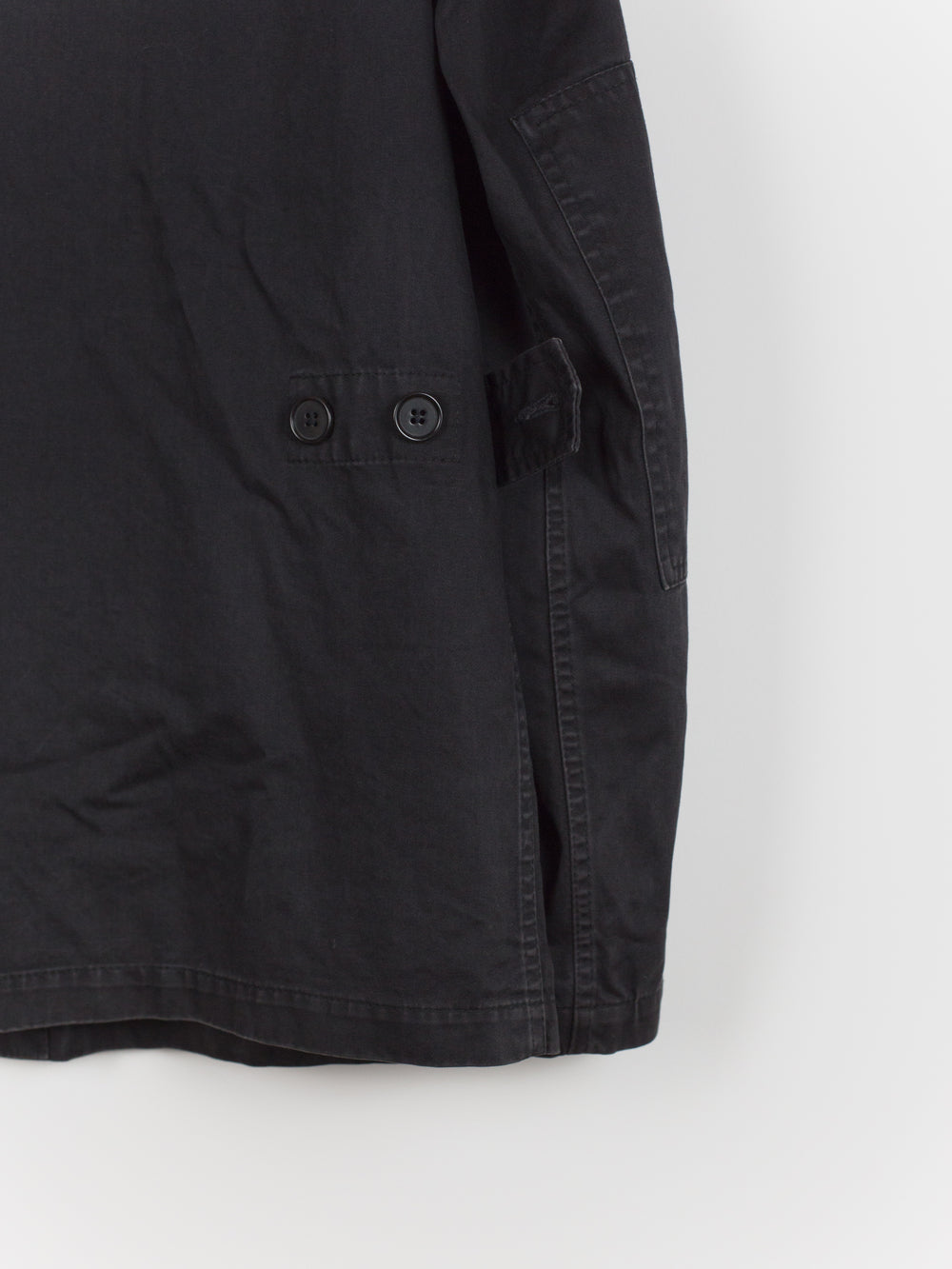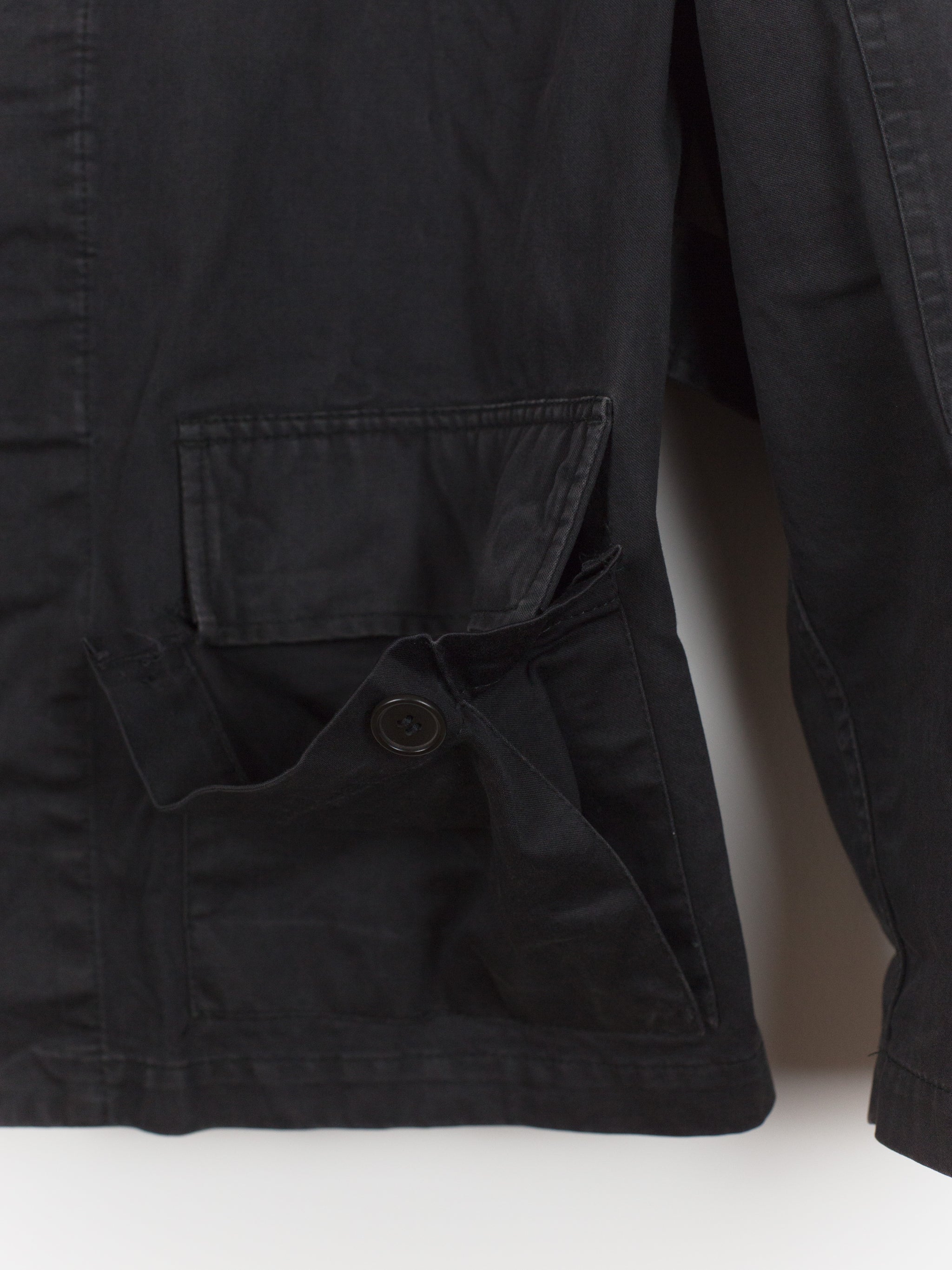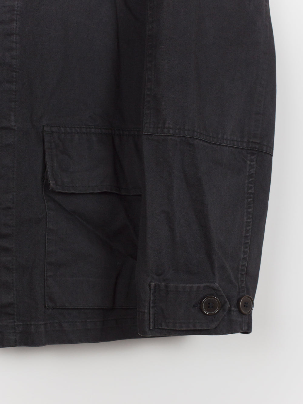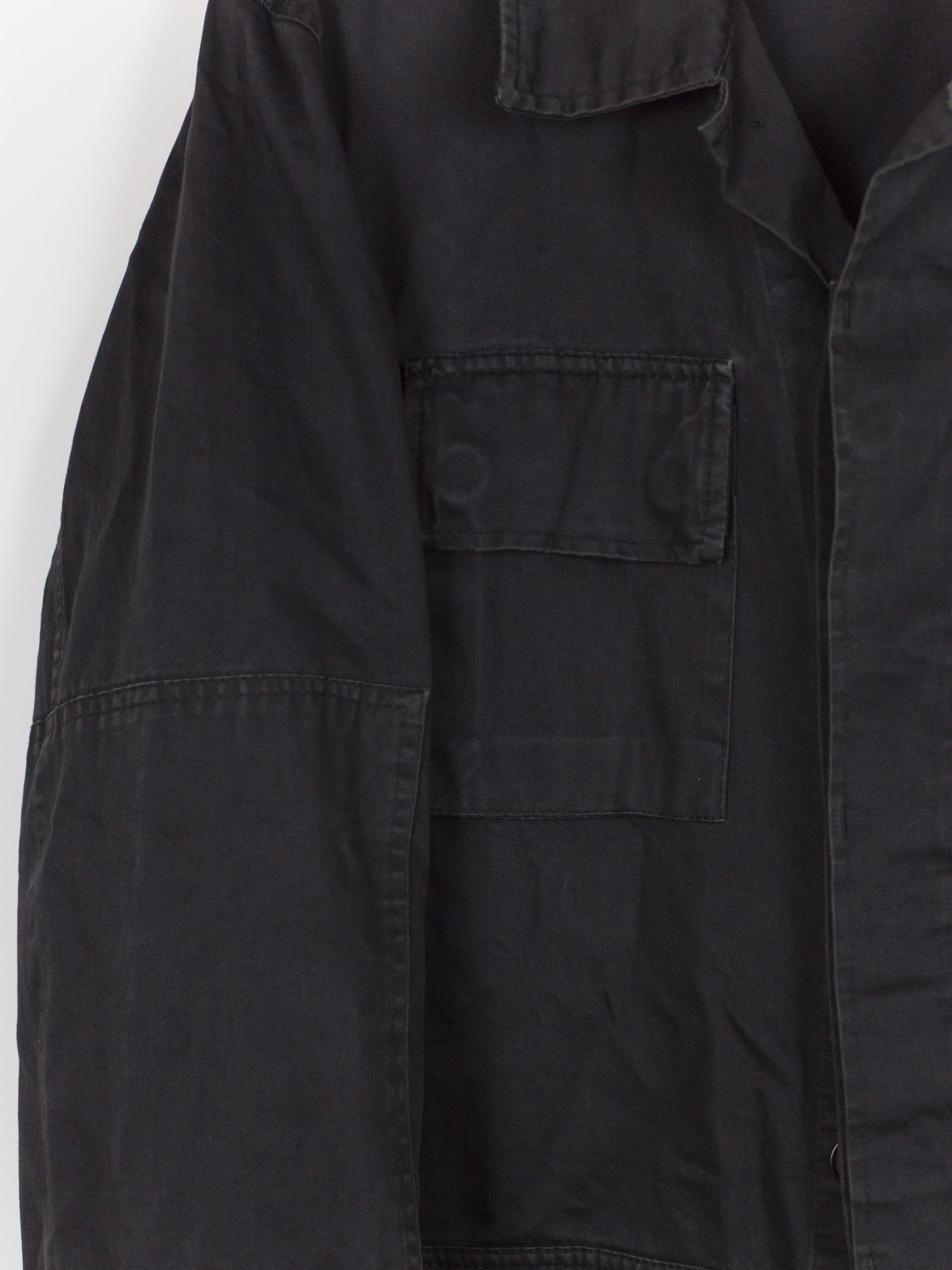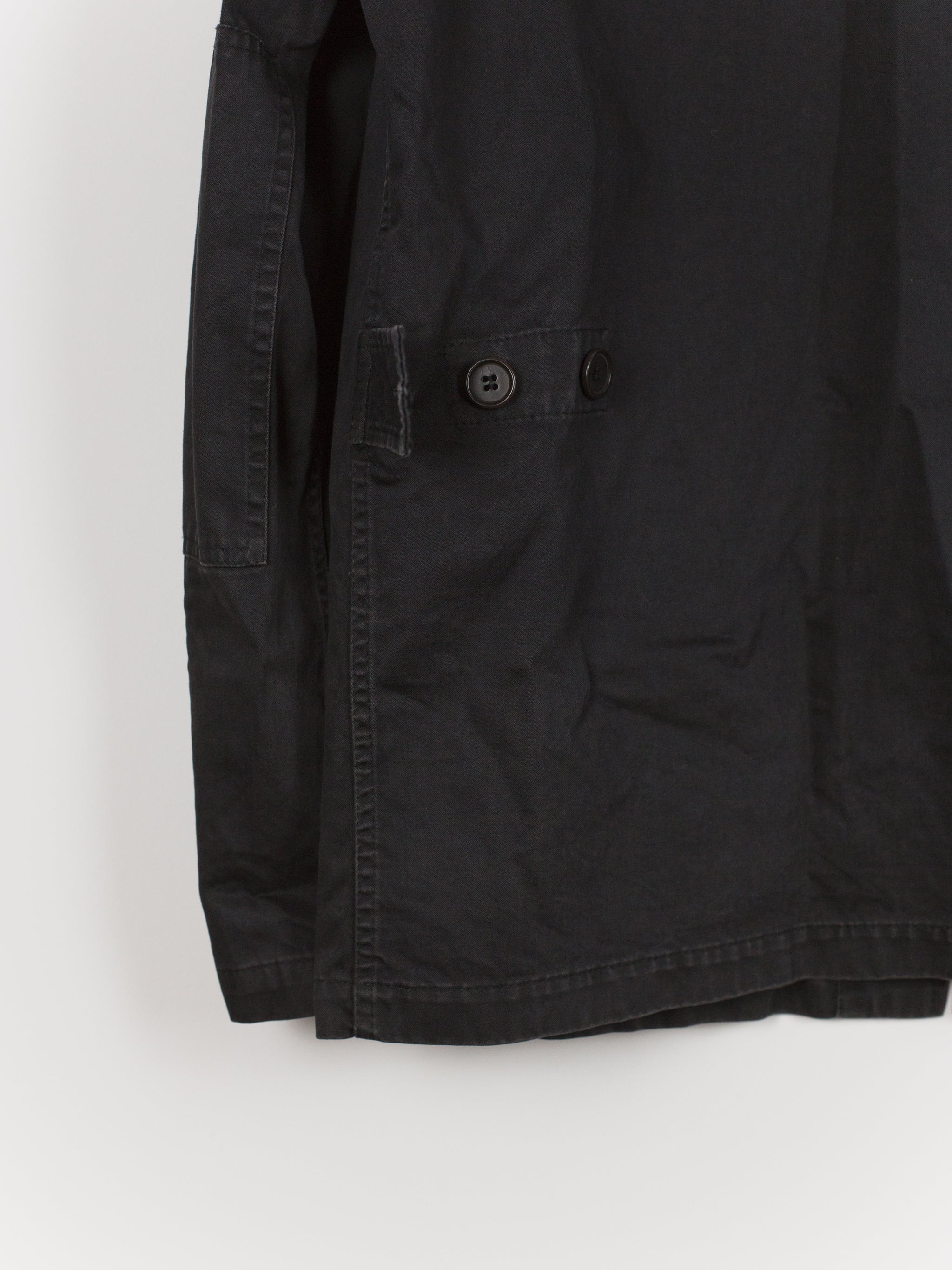 A brilliant minimalist interpretation of a menswear archetype, this BDU-style jacket sees a luxury makeover with discreet hidden button-closure at clean, squared off patch pockets and geometric sleeve patches. Cut in a dense and soft aged cotton, the piece is at once protective and comfortable. Almost none of the button closures are seen, lending the jacket a distinctly texturally uniform and minimal atmosphere. A beautiful patina has developed along the seams. Classic, yet forward, this BDU is the perfect transition and layering piece.