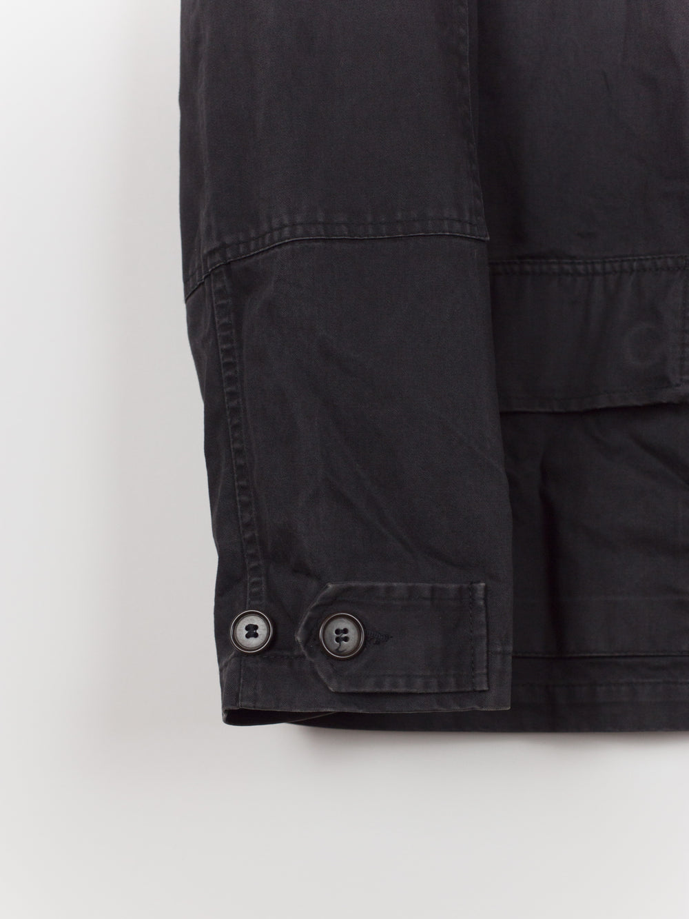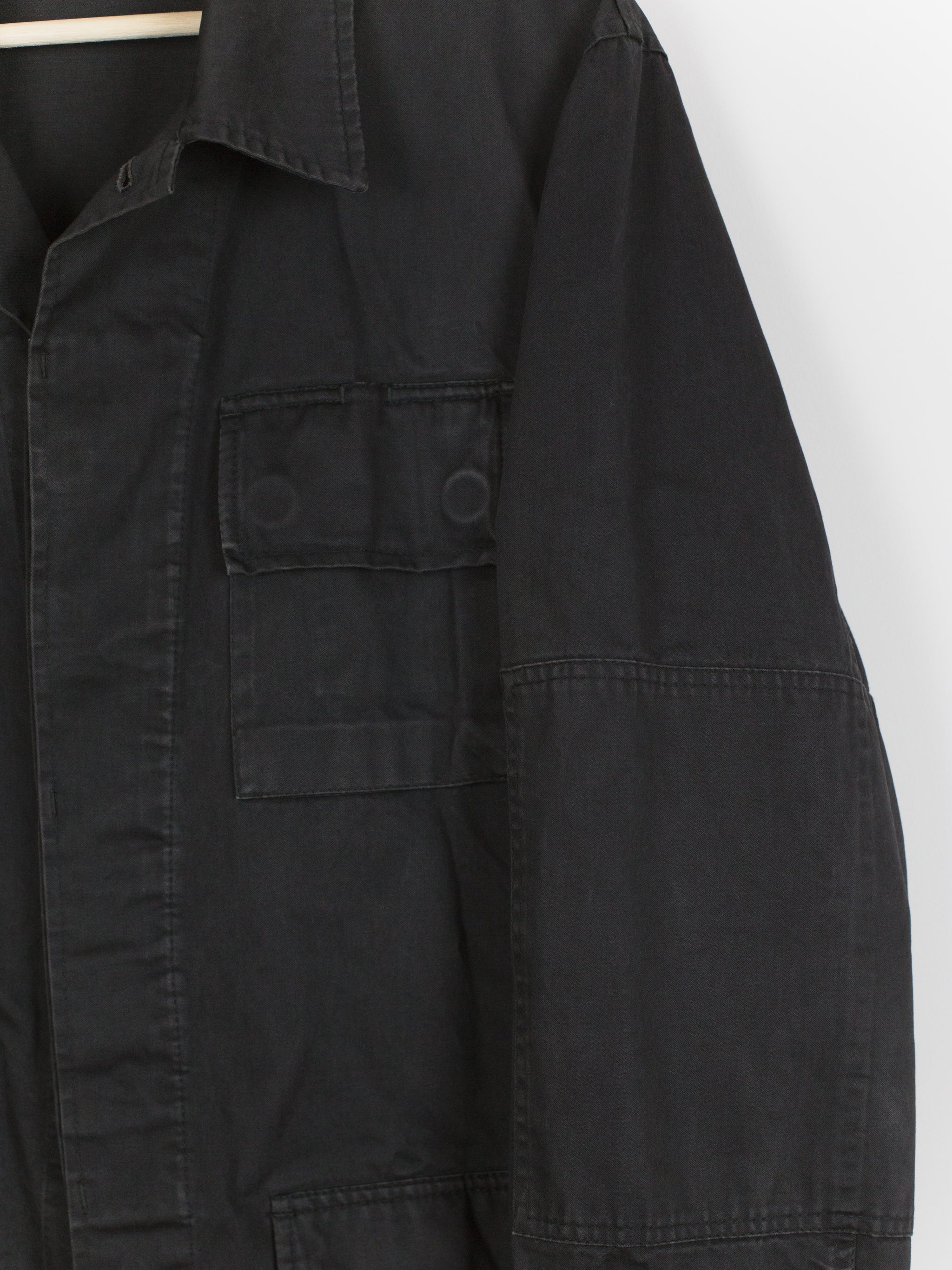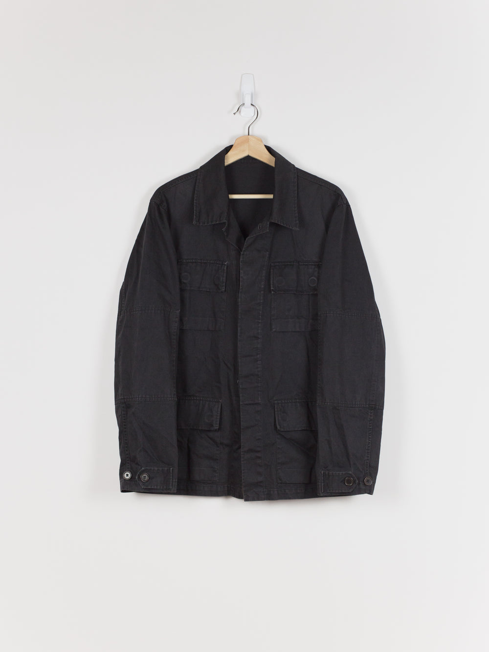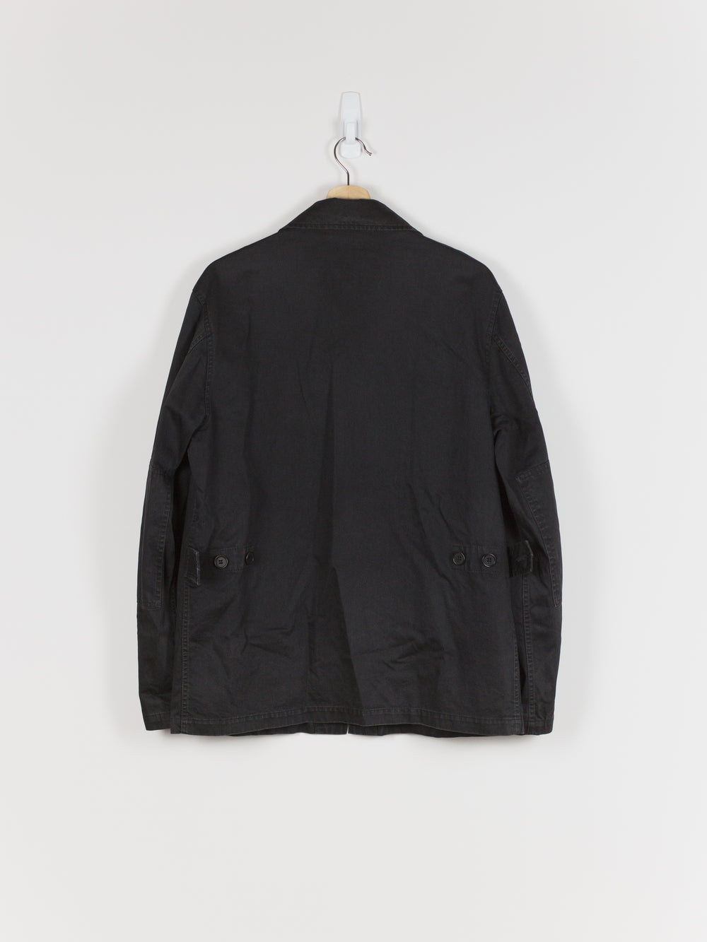 A brilliant minimalist interpretation of a menswear archetype, this BDU-style jacket sees a luxury makeover with discreet hidden button-closure at clean, squared off patch pockets and geometric sleeve patches. Cut in a dense and soft aged cotton, the piece is at once protective and comfortable. Almost none of the button closures are seen, lending the jacket a distinctly texturally uniform and minimal atmosphere. A beautiful patina has developed along the seams. Classic, yet forward, this BDU is the perfect transition and layering piece.