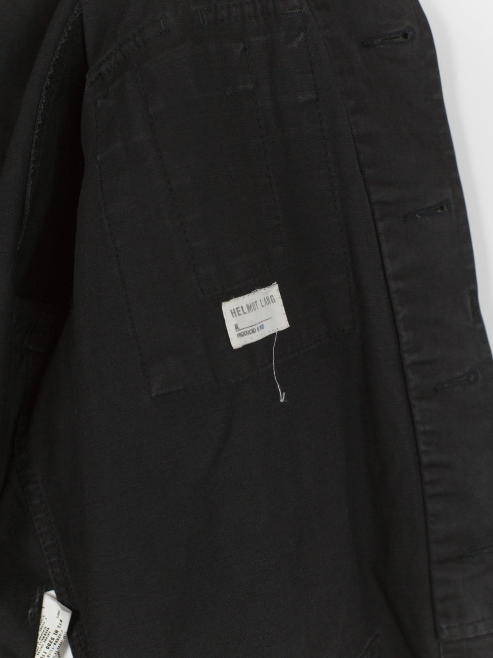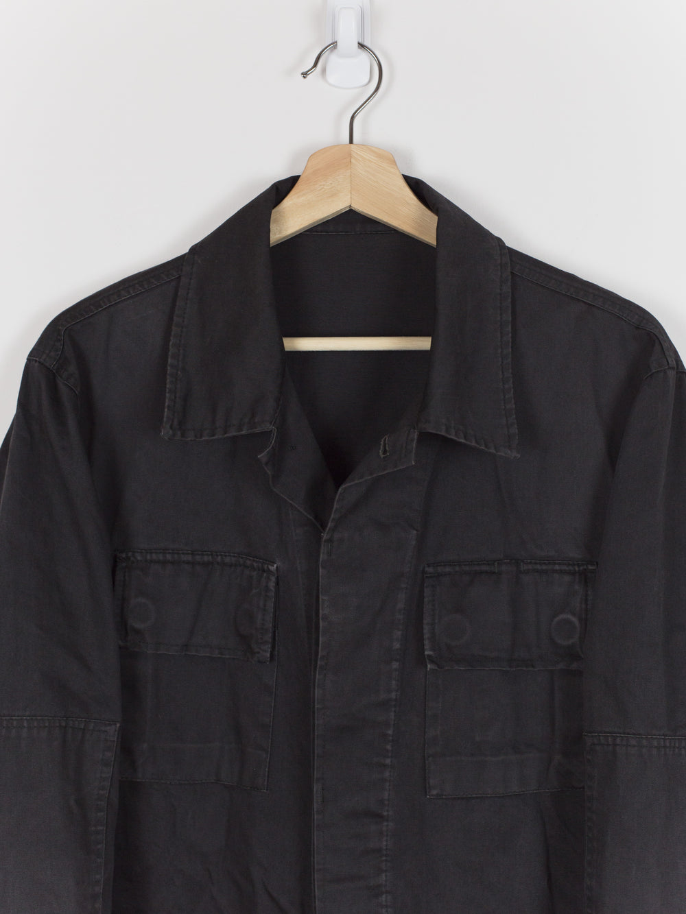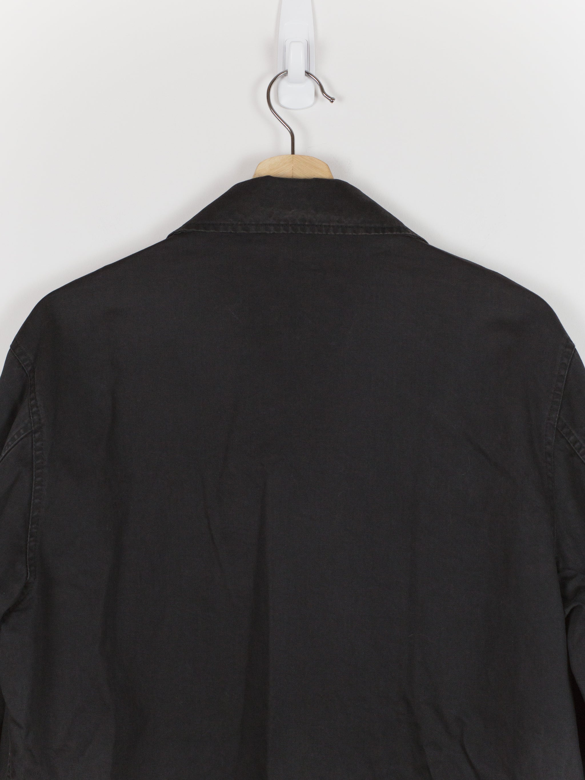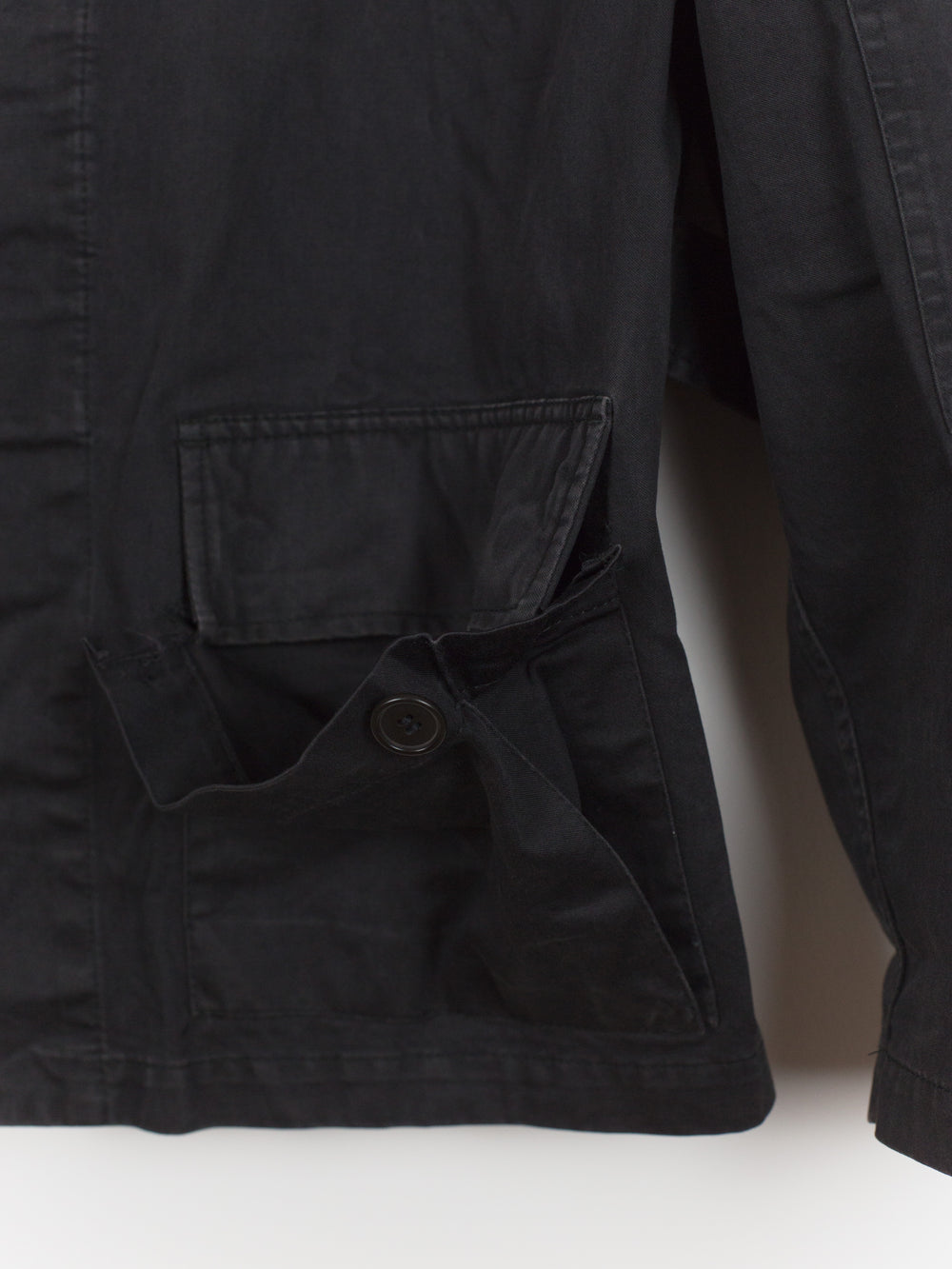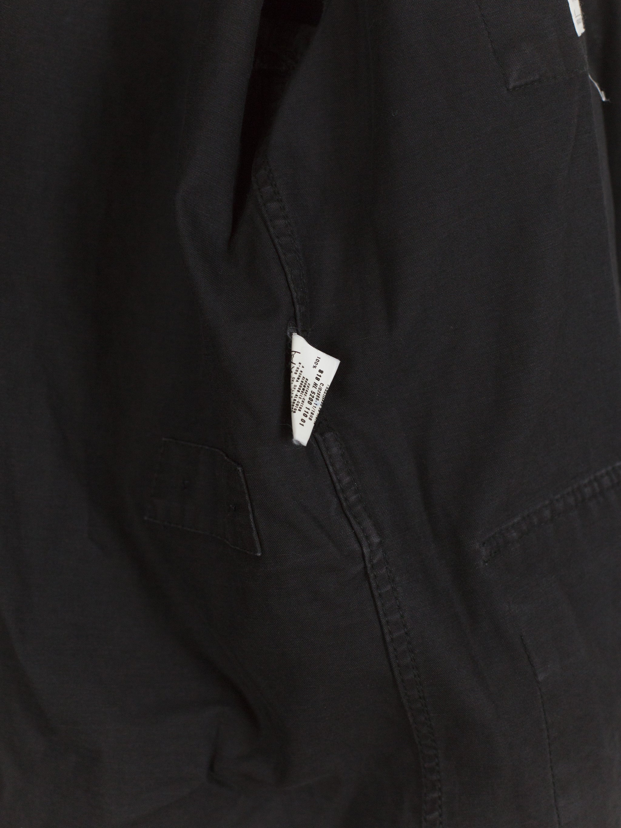 A brilliant minimalist interpretation of a menswear archetype, this BDU-style jacket sees a luxury makeover with discreet hidden button-closure at clean, squared off patch pockets and geometric sleeve patches. Cut in a dense and soft aged cotton, the piece is at once protective and comfortable. Almost none of the button closures are seen, lending the jacket a distinctly texturally uniform and minimal atmosphere. A beautiful patina has developed along the seams. Classic, yet forward, this BDU is the perfect transition and layering piece.