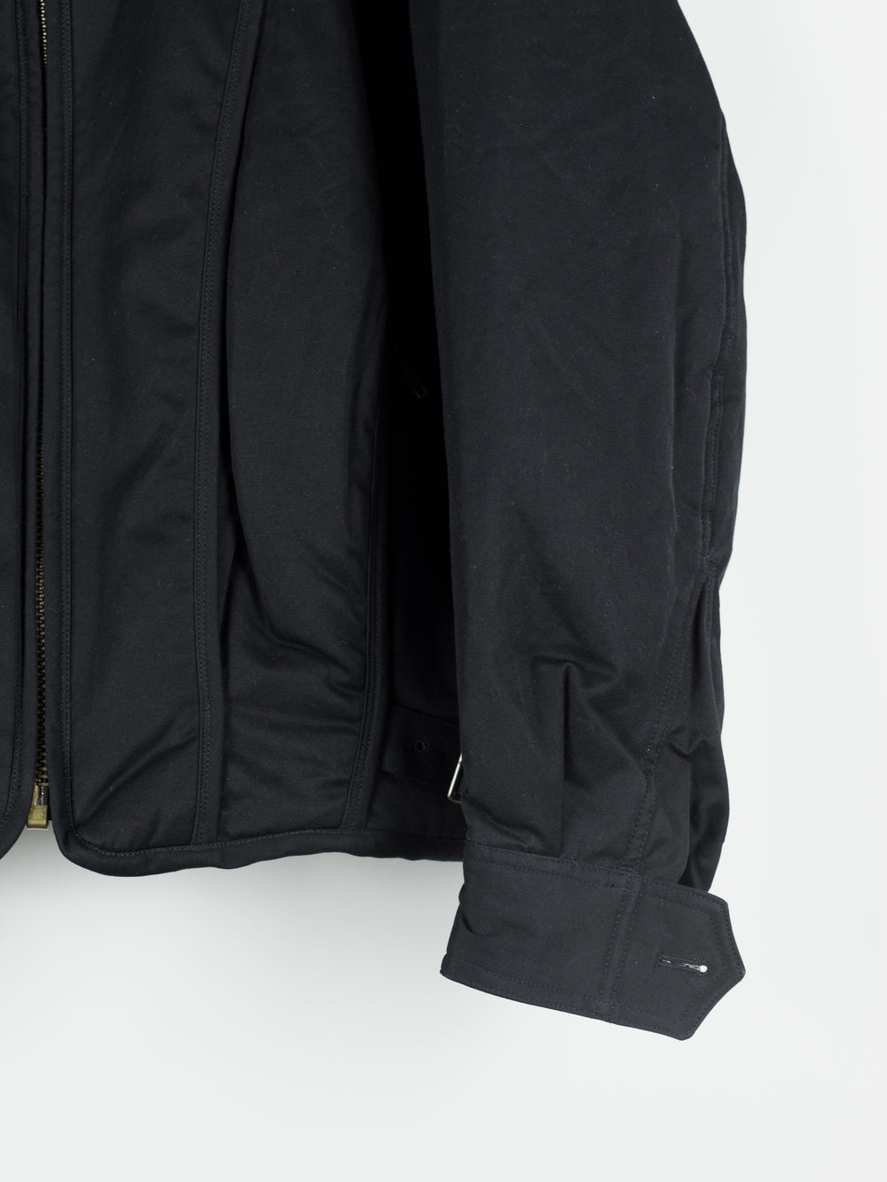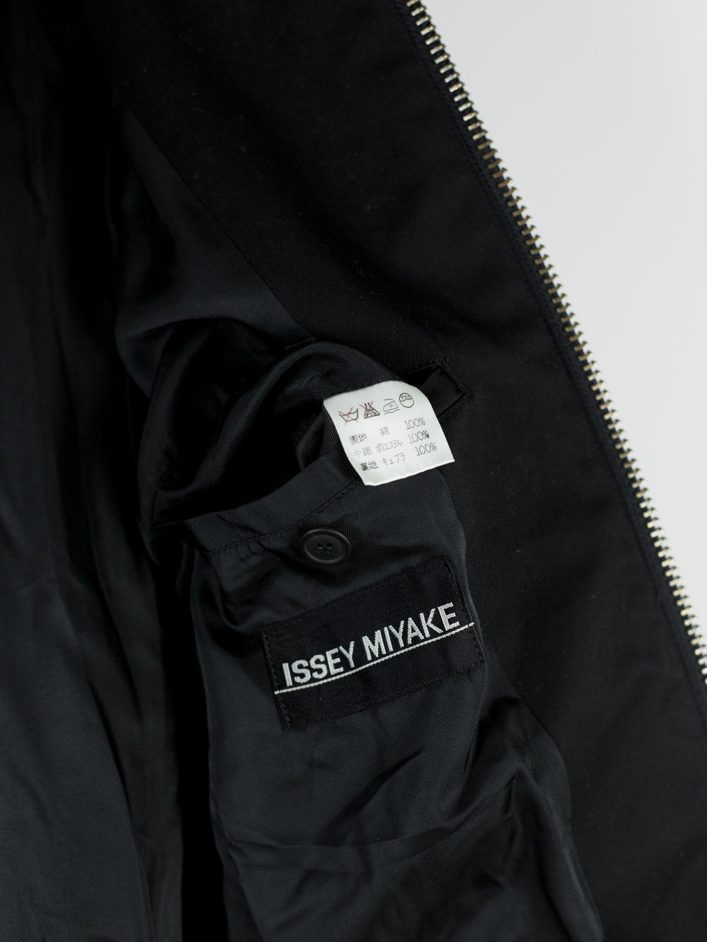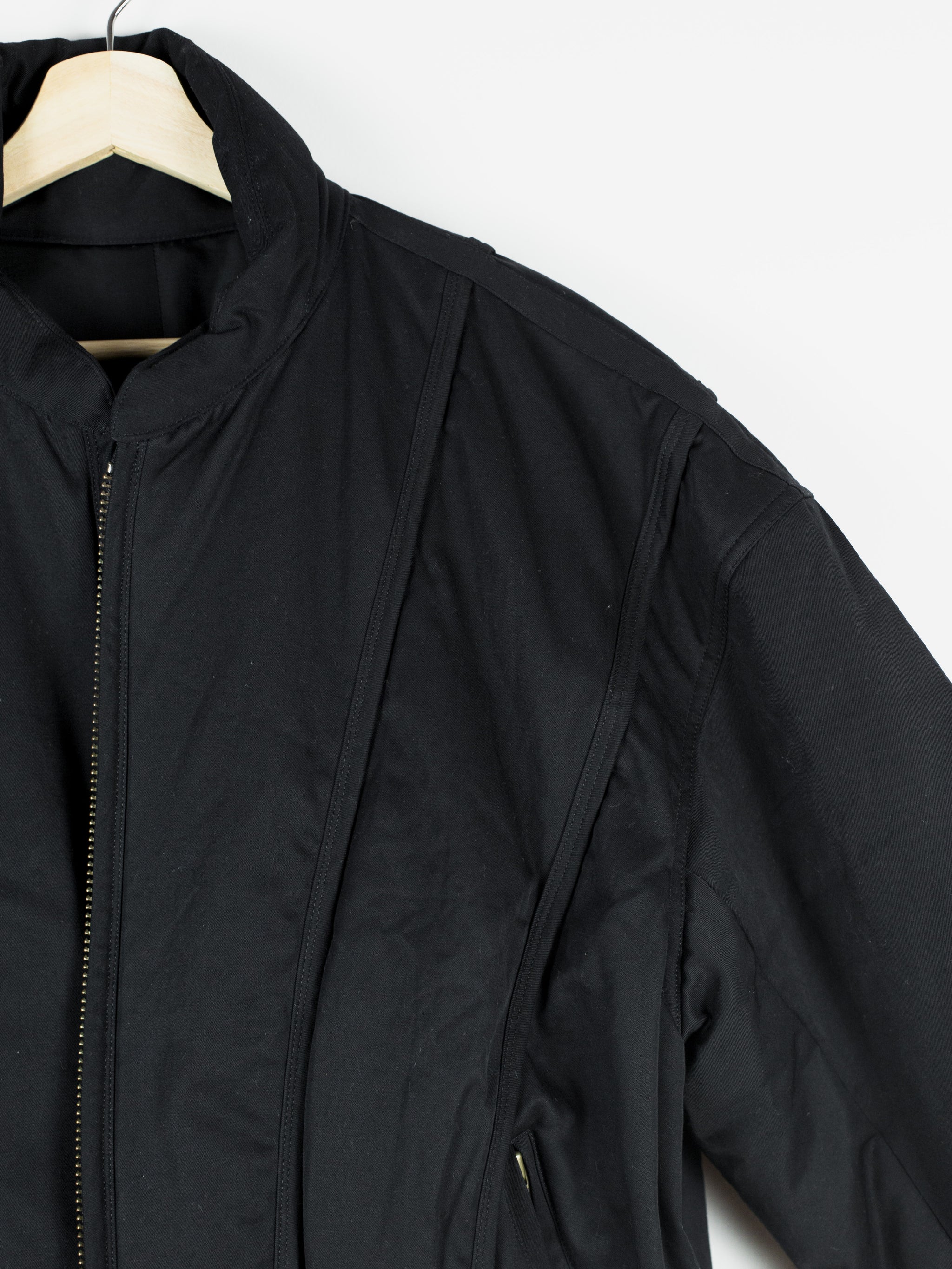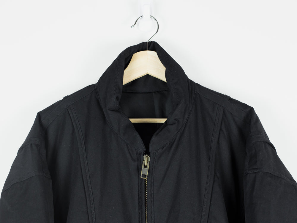 Padded cotton-face bomber by Issey Miyake. Made in the 90s with the signature boxy fit of the time period, this piece is punctuated by curved panelling details that give an otherwise plain jacket a decidedly moto aesthetic. Finished with mandarin-style stand collar, chunky brass-tone center front zip, belt adjusters, hidden elastic ribbing at waist, and button-close cuffs. Dense, smooth and windproof cotton on the surface, warm polyester fill with a silky smooth liner for easy on-off.