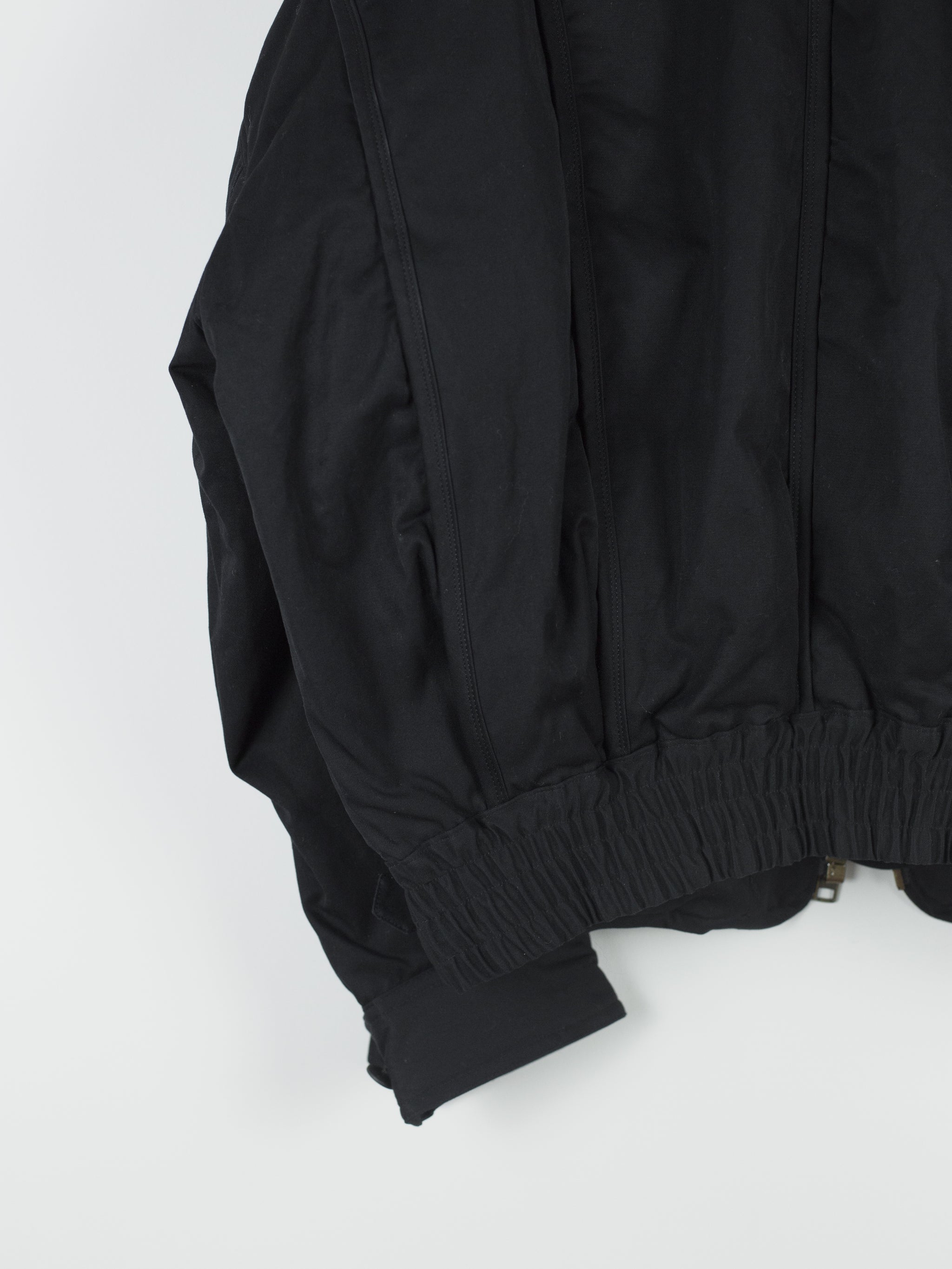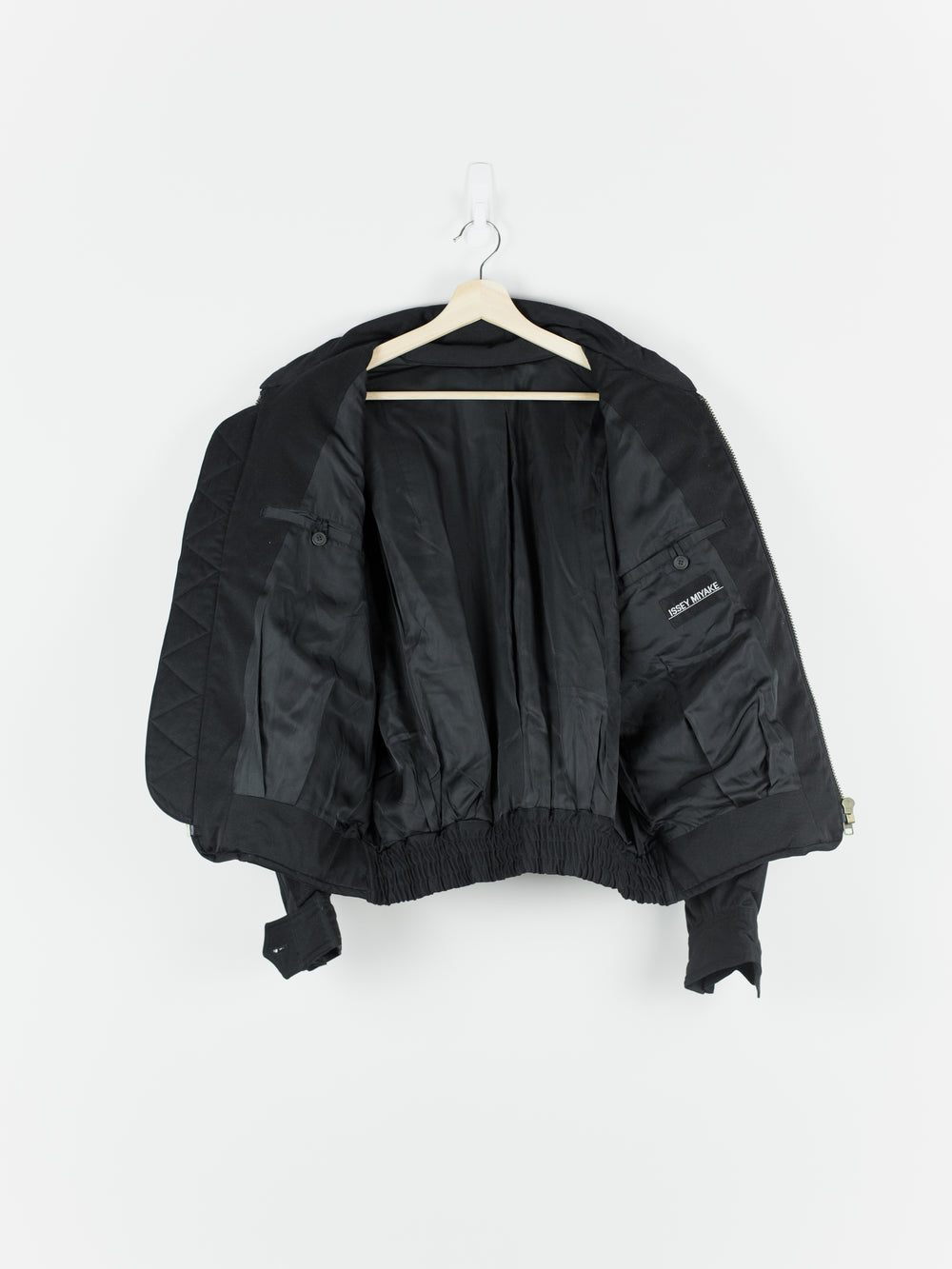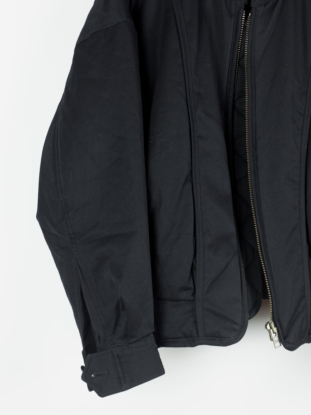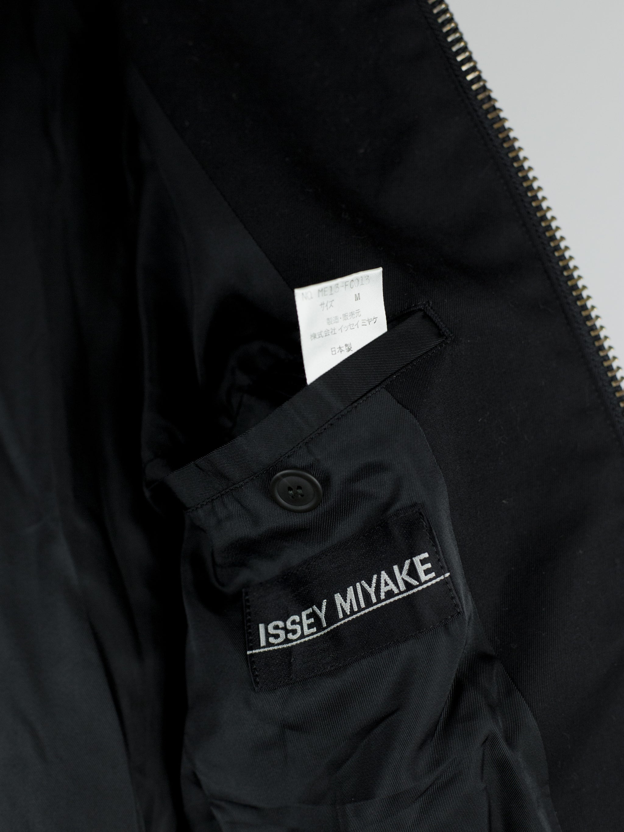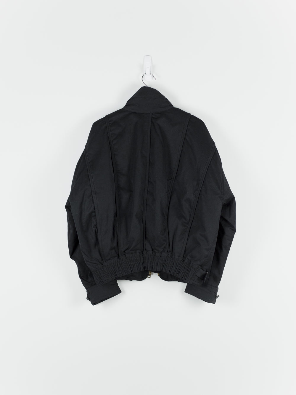 Padded cotton-face bomber by Issey Miyake. Made in the 90s with the signature boxy fit of the time period, this piece is punctuated by curved panelling details that give an otherwise plain jacket a decidedly moto aesthetic. Finished with mandarin-style stand collar, chunky brass-tone center front zip, belt adjusters, hidden elastic ribbing at waist, and button-close cuffs. Dense, smooth and windproof cotton on the surface, warm polyester fill with a silky smooth liner for easy on-off.