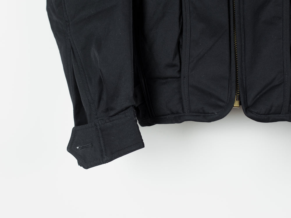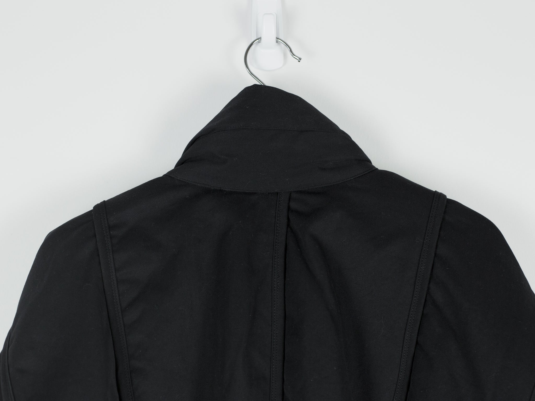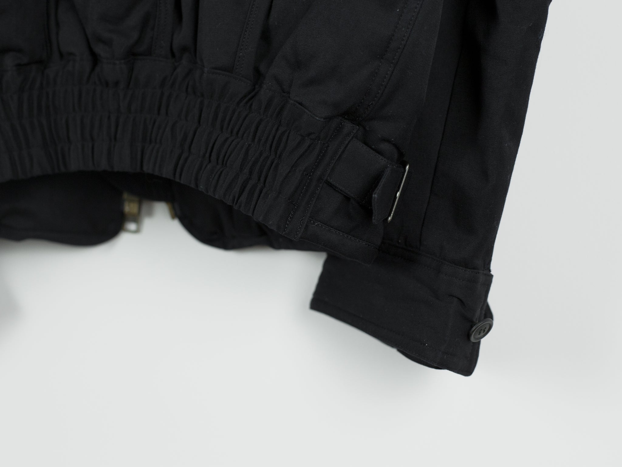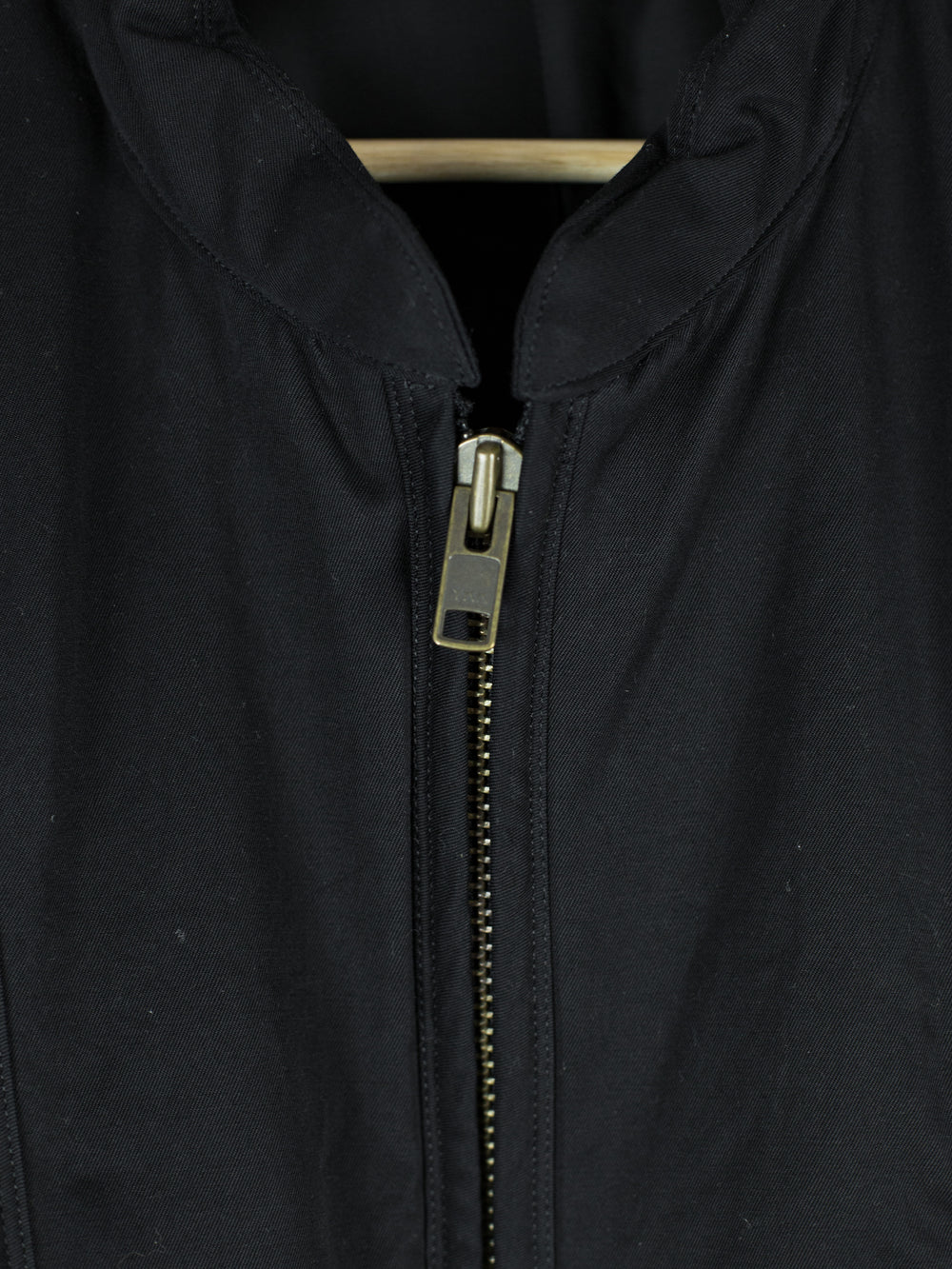 Padded cotton-face bomber by Issey Miyake. Made in the 90s with the signature boxy fit of the time period, this piece is punctuated by curved panelling details that give an otherwise plain jacket a decidedly moto aesthetic. Finished with mandarin-style stand collar, chunky brass-tone center front zip, belt adjusters, hidden elastic ribbing at waist, and button-close cuffs. Dense, smooth and windproof cotton on the surface, warm polyester fill with a silky smooth liner for easy on-off.