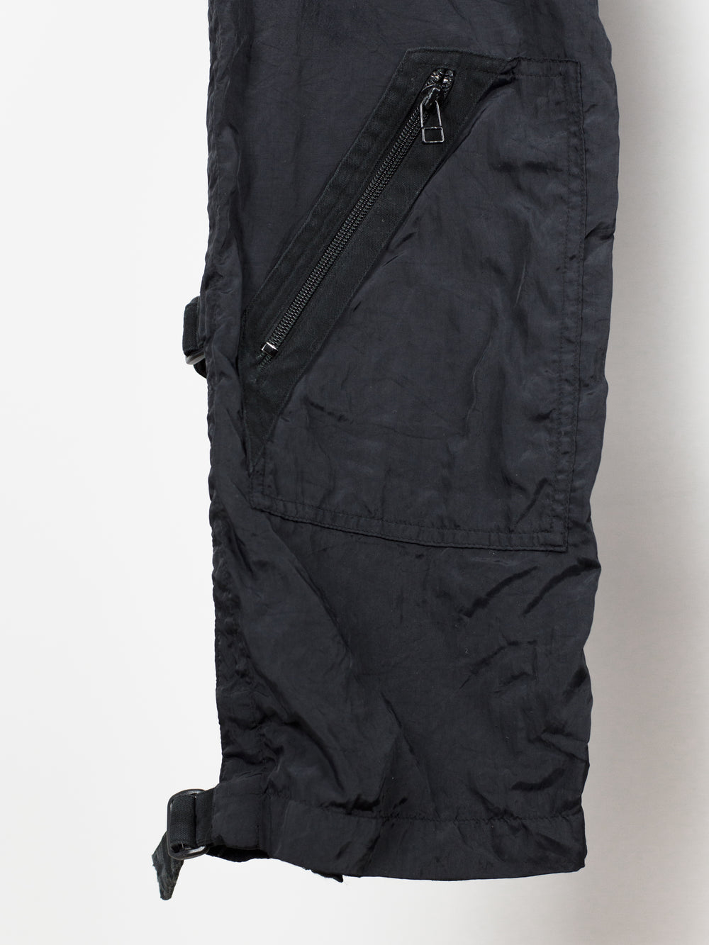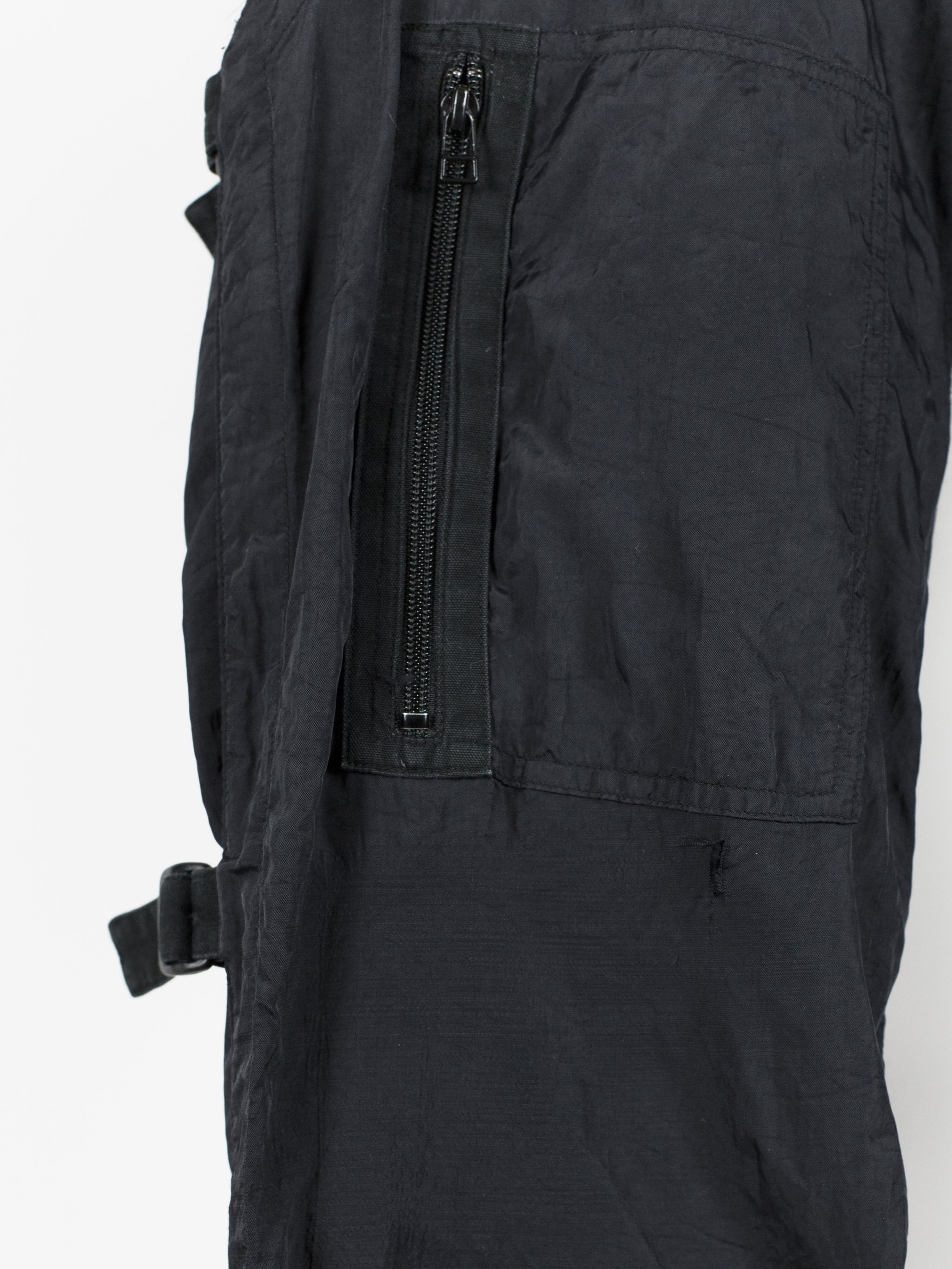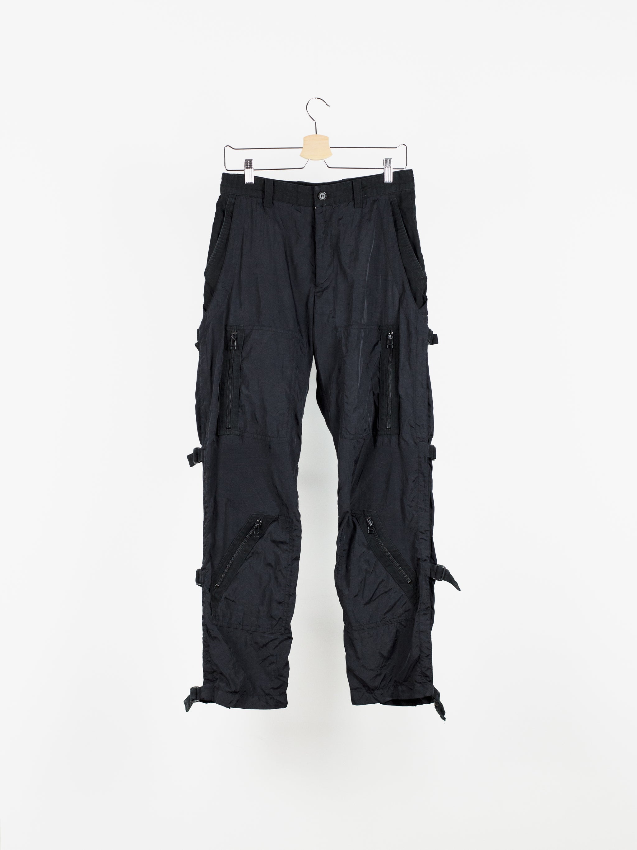 Statement nylon trousers from 90s Issey Miyake, featuring bondage strap secured outseam and fully constructed cotton inner 'pant' that extends to the knee. The crinkle nylon gives a technical finish but the inner cotton pant provides comfort and structure to the fit. The inner layer features lateral entry slash pockets on both the front and back, with the shape being mirrored by the nylon outer shell for a tiered layered look. Down the leg are 4 zippered patch pockets arranged similarly to vintage military aviator cargos. Slim straight cut with adjustable leg thanks to the straps.
