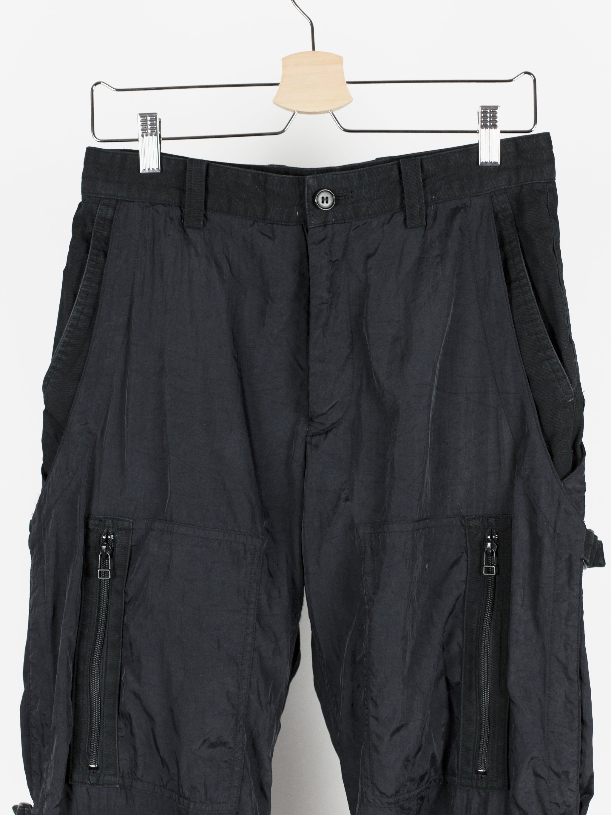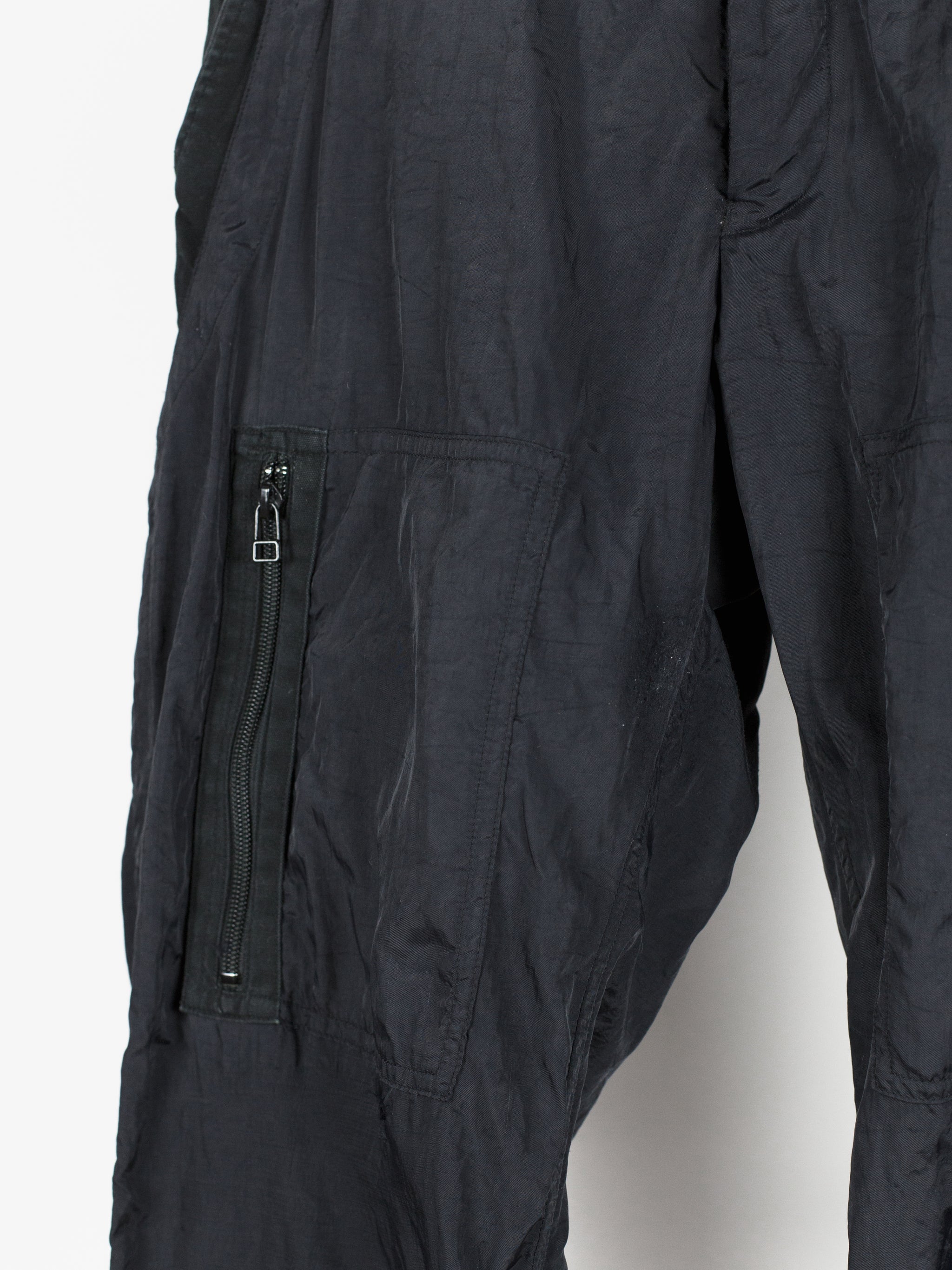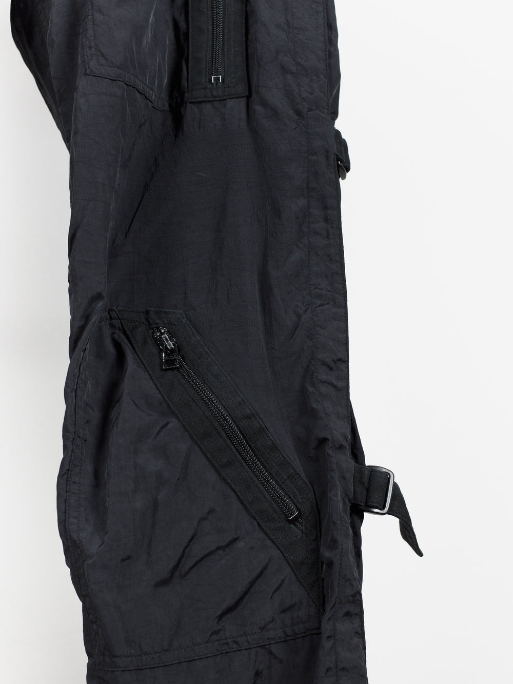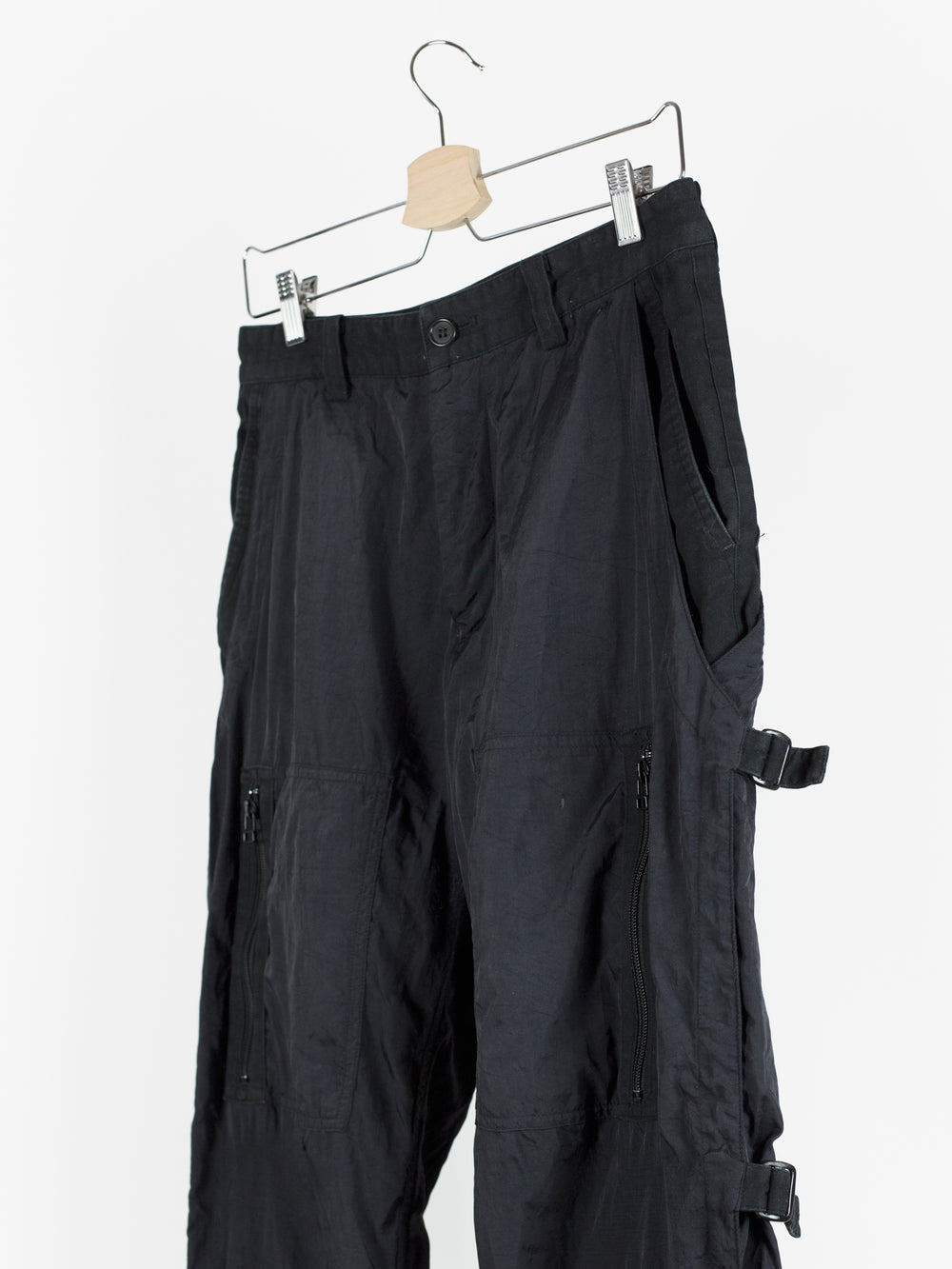Statement nylon trousers from 90s Issey Miyake, featuring bondage strap secured outseam and fully constructed cotton inner 'pant' that extends to the knee. The crinkle nylon gives a technical finish but the inner cotton pant provides comfort and structure to the fit. The inner layer features lateral entry slash pockets on both the front and back, with the shape being mirrored by the nylon outer shell for a tiered layered look. Down the leg are 4 zippered patch pockets arranged similarly to vintage military aviator cargos. Slim straight cut with adjustable leg thanks to the straps.