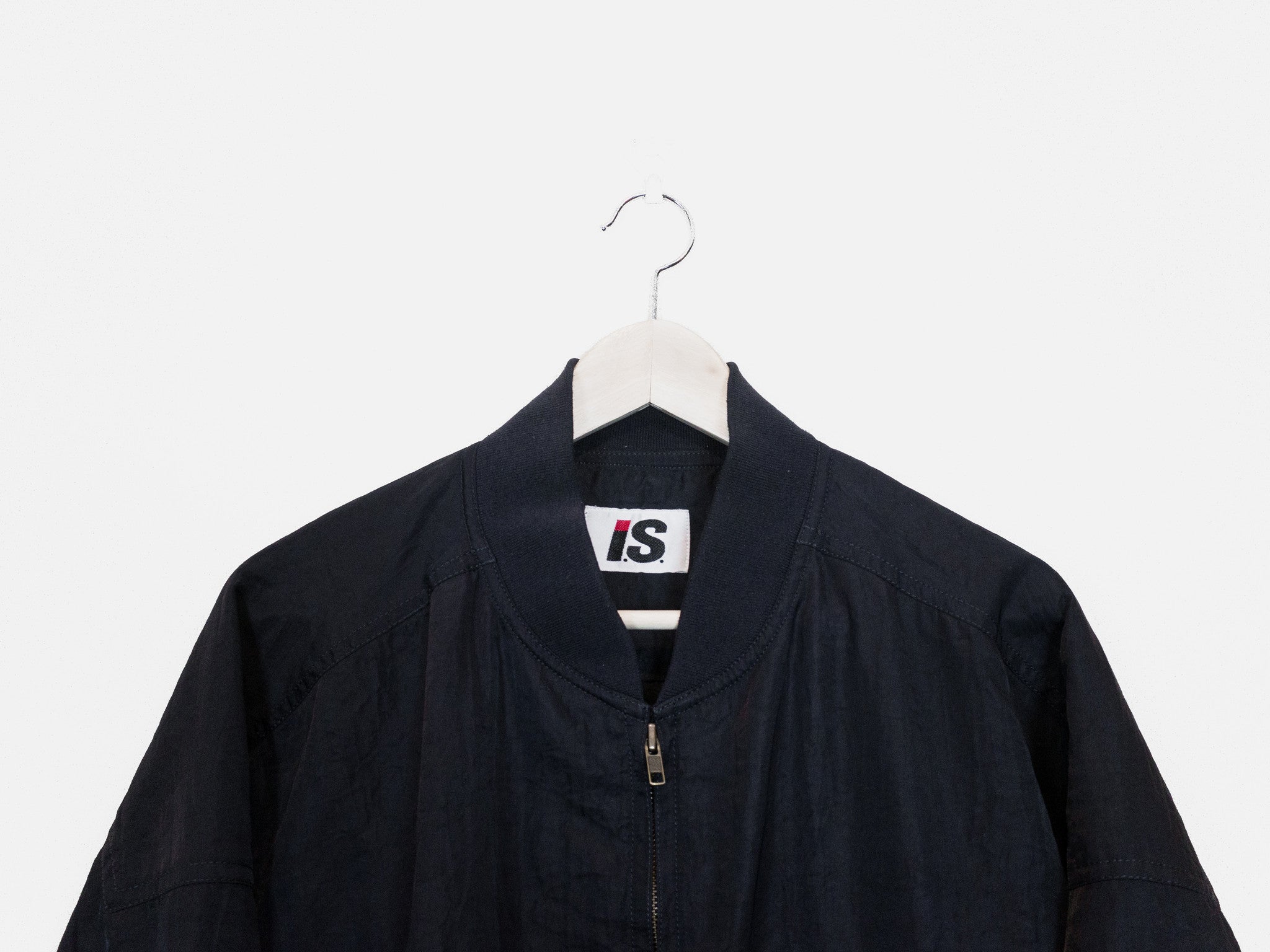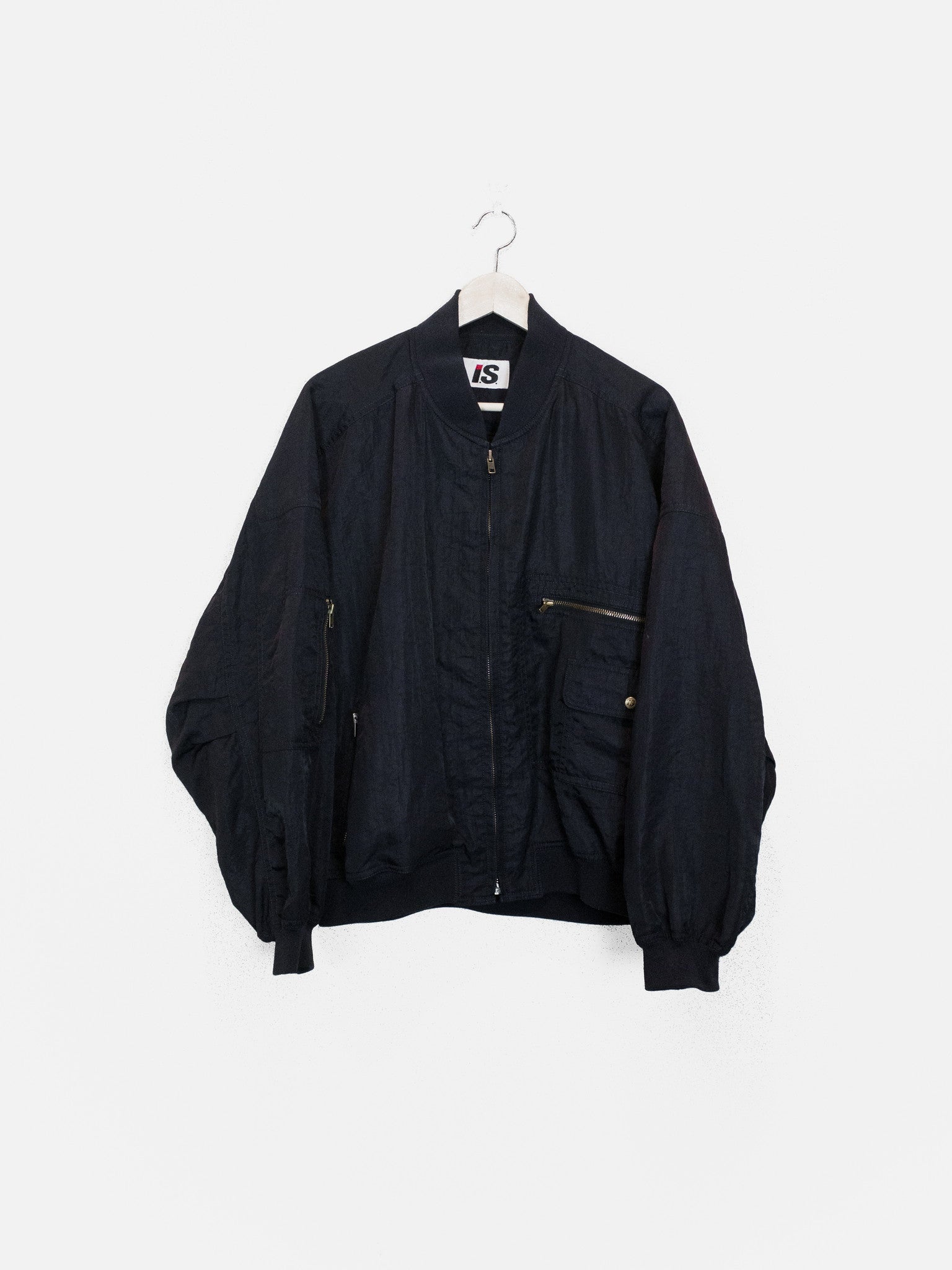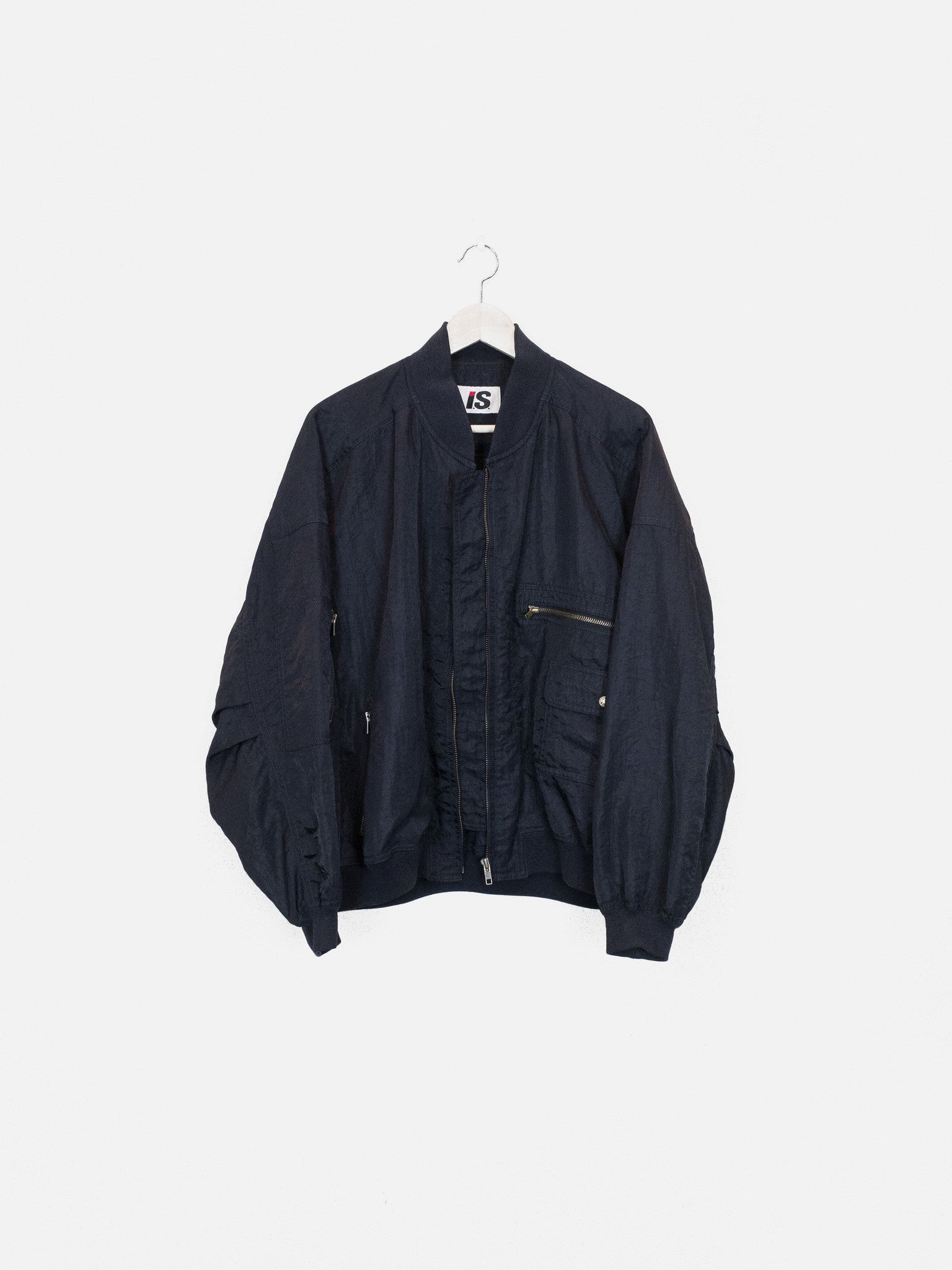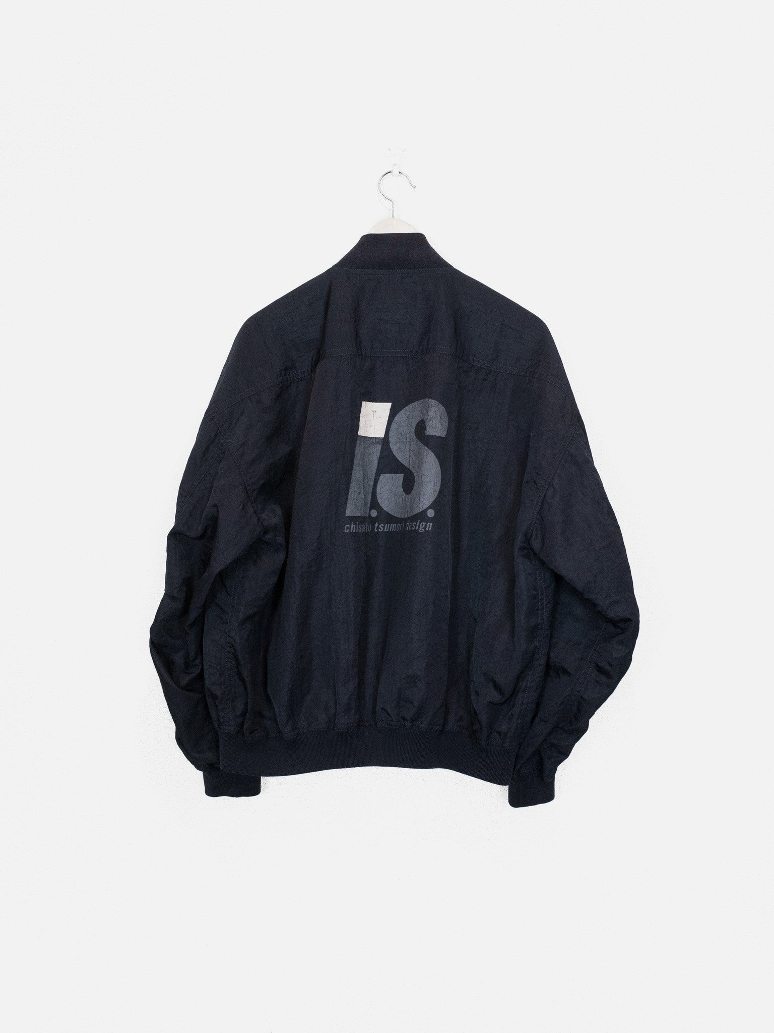 The popular 1984 Issey Sport Stadium Bomber by Tsumori Chisato. This one features a crinkle nylon blend fabric in a dark night/navy color and a gray “I.S.” logo on the back.