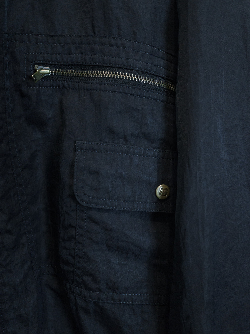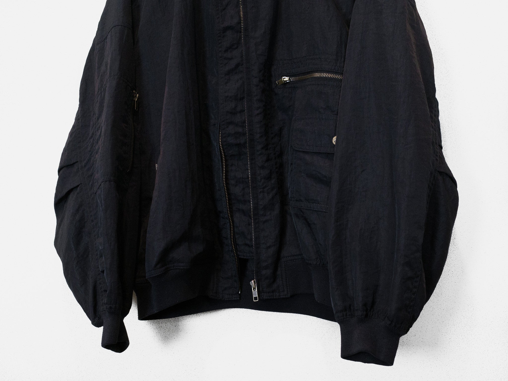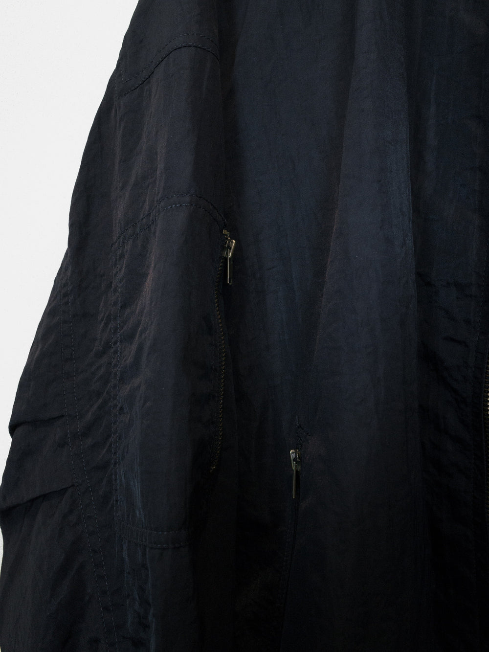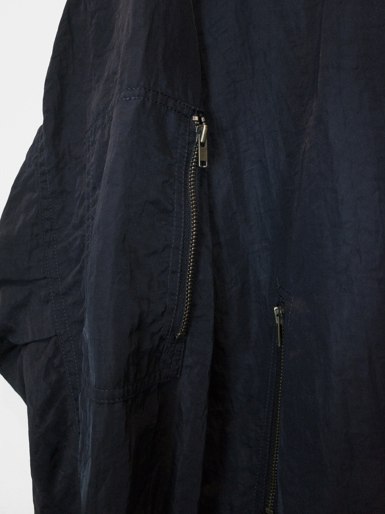 The popular 1984 Issey Sport Stadium Bomber by Tsumori Chisato. This one features a crinkle nylon blend fabric in a dark night/navy color and a gray “I.S.” logo on the back.