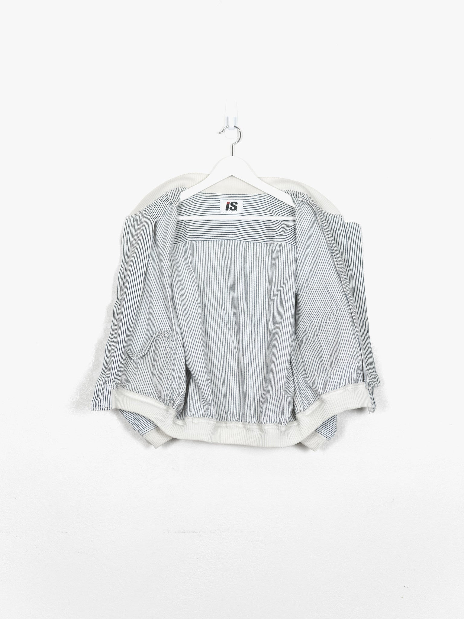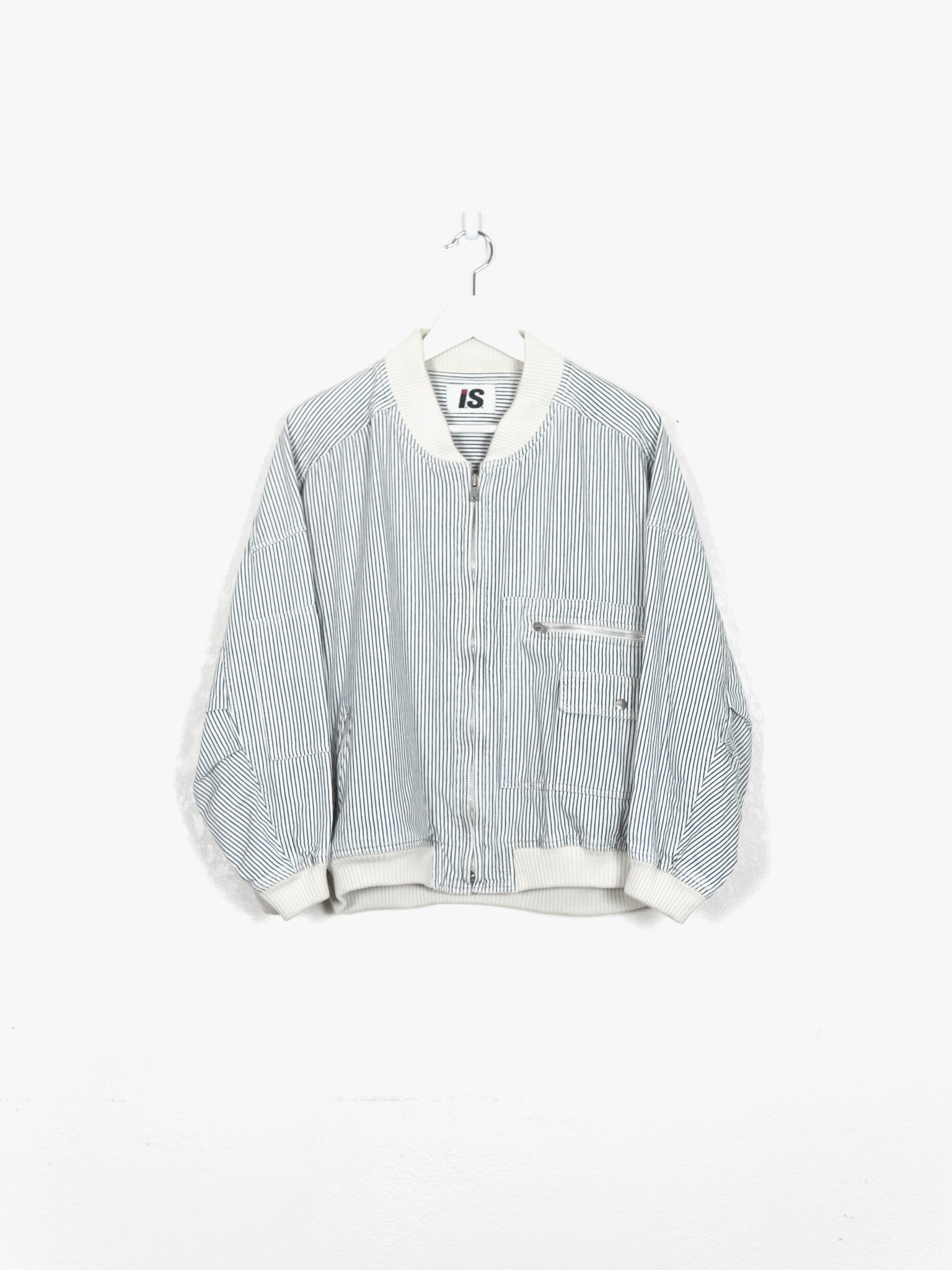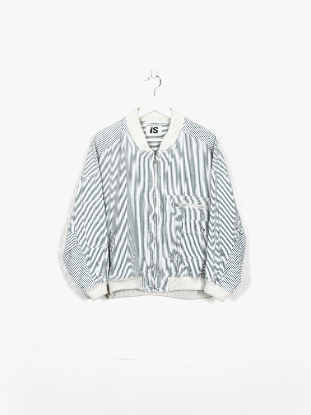 The legendary 1980's Issey Sport bomber designed by Tsumori Chisato in a navy pinstripe white cotton canvas!!! Amazing silhouette with all the MA-1 details from the wind flap to the sleeve pocket, plus front pockets. Made in Japan.