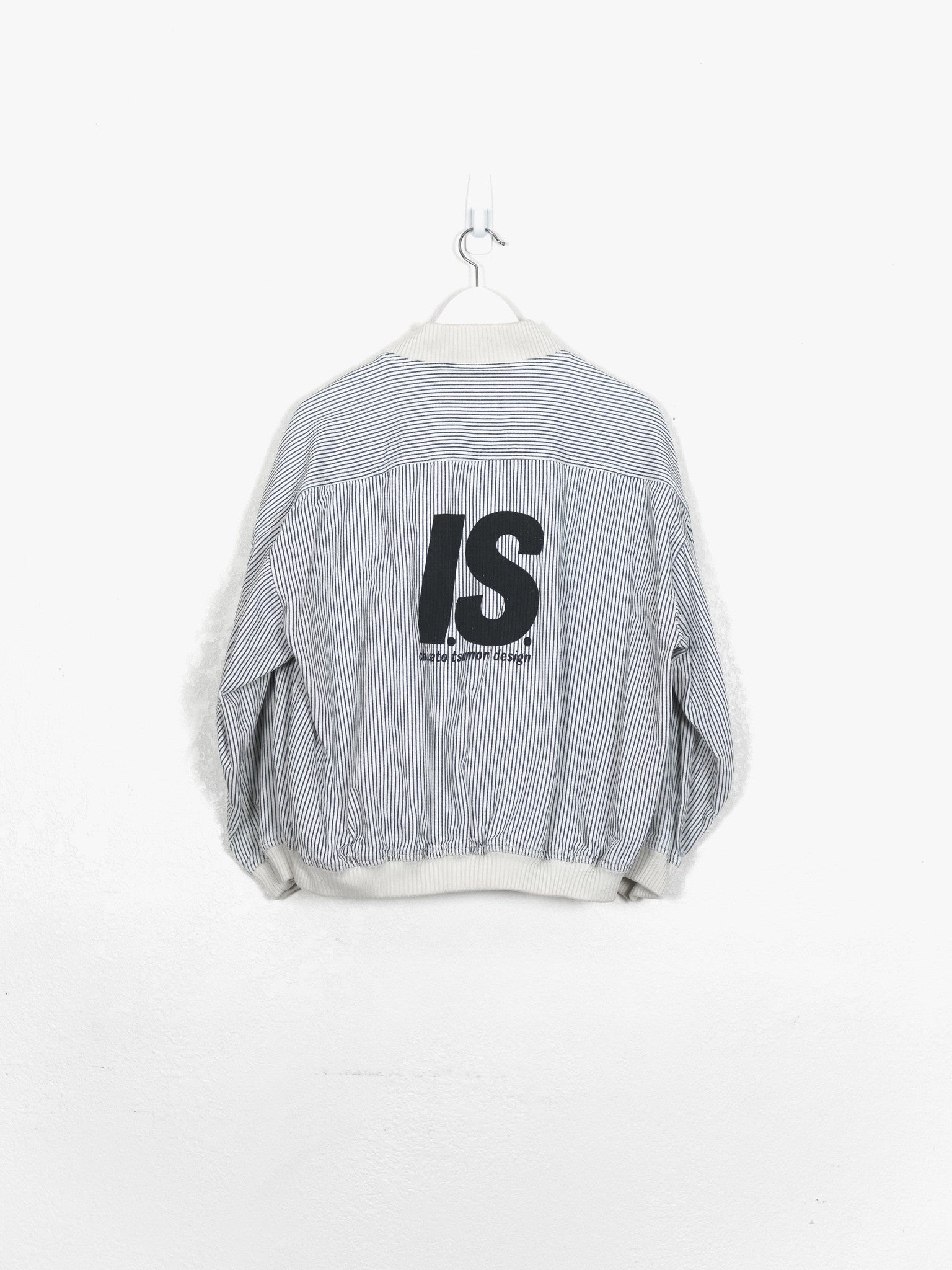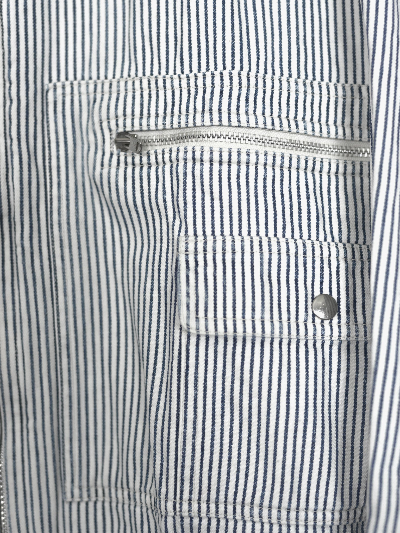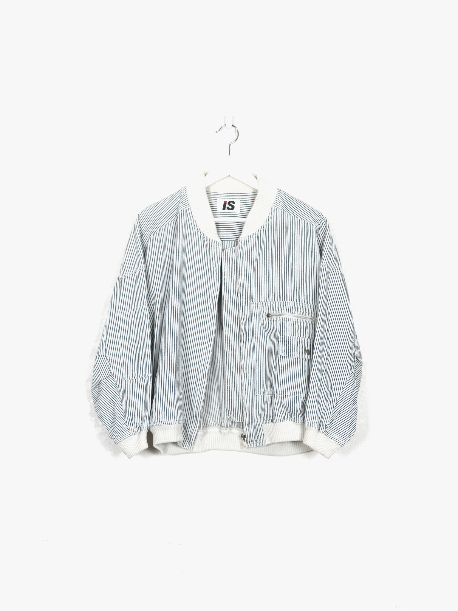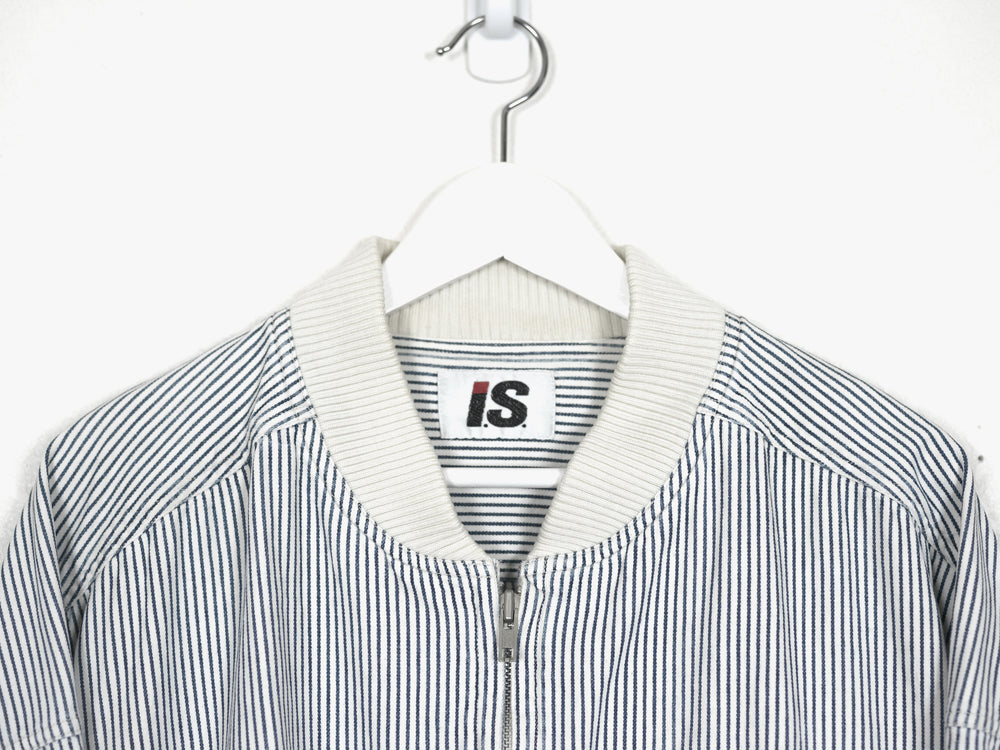 The legendary 1980's Issey Sport bomber designed by Tsumori Chisato in a navy pinstripe white cotton canvas!!! Amazing silhouette with all the MA-1 details from the wind flap to the sleeve pocket, plus front pockets. Made in Japan.