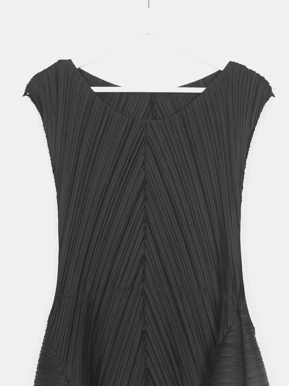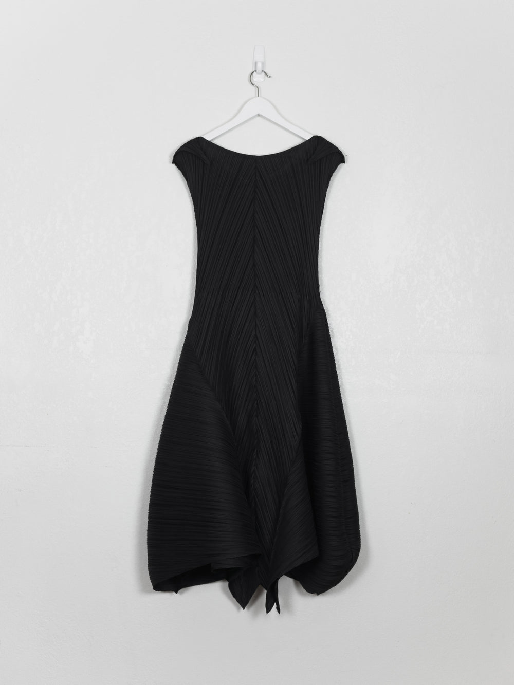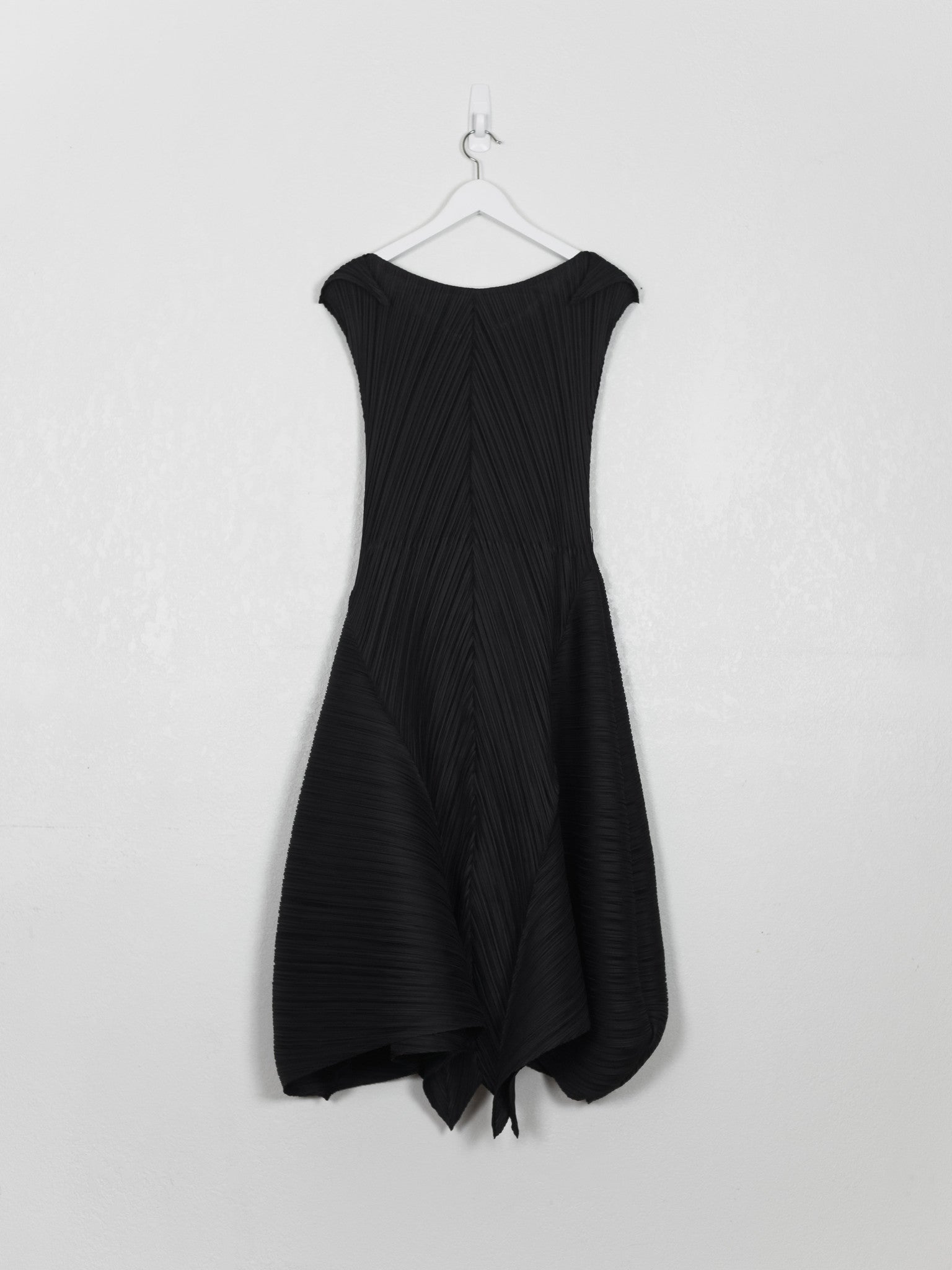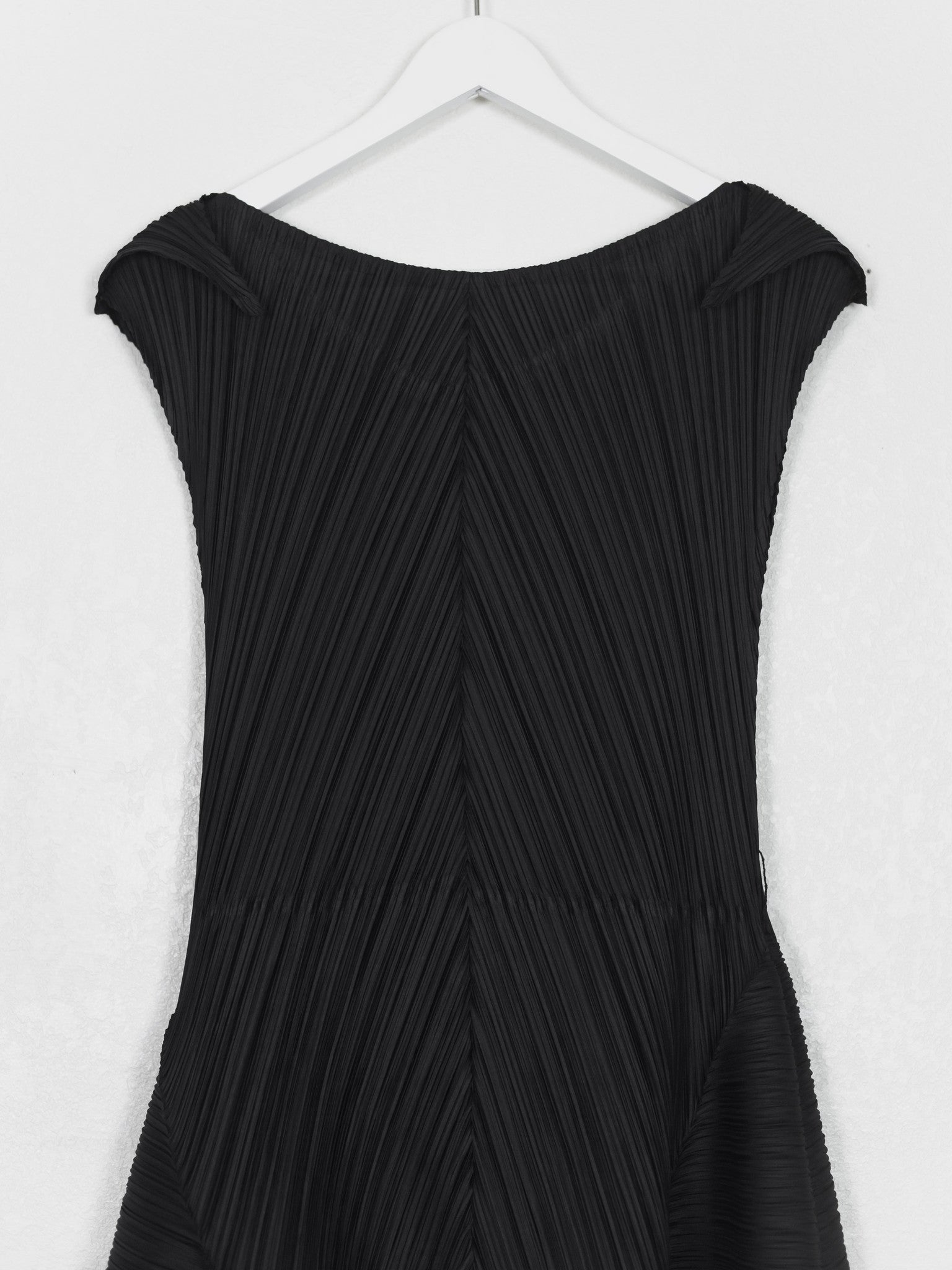 An absolutely beautiful dress from Issey Miyake Pleats Please with an elegant and avant garde cut allowing it to drape and flow organically as the wearer moves. The tags have been removed so that it can be worn inside out, but I guarantee that this is a genuine Issey Miyake piece. The proprietary elasticity and drape of the pleats is irreproducible.