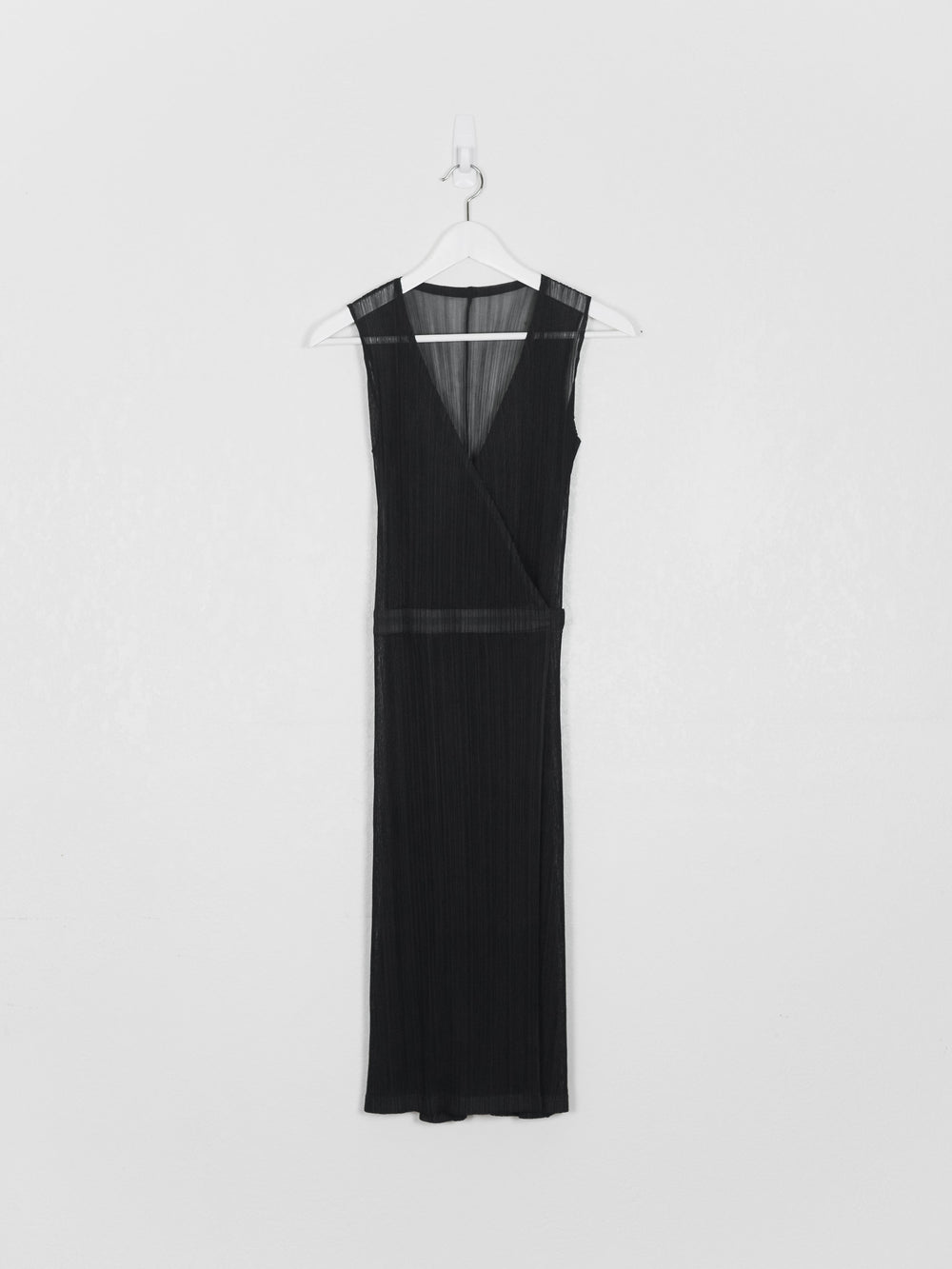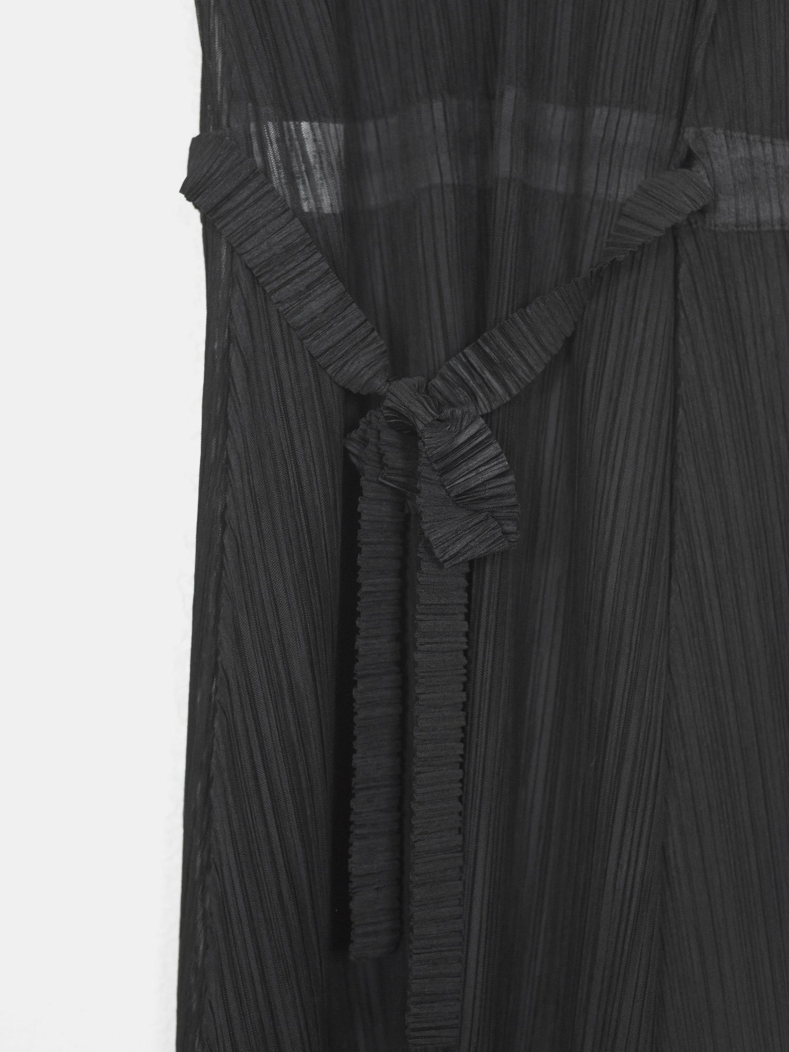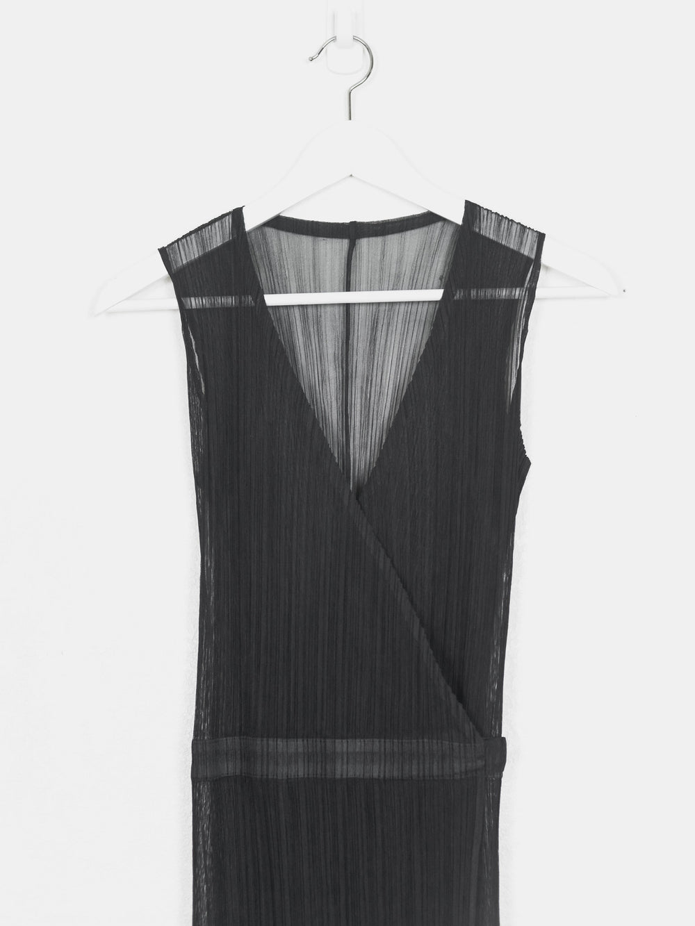 Intricate wrap dress composed of a sheer fabric, highlighting all the overlapping layers and moiré of the famous Issey pleats.