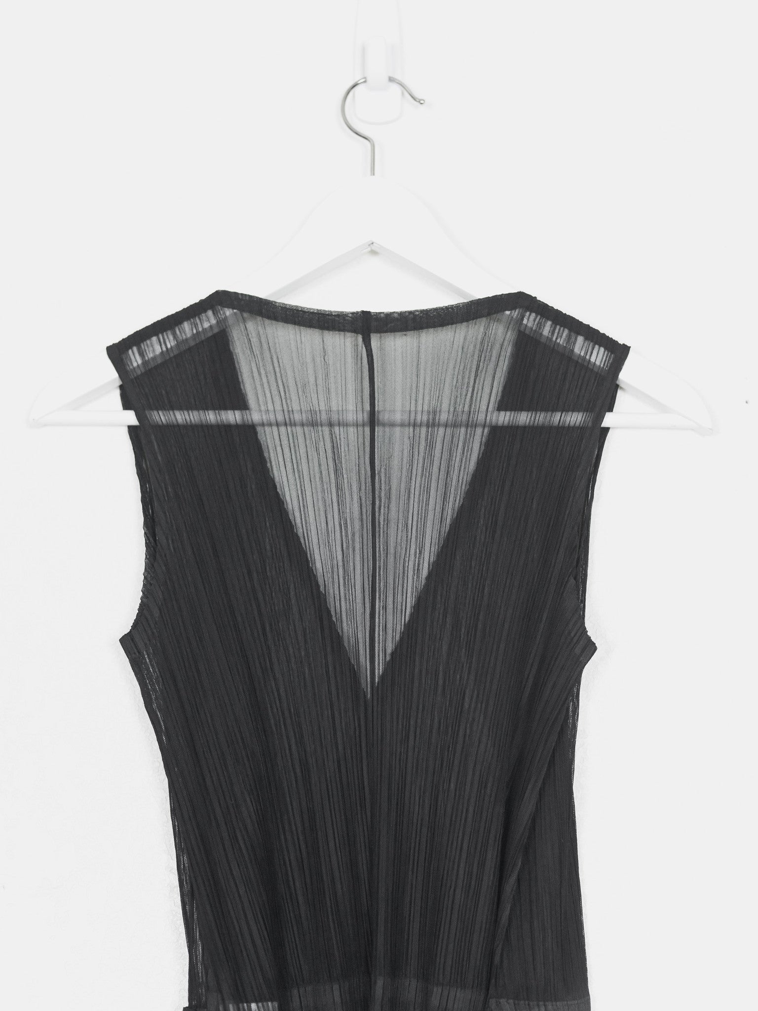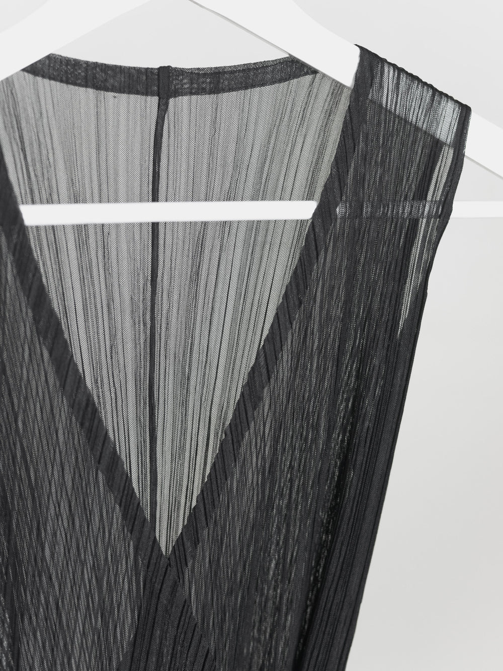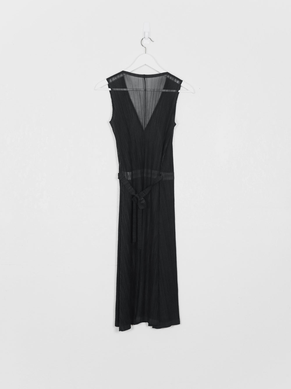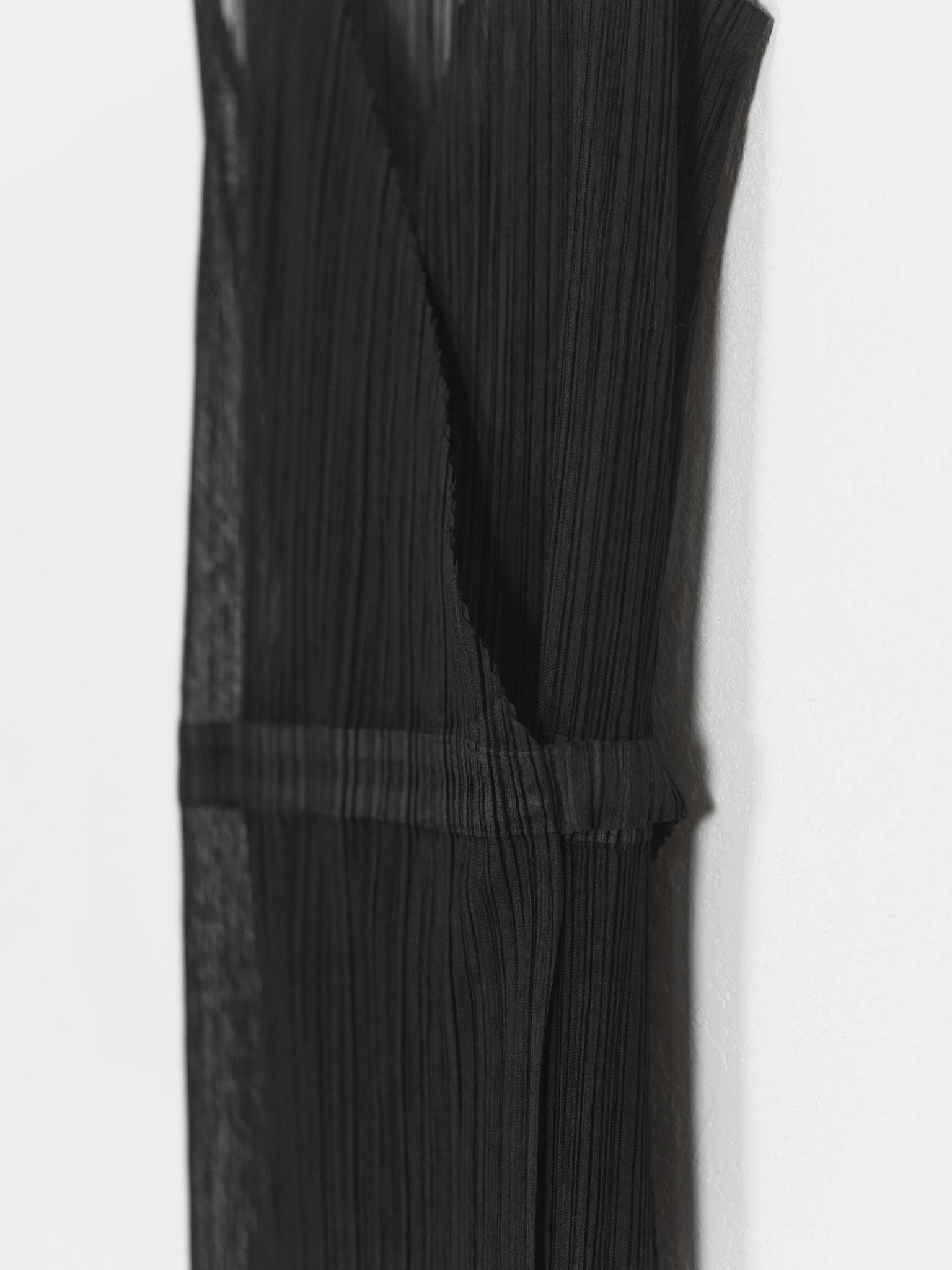 Intricate wrap dress composed of a sheer fabric, highlighting all the overlapping layers and moiré of the famous Issey pleats.