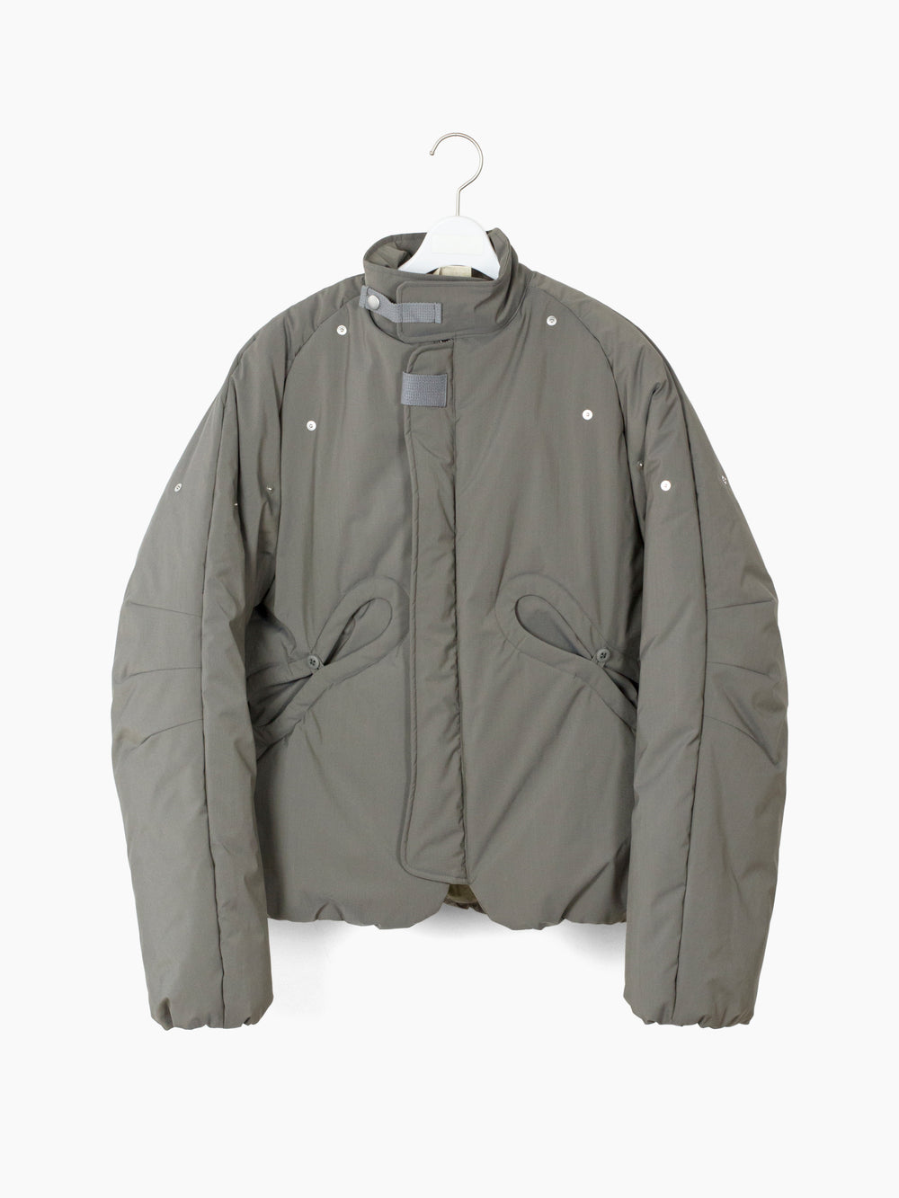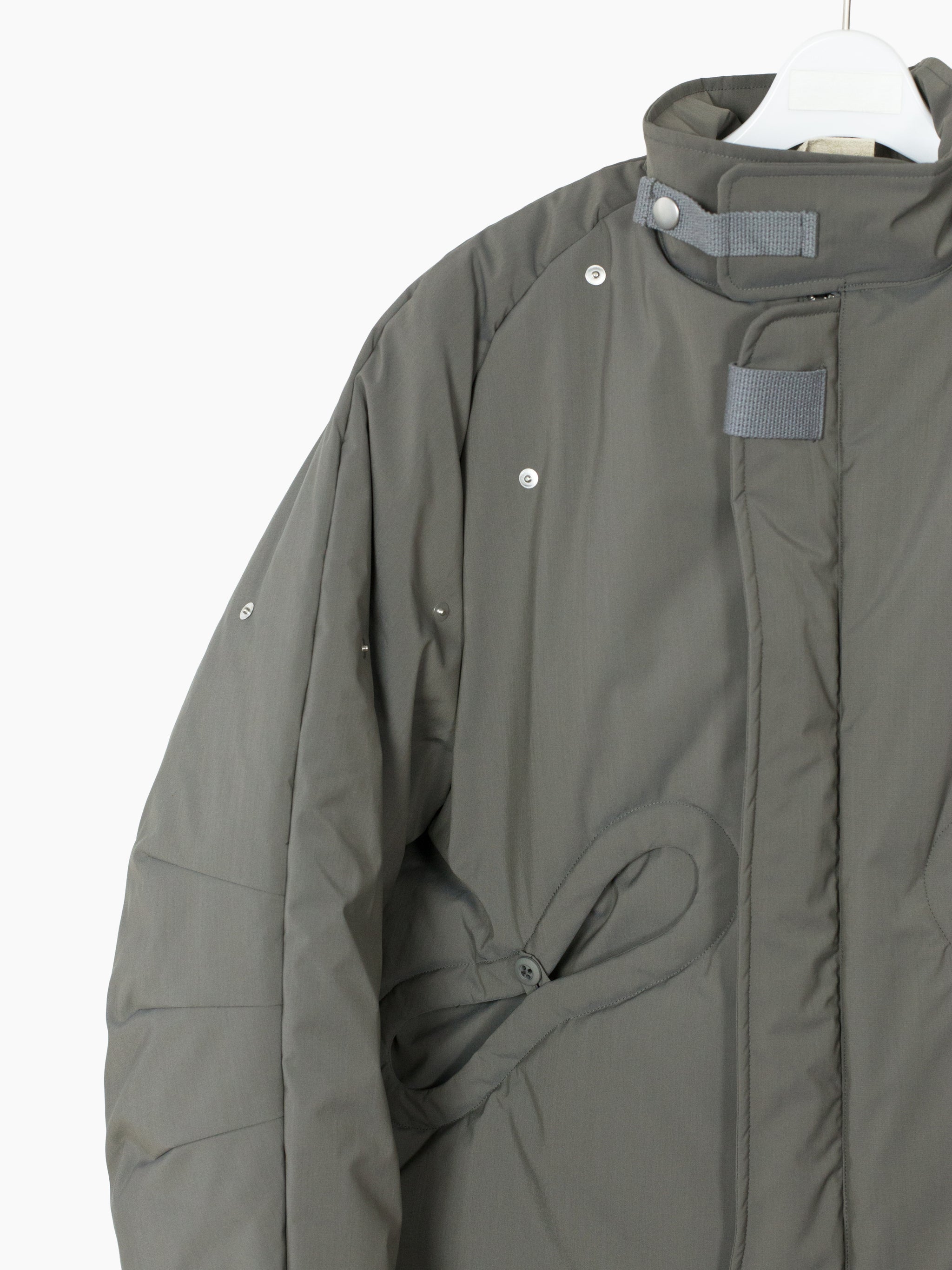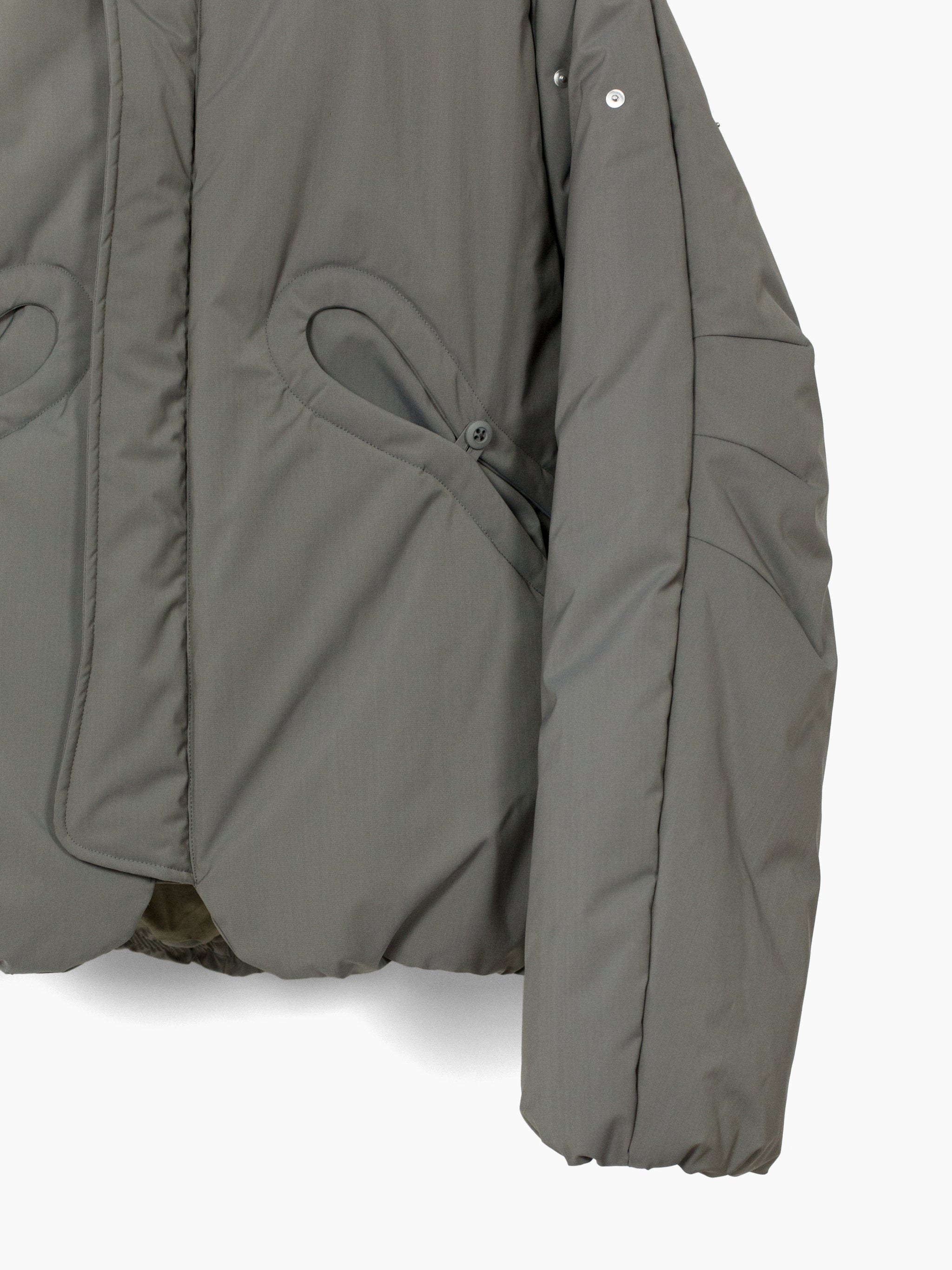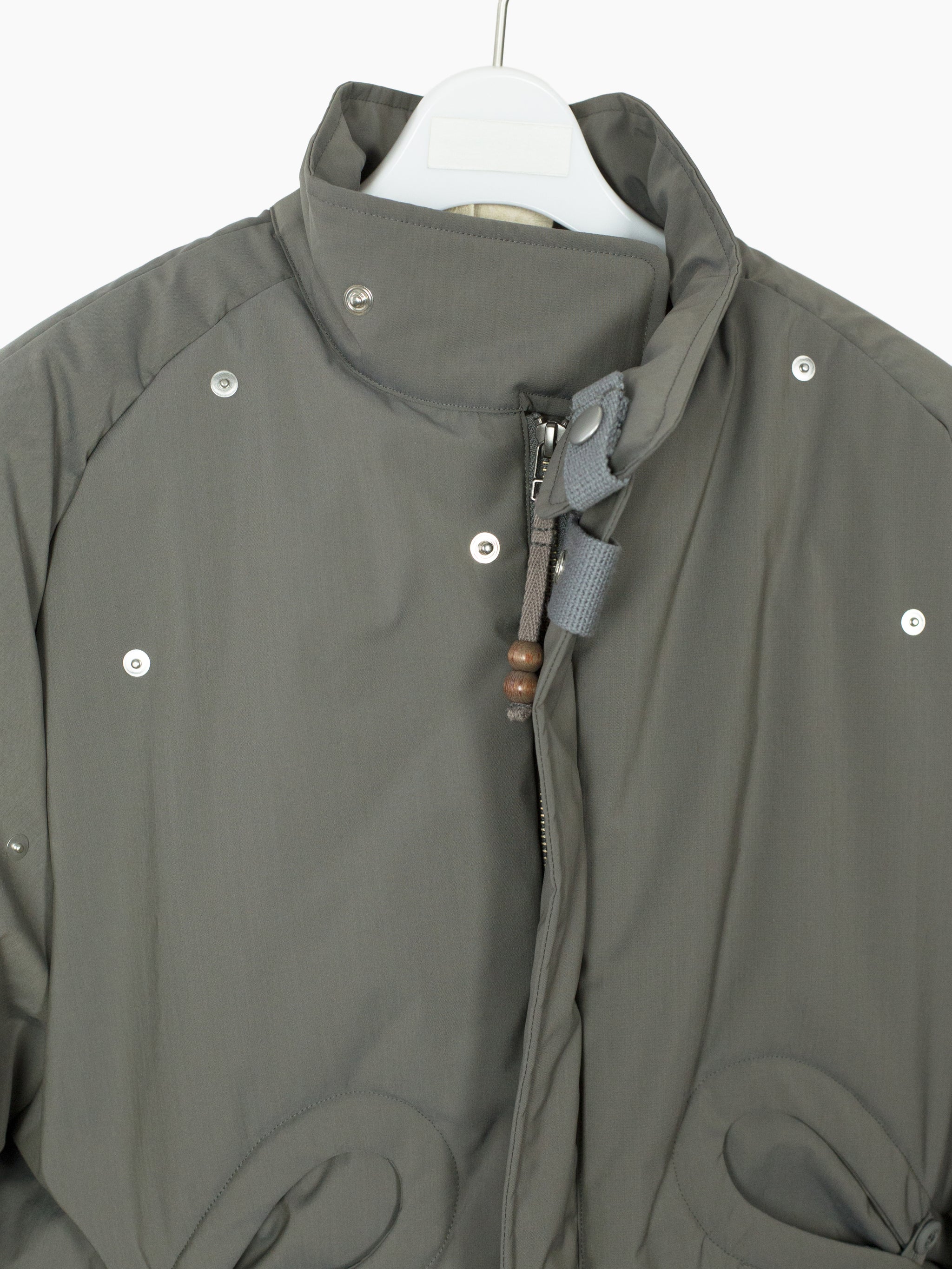 70/30 performance wool/poly face fabric, tightly woven with a fine smooth hand. subtle iridescent finish shifts between cooler and warmer toned grey. Radial darts at neck and hem serve as both ornamental and tectonic detail. Elasticated hem and cuff are turned inwards and hidden, for a clean finish. center-button pocket closure pulls rounded openings into namesake 'gourd' shape.