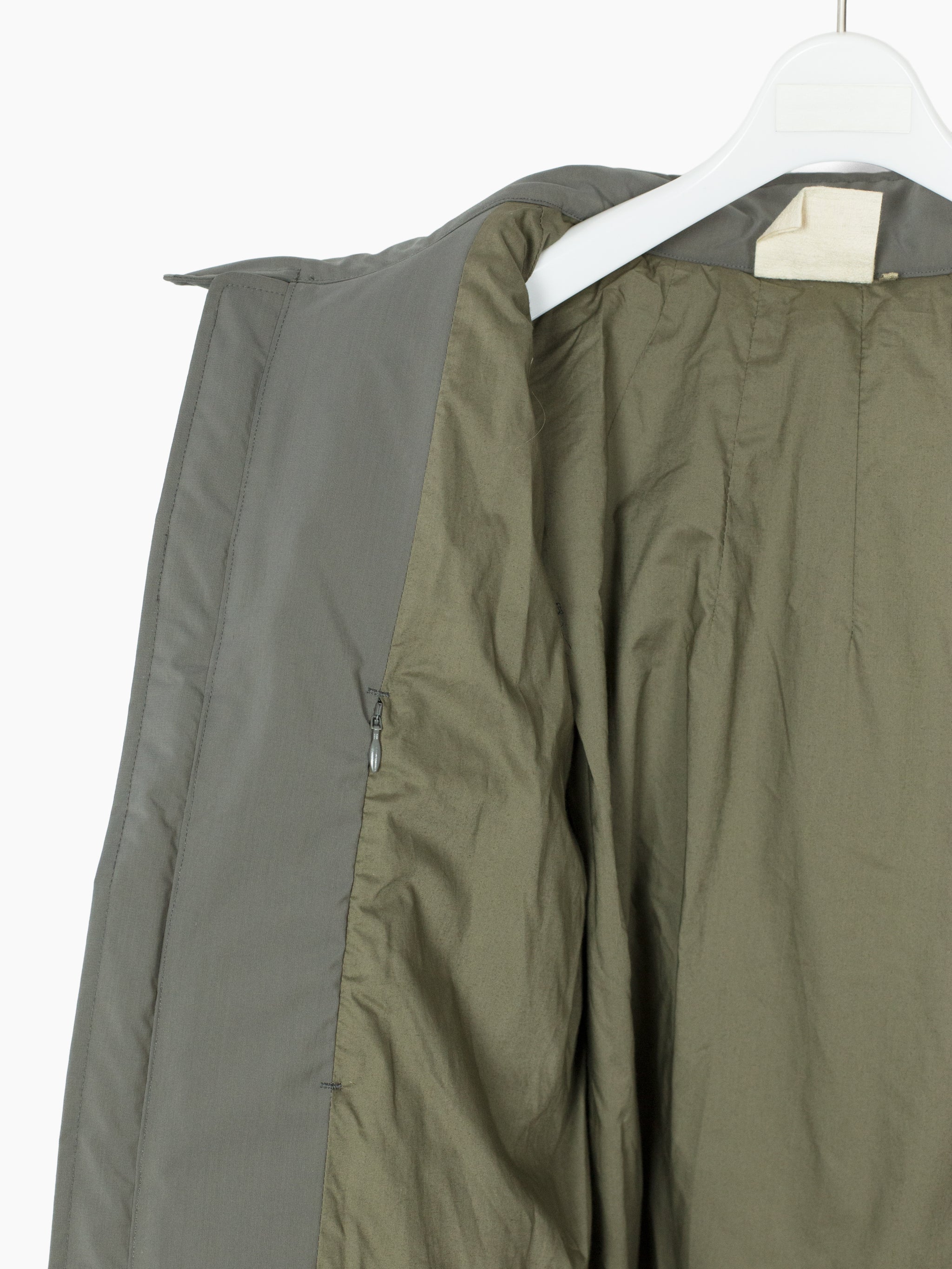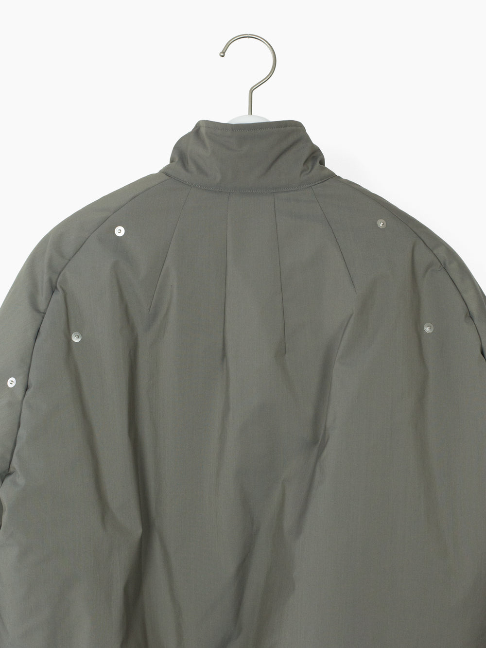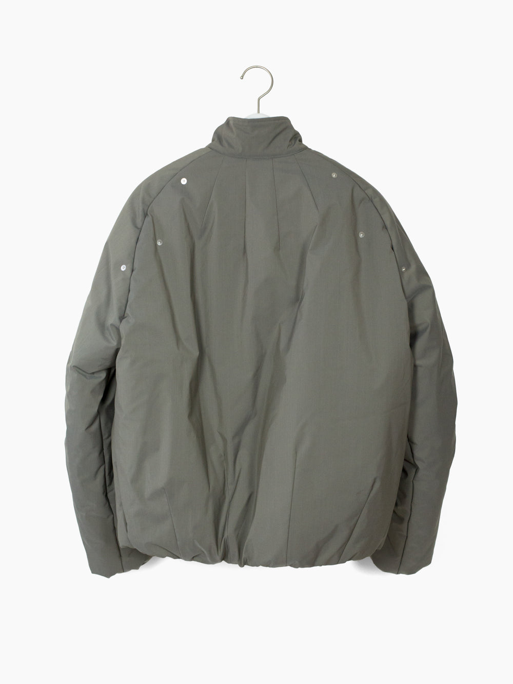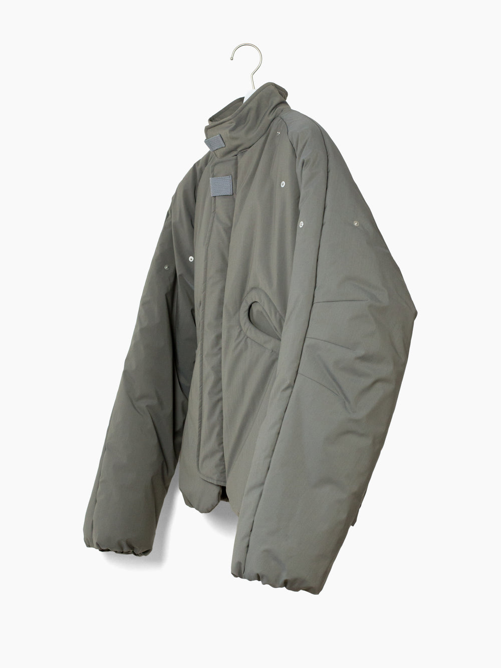 70/30 performance wool/poly face fabric, tightly woven with a fine smooth hand. subtle iridescent finish shifts between cooler and warmer toned grey. Radial darts at neck and hem serve as both ornamental and tectonic detail. Elasticated hem and cuff are turned inwards and hidden, for a clean finish. center-button pocket closure pulls rounded openings into namesake 'gourd' shape.